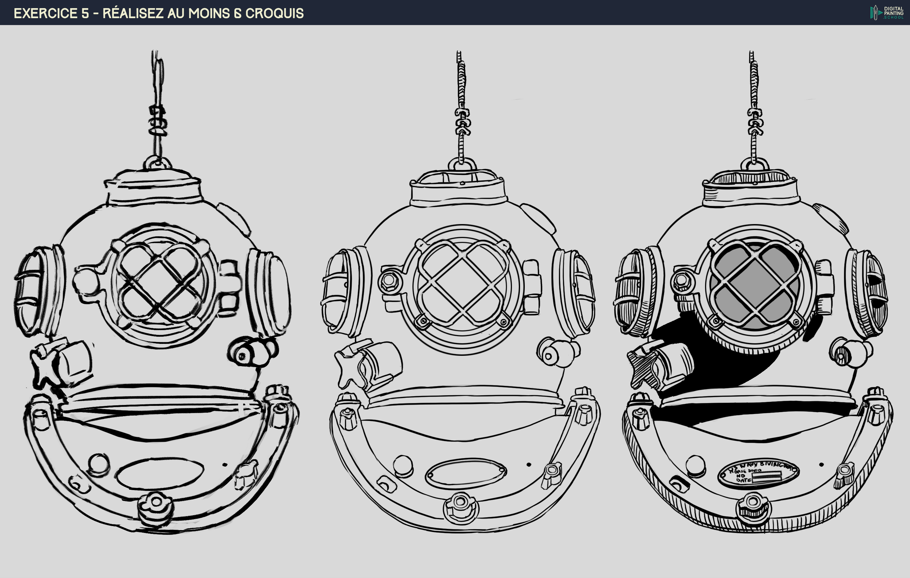 Après un certains temps de réalisation des exercices, je poste enfin mes dessins ! Ce fut intense et long mais j'ai put bien comprendre l'utilité des règles lors de leurs réalisations, les quelques points qui ont put me poser c'est problème c'est la gestion de mon temps où j'ai eu tendance à vouloir trop bien faire et ne pas réussir à avancer plus vite, notamment le scaphandrier et le bâtiment qui m'ont pris beaucoup de temps ! J'ai vu l'évolution de mon épaisseur de trait au cours des exercices s'améliorer bien que je pense qu'il puisse encore être amélioré. J'ai hâte d'enfin passer à l'exercice 6 !