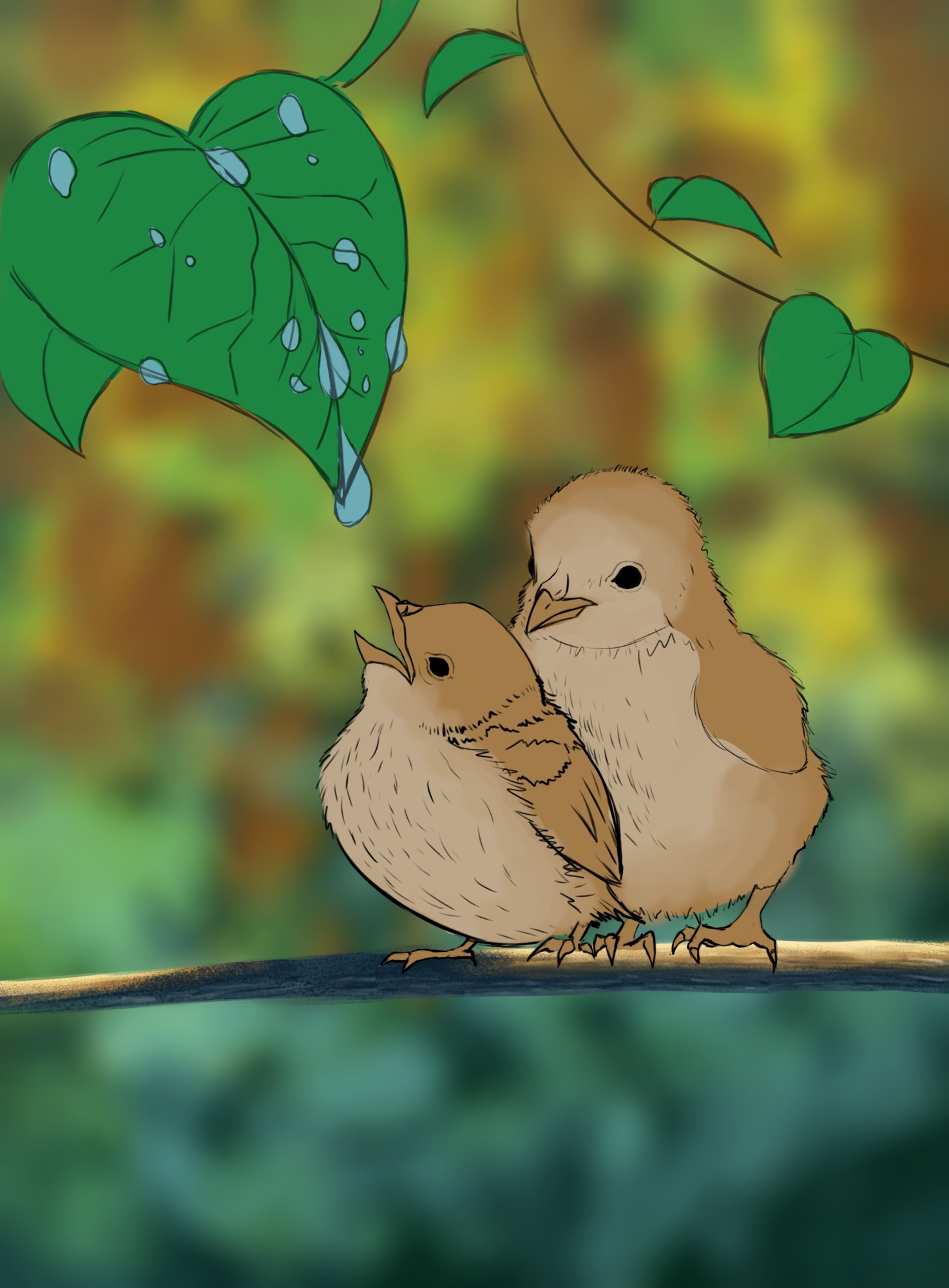 Hello ! Voici l'illustration des oisillons, je n'ai pas encore eu le temps de faire tout les autres exercices mais je voulais avancer et finir au moins les oiseaux. Je risque de prendre quelques libertés pour cette illu au niveau des couleurs notamment, j'arrive pas à m'en empêcher. Mais évidemment n'hésitez pas si vous avez des remarques ou autres, je prend tous les conseils ! 🙂