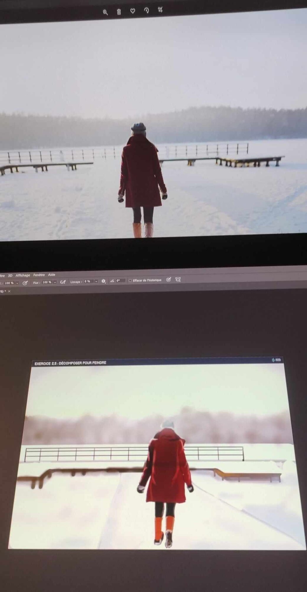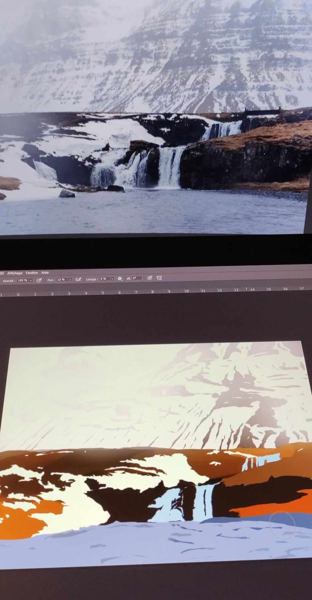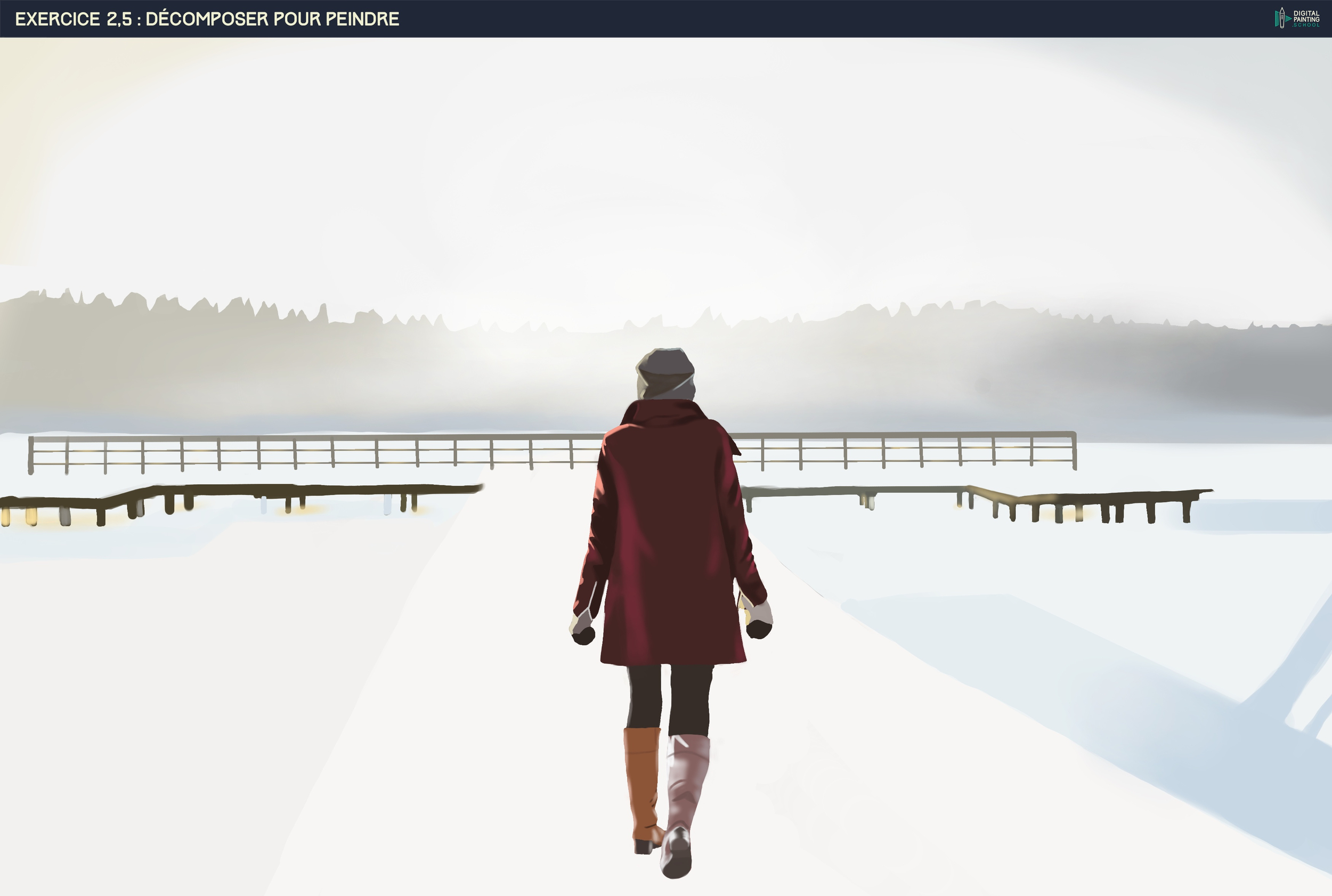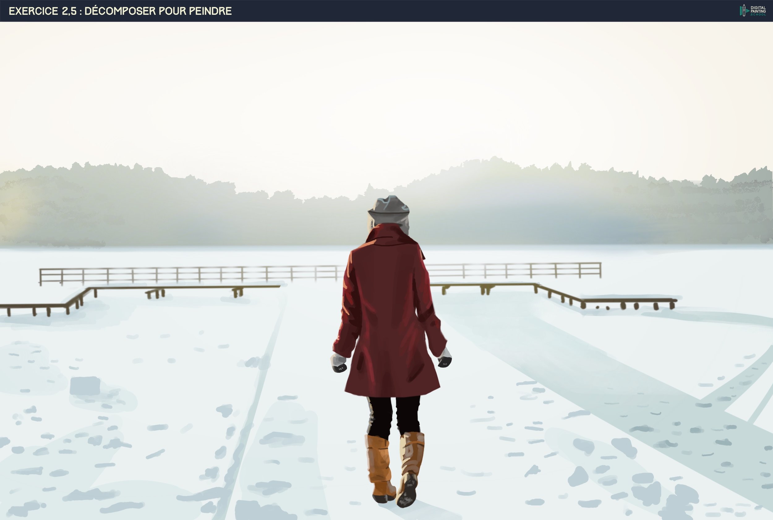 Bonjour tout le monde 😁 Je viens de terminer les exercices 2 et 2.5 (je vous épargne le 1 ahah). Pour le premier j'ai du le recommencer 4 fois au moins, les résultats n'étant pas à mon goût et pas assez "propre" mais au moins cela m'a entrainé à utiliser Krita et ma tablette correctement ^^ Pour l'exercice 2.5 je me suis contentée de le faire une fois (et c'est déjà pas mal héhé) là où j'ai le plus galéré c'était pour les sapins que j'ai du recommencer et la neige. C'est pas évident.. mais je suis plutôt contente du résultat même si mon côté perfectionniste voudrait que je le peaufine encore et encore 😆 je me suis quand même arrêtée sinon je ne vais jamais passer à l'exercice suivant. Je suis preneuse de tout conseil pour améliorer ce que j'ai produit. Merci à tous et bonne journée 🙂 👋