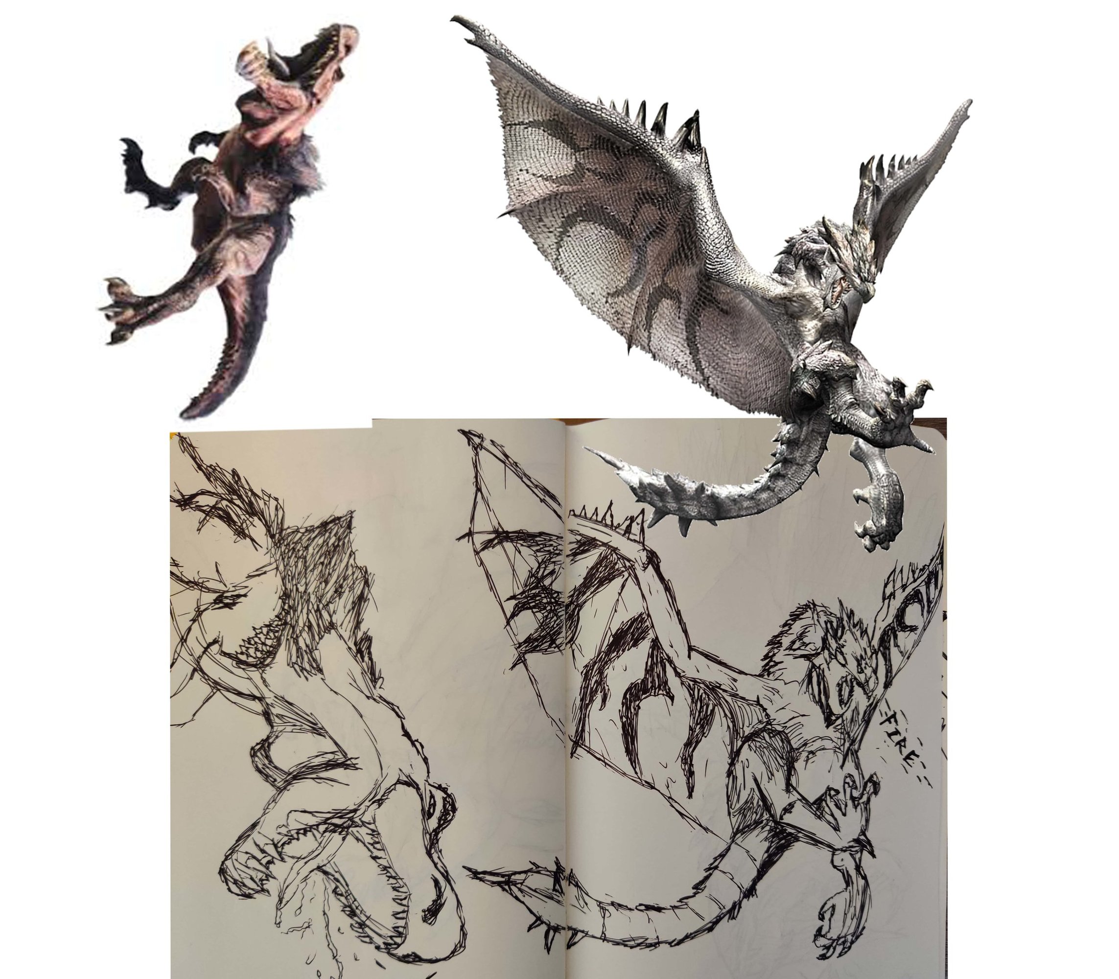 Bonjour bonjour, je créé ce sujet après un long moment sans poster mes dessins autres que mes exercices. J'ai besoin d'avis sur ces croquis que j'ai fait au stylo. J'ai choisi le stylo en partie parce qu'il me retirait cette addiction au bouton de ma tablette bindé sur CTRL+Z. L'avantage c'est que cela m'oblige à plus réfléchir avant de faire ma ligne, et cela m'empèche d'aller l'annuler 15 fois d'affilé alors qu'elle n'était pas si mauvaise. Le désavantage ? Quand je vois une erreur, il est parfois trop tard ! Excusez moi pour la mise en page low-cost, les croquis viennent de mon carnet Ce que j'ai trouvé comme erreurs : - L'anjanath (l'espèce de dino) à une machoire un peu tordu et un peu petite - Le rathalos (wyverne argentée) à les pattes arrières trop hautes , les serres sur ses pattes sont baclées - Le lagiacrus (l'espèce de serpent bleuté) est bossu (le pauvre). Son coup est trop épais du coup il est réellement bossu. Sa courbe est pas la même et cela m'a fait faire des trucs bizarres sur la patte arrière apparente. Overall je sais pas trop quoi en penser, chaque croquis incomplet m'a pris 20 min, les monstres complets 30min. Bien-sûr les refs viennent de monster hunter 🙂 !