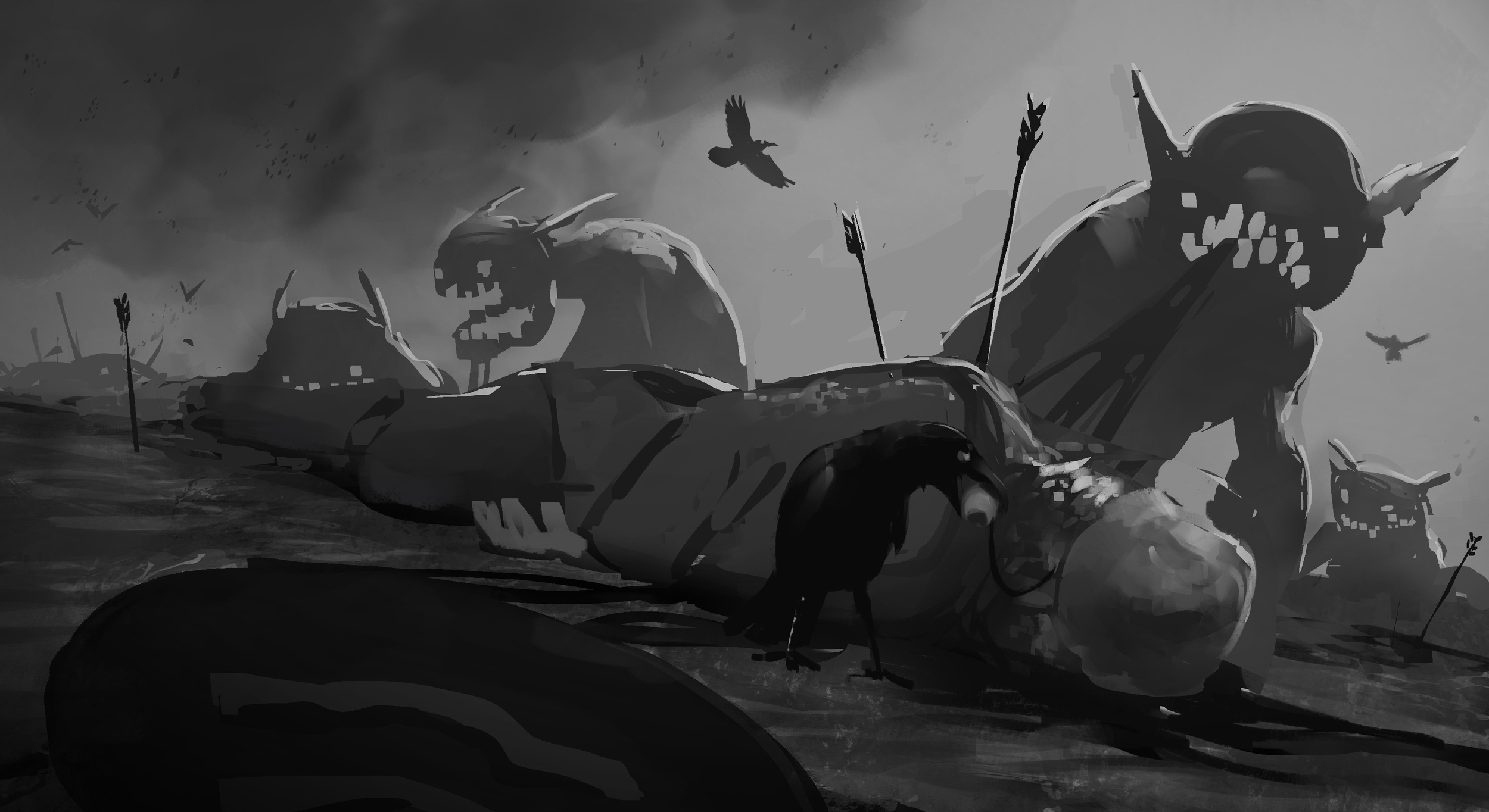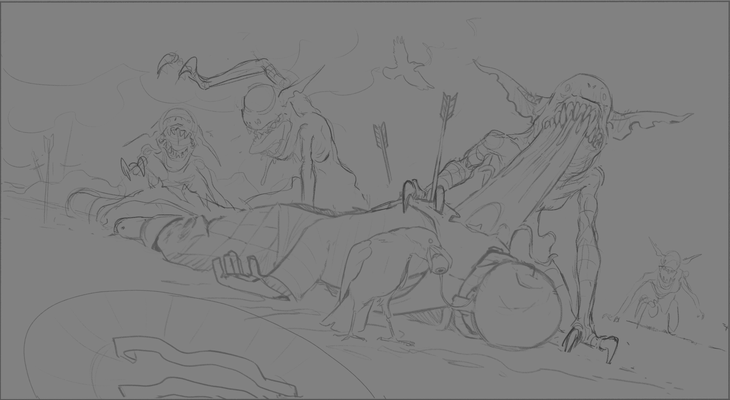 Bonjour tout le monde! Je me suis lancé dans une troisième idée qui suit tranquillement son cours 🙂 Comme pour les fois précédentes je commence avec un thumbnail à 3 ou 4 valeurs pour poser mon idée: De là j'ai enchaîné avec un croquis et quelques recherches de design pour les monstres qui partaient au début vers une forme de "molosses/gorilles" Comme ils ne me plaisaient pas trop, j'ai opté pour une version plus rachitique que je trouvais plus "effrayante"