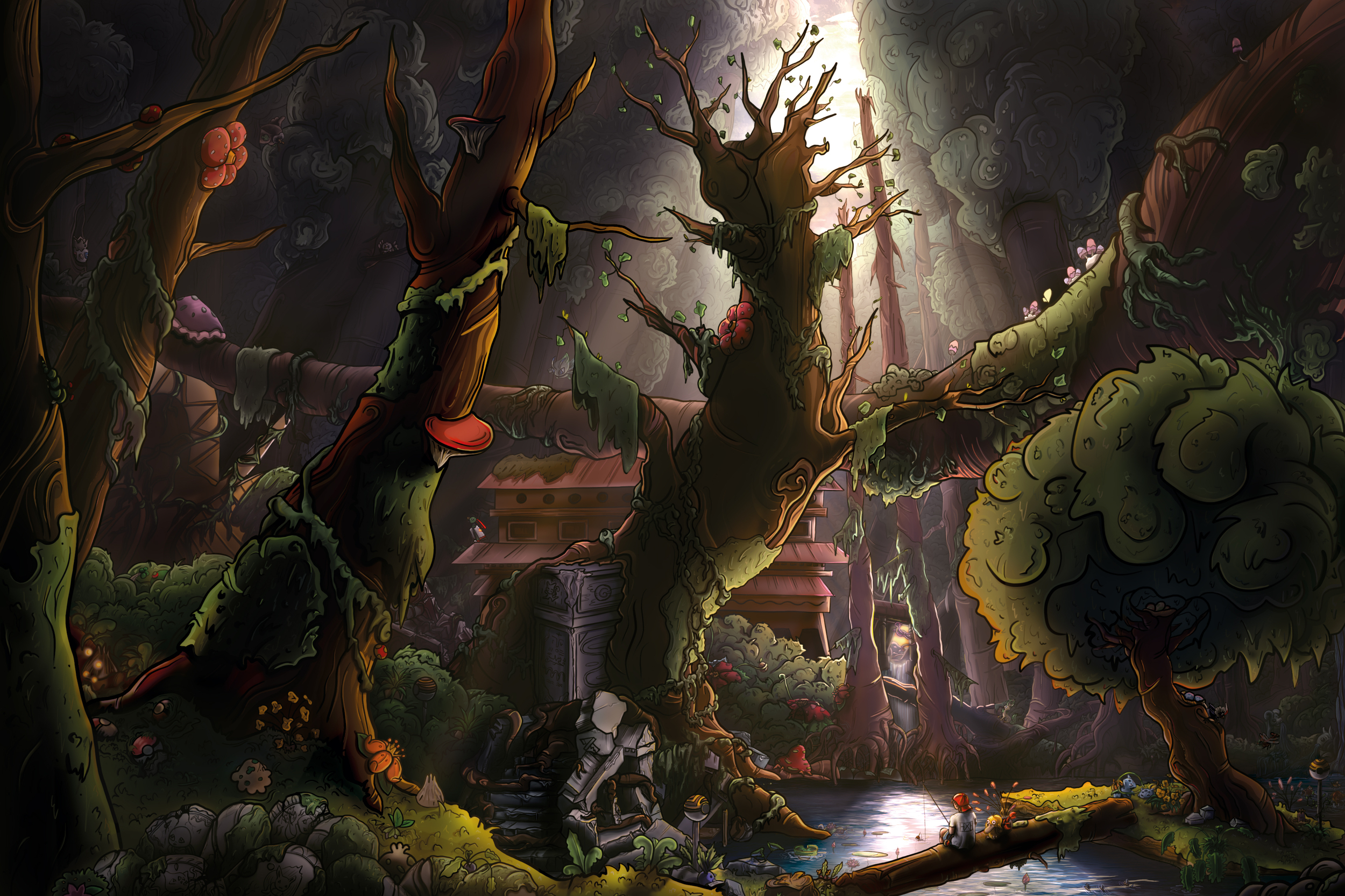 Bonjouuur ! J'ai réalisé ma première illu, enfin ! C'est sur le thème pokemon du coup, dans une thématique plutôt jungle avec un mood assez chill. Sacré défit pour une première avec la canopé au dessus, de la light en fond, la gestion de la light m'en a fait bavé et j'arrivais pas à sacrifier mes détails dans l'ombre XD J'ai fait moult boulettes évidemment, tout d'abord c'est en 32 bits ... Ouai c'est un gros bébé du coup, pas de rétropédalage possible. Ensuite l'objectif était de le faire imprimé, bah oui je l'ai enregistré en rvb sinon c'est pas fun ^^ et vu que c'est en 32bits il voulait pas le passer en cmjn ... mais à priori j'ai réussit, il n'y a plus de couleur non imprimable et il est passé en coated frograt 39 (pas sur de l'orth ^^) pour l'impression papier. Mais j'ai pas de certitude que ça marche faut que je contact un imprimeur... Sinon tant pis pour moi 😢 (je pose un P.S en bas pour passer en cmjn dans ces cas là, j'ai galéré a trouver si ça peut aider 🙂). Sur le process, j'ai fait un croquis papier, très simple et très laid ^^ histoire de poser une compo, une ambiance et un début de contenu. Ensuite j'ai refait sur tablette, et puis j'ai rjouter des détails en masse et enfin j'ai dégrossis pour faire une tracé plus propre. Pas évident de savoir la taille (épaisseur) du tracé en fonction du plan, du niveau de détails, de la lumière... C'est loin d'être parfait, mais ça m'a entrainé à me poser la question, après je pense qu'il y a aussi des choix artistiques à faire. Ensuite j'ai passé vite fait en teinte de gris, je pense que je me suis trop pris la tête sur cette étapes, que je trouve quand même importante parce qu'il y a un vrai jeu de lumière et de profondeur dans mon choix de thème, mais au final c'était assez assez faux je pense lol. Après j'ai posé des aplats de couleurs et les teintes de gris m'ont quand même permis de faire des choix de couleurs plus juste, même si j'ai tout changer après ^^ Enfin j'ai fait l'étape de painting, trèèèèès long avec beaucoup d'itération, de tests et de rajout de détails, mais trèèèèès cooool 🙂 et après j'ai tenté de gérer la light que je n'avais pas assez bien anticipé, essentiellement avec une chié de calque de niveaux. Je mets les étapes en dessous ça reste intéressant je trouve, pour les calques que j'ai enregistré comme il faut ^^ Je suis vraiiiiiiment preneur de retours !!!!!!!!!!!!!!!! Je débute, je ne suis absolument pas sur de pouvoir trouver du taf dans ce milieu mais j'aimerai beaucoup, du coup toutes remarques sera accueilli avec beaucoup d'enthousiasme *-* ! Si j'arrive à l'imprimer je pense en faire plusieurs et essayer de les vendre pour commencer. Next challenge, en faire une (ou plusieurs !) illu sur le thème ghibli 😮 J'en rêve ahaha Merci beaucoup pour votre temps ❤️ Bon brush à toutes et tous 🙂 (P.S : pour celles et ceux à qui ça arriverait ! Le mode cmjn est grisé, je suis passé par fichier - automatisation - changement de mode conditionnel et j'ai passé de rvb à cmjn, mais il faut que les réglages du passage en cmjn ne soit pas désactivé dans - édition - couleur - règles de gestion des couleurs).