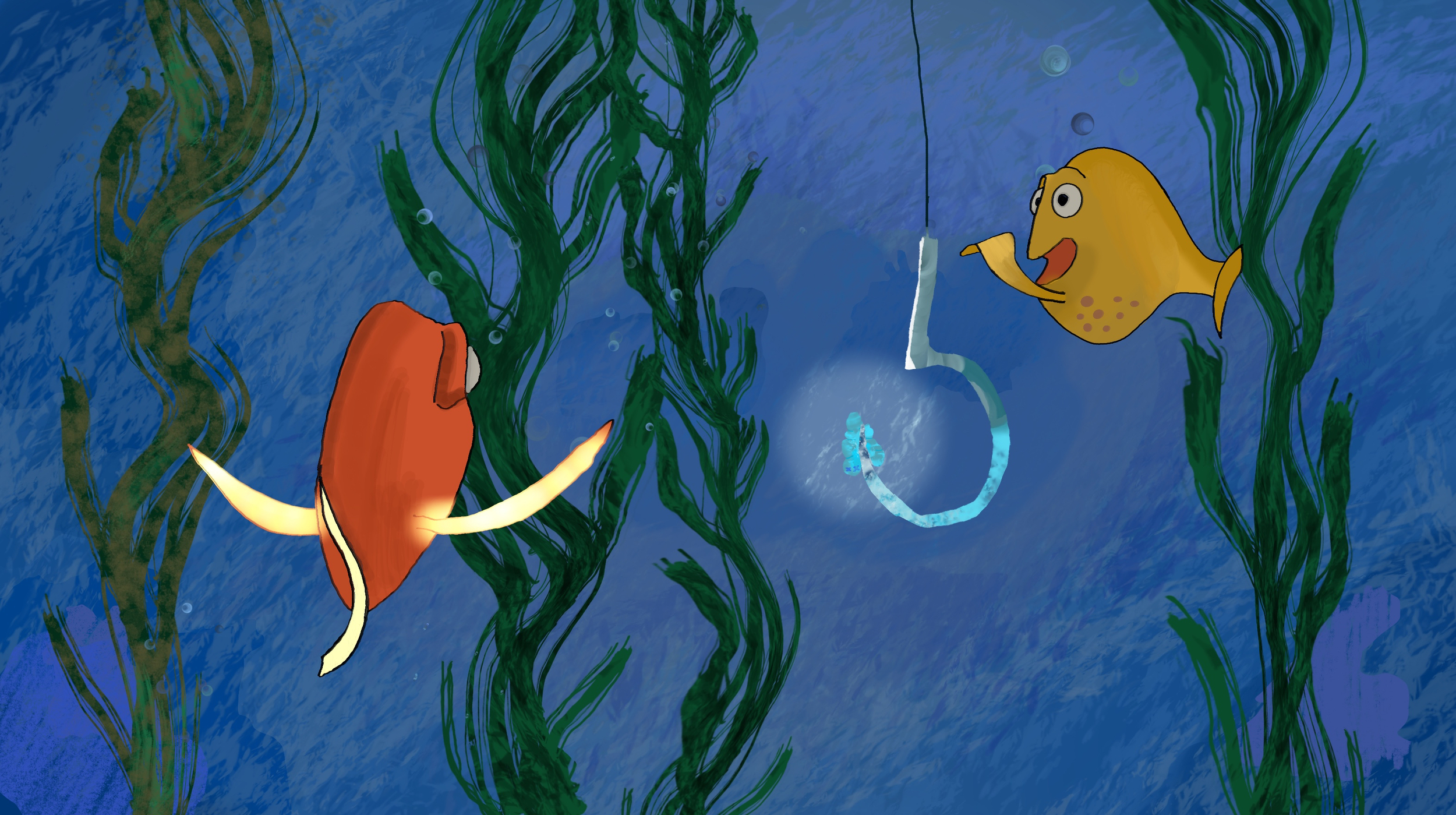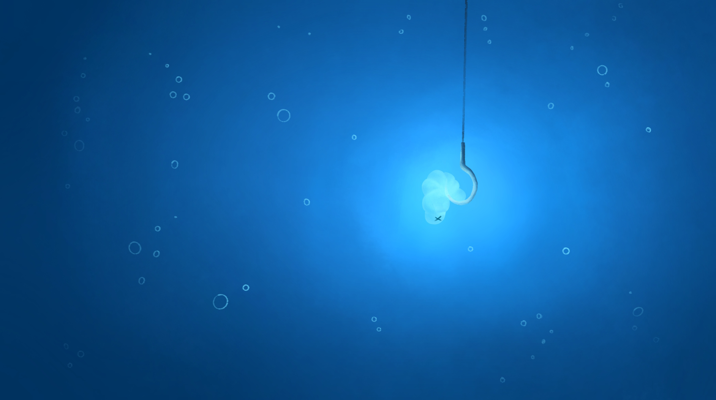 j'ai eu du mal pour les bubulles, je sais pas mon brush je crois l'ai modif par le passé du coup j'ai juste réussi a avoir ce rendu, j'ai changé les petits yeux (du petit vers mort) je lui ai mis des petits yeux avec du glow et j'ai mis un petit effet bokeh pour le côté aquatique me suis dit que ça pouvait donner plus de sens à l'illustration.