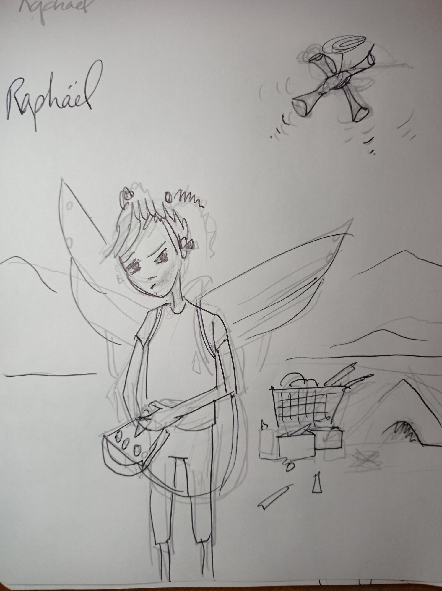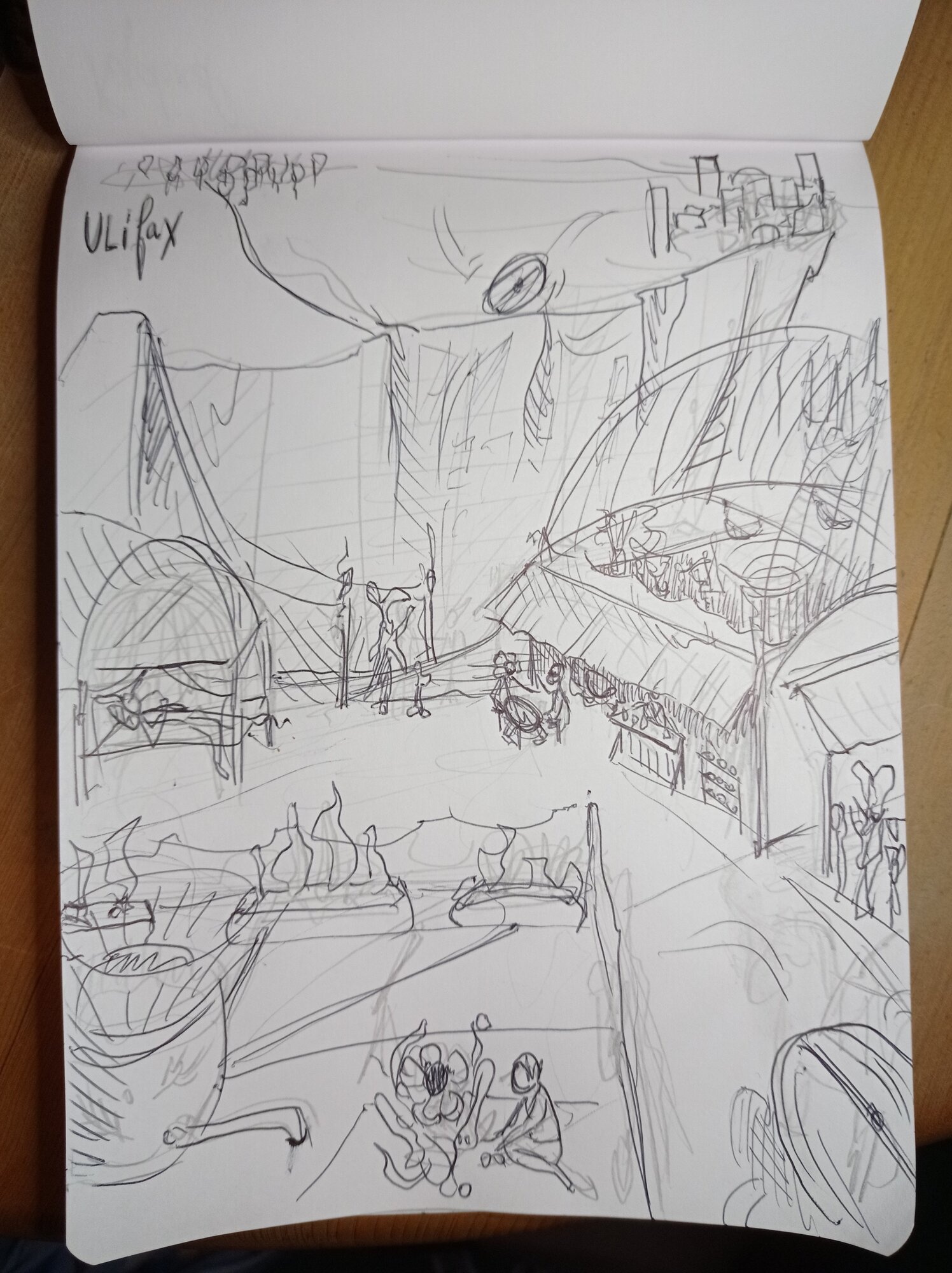 Bonsoir! 🙂 J'ai fait 2 croquis pour démarrer le voyage interstellaire 👽🏜️ , un croisement des chemins dans un village d'Ulifax et le petit Raphaël. Je cherche encore une idée plus original pour l'invention qu'il sera entrain de tester, je trouve celle ci un peu simpliste pour un univers aussi complexe 🤔 par contre l'idée des boules quies je vais garder même si c'est pas très original je trouve ça cool 😉 Hâte d'avoir vos impressions même s'il ne s'agit que d'idées pour commencer 🙂