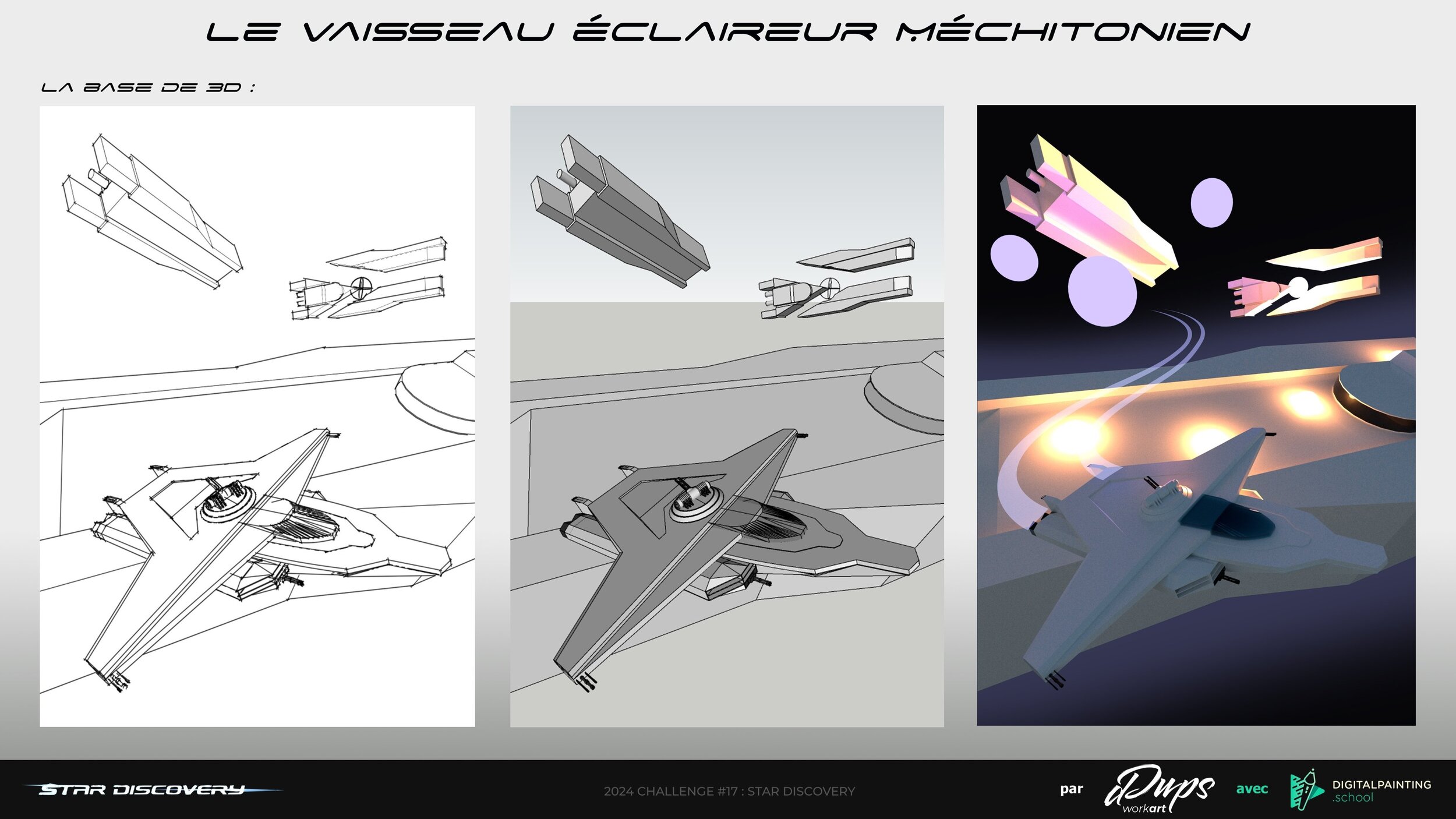 Bonsoir à tous, Voici mon Work In Progress pour mon projet de Painting du Vaisseau éclaireur Méchitonien dérobé par notre équipe de Héro de Star Discovery. J'ai fait plusieurs essais et recherches, jusque la ça ne me plaisait pas. Là je crois que j'ai un point de vue intéressant donc je vous partage. Je suis parti sur une base de 3D sous Sketchup avec un rendu de base avec Vray. C'est un rendu tout pourri, juste pour pouvoir choisir la perspective avec une focale donnant un peu de profondeur et de dynamisme. Je vous partagerais l'avancement. J'espère pour aller au bout assez vite parce que j'avais une autre idée de projet pour le concours .. J'ai perdu pas mal de temps à chercher des idées pour les deux concept. Je ne consacre aujourd'hui pas beaucoup de temps au Digital Painting malheureusement, mais je ne lâche rien :D A bientôt, j'espère pourvoir avoir une publication dans l'Artbook, ce serait super.- 3 réponses
