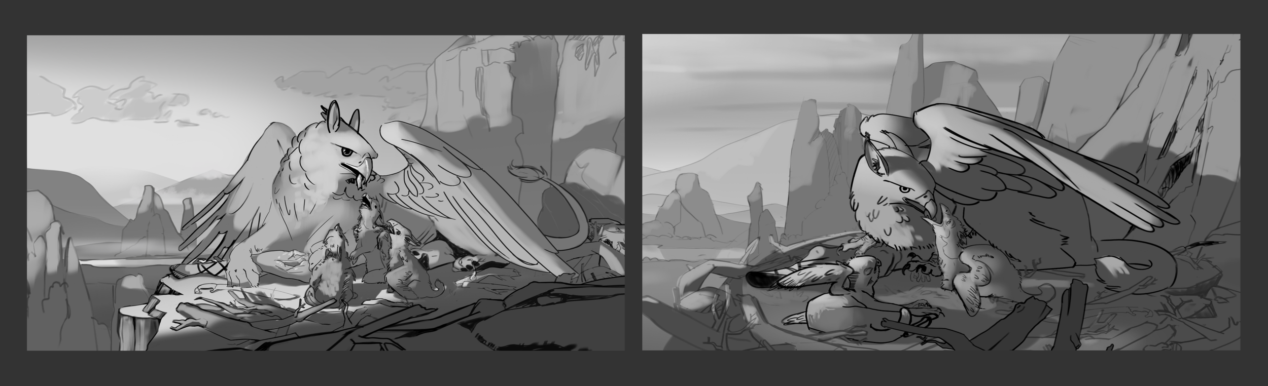 Bonjour/ bonsoir à tous! Cela fait longtemps que je ne suis pas passée sur le forum (depuis ma grossesse, il y a 2 ans). Je me remet doucement au dessin dans mon temps libre et je profite de ce challenge pour me donner une motivation supplémentaire 🙂 Pour ma part, je pars sur une illustration type naturaliste d'un griffon "dans son milieu naturel" comme si ça avait été peint par un naturaliste. Je pense notamment à Rosa Bonheur. Après plusieurs vignettes, je me suis penché sur 2 précisément, les voici: Je suis preneuse de retour! Je ne sais pas laquelle choisir. Le design même des griffons peut encore varié. Je vais m'y atteler après le choix du posing/ vignette. Je vais peut-être un peu m'écarter du classique lion- aigle ou sa variante populaire lion- pygargue. Je vais voir avec du guépard des neiges ou de la buse. Cela va surement influencer les valeurs, en fonction du pelage/ plumage. Merci d'avance pour vos retours!