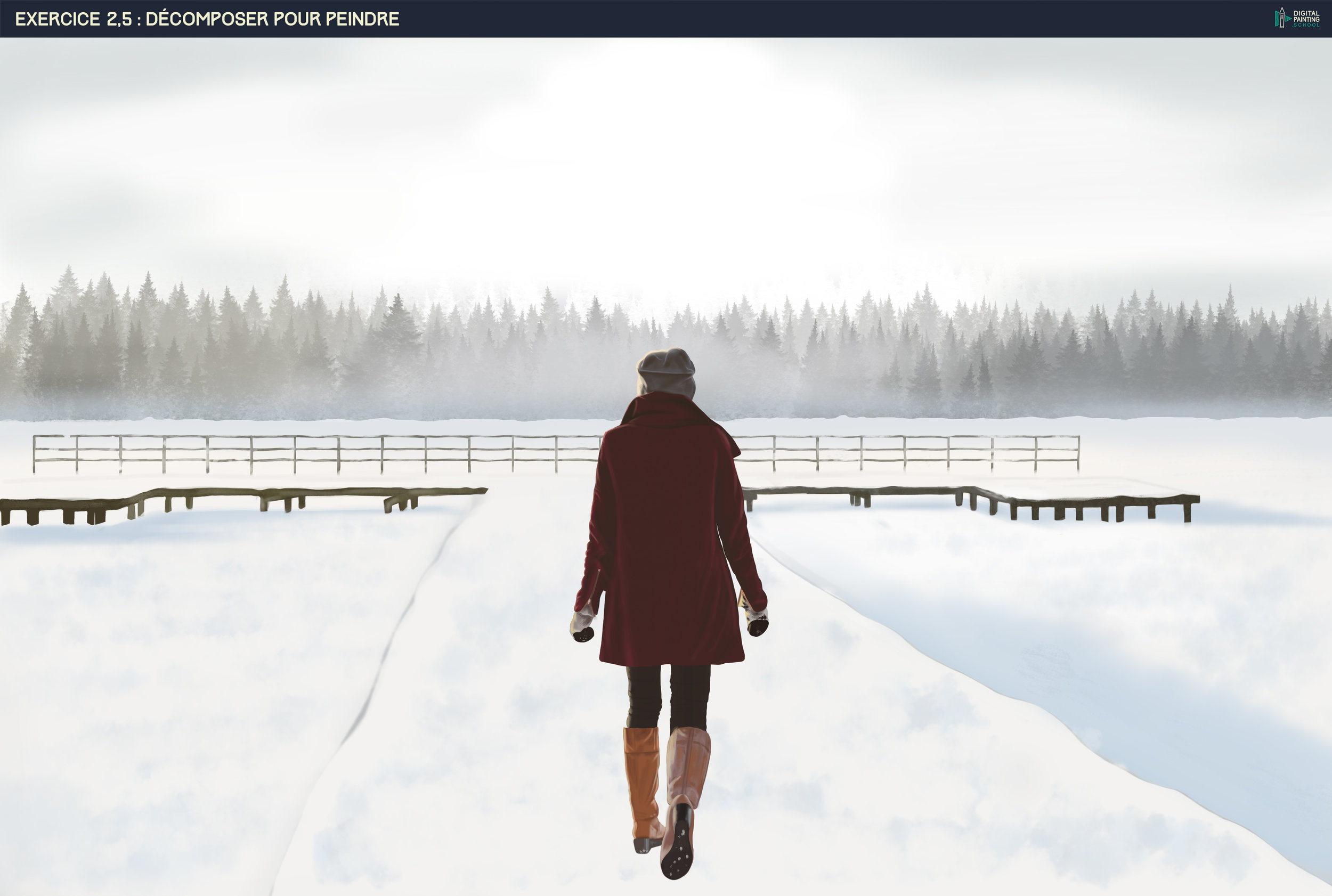 Pawm 0 Posté(e) 5 juin 2019 Bonjour Grimdor, Merci beaucoup pour ce retour ! Rien de mieux que l'entrainement pour se faire la main de toute façon 🙂 Je suis assez fière de moi d'arriver de trouver du temps entre mon boulot à temps pleins, ma formation en comptabilité en plus et celle ci. Mais quand on veut, on peut ! 🙂 J'en profite du coup pour mettre mon dernier exercice, le 2.5 ! Je me suis éclatée avec les brushes pins pour le fond hahaha. Bon par contre niveau "texture" pour la neige je n'arrivais pas à avoir quelque chose de neigeux... J'ai essayé de me concentrer au maximum sur le personnage, et je suis plutôt contente de moi 🙂 J'attends vos retours constructifs ! Partager ce message Lien à poster Partager sur d’autres sites More sharing options...