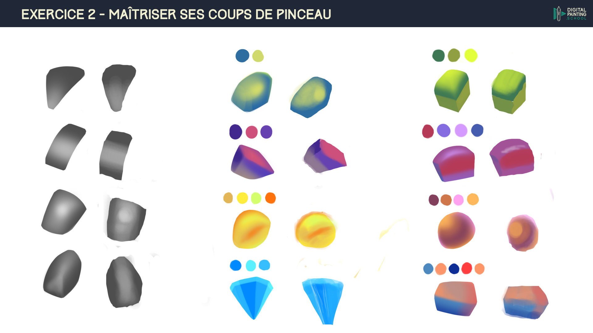 Merci de ta réponse yuna pour répondre a tes questions oui le diamant a été une torture a faire lol,les brush que j'utilise sont : rond soft , rond dur opaque et one edge pour info je travaille sur clip studio paint je pense continuer a m'entraîner mais je vais essayer les autres exos du chapitre sa m'aidera peut-être lorsque je reviendrai a cette exos