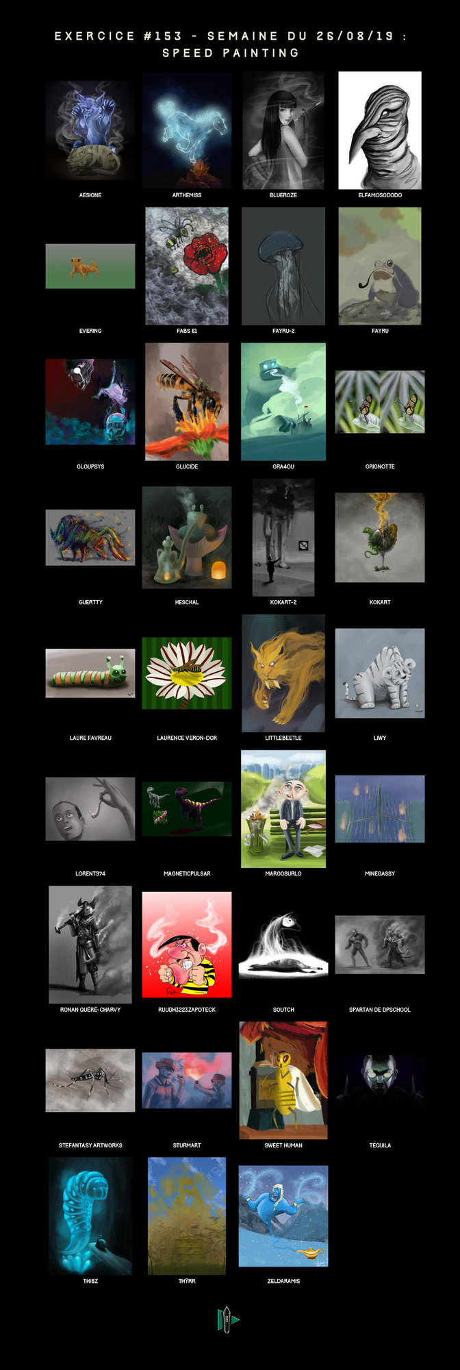 Ravenn 1,772 Posté(e) 25 août 2019 Yo les peintres ! Cette semaine c’est speed painting ! Vous connaissez la règle : vous avez une heure max pour réaliser un digital painting sur un des 3 thèmes donnés plus bas. Vous pouvez mixer les thèmes ensemble si vous voulez. Pour cette semaine, voici les thèmes pour défouler vos stylets : Enfumé Bestioles à rayures Esprit libéré Quelques précisions : Durée d‘une heure maximum (essayez de jouer le jeu, mettez un chrono !) Possibilité de mélanger les trois thèmes, ou de faire les trois séparément, ou de choisir un seul thème… Pas d’utilisation de photo (ni photomanipulation ni photobashing), mais vous pouvez utiliser des références photo pour vous inspirer Les thèmes peuvent être représentés de façon littérale ou métaphorique, à votre guise Laissez parler votre imagination, soignez la composition autant que possible, et montrez-nous votre propre univers ! N'oubliez pas de commenter les travaux précédents 🙂 Pensez à mettre le temps que vous avez mis en même temps que votre image, et à poster votre résultat en une seule image si vous souhaitez être sur l’image récapitulative en fin de semaine ! Bonne semaine à tous, et faites chauffer vos tablettes ! Partager ce message Lien à poster Partager sur d’autres sites More sharing options...