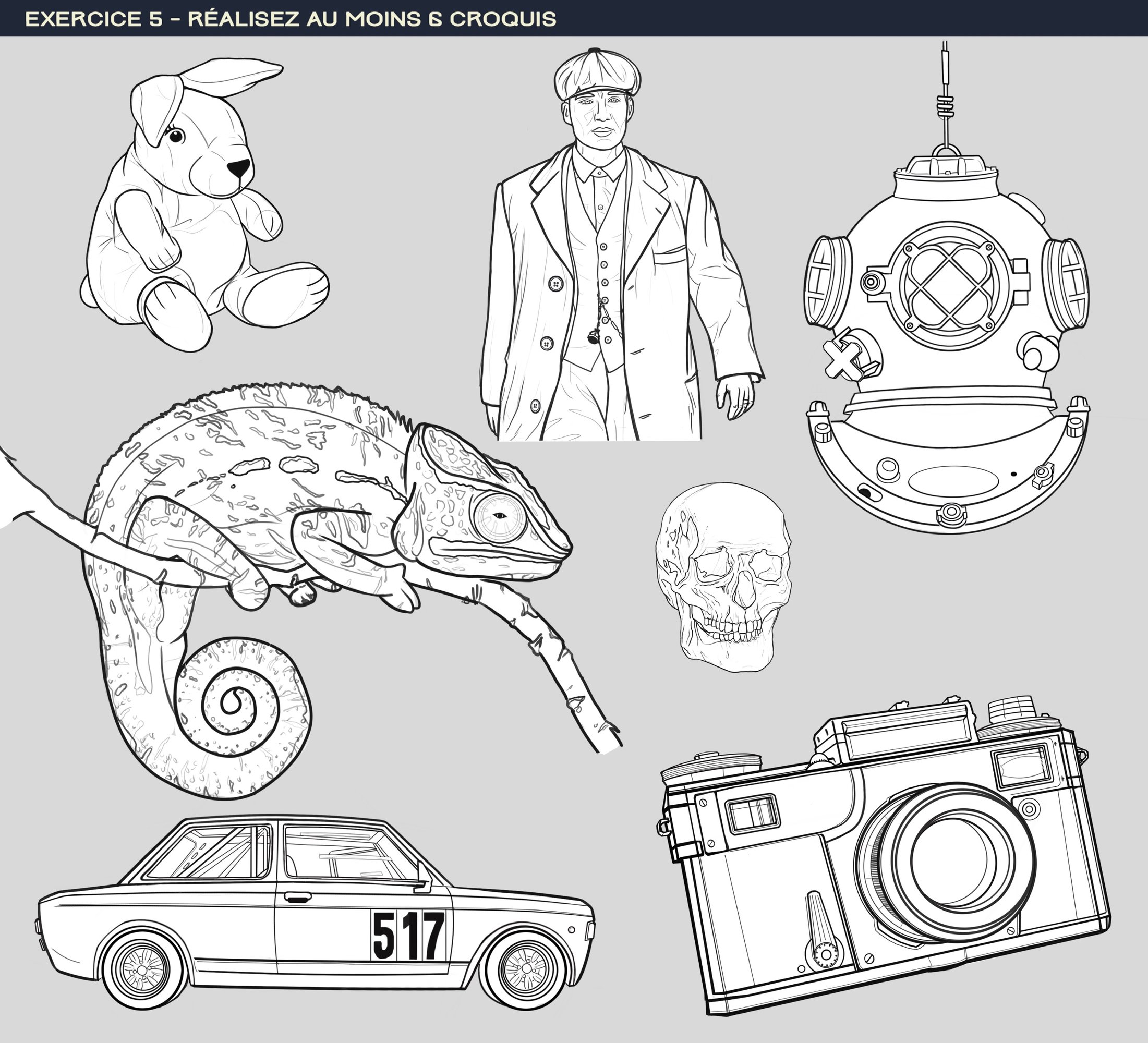 vxdcxw 789 Posté(e) 5 janvier 2020 Hello ! C'est marrant, tu as choisi les même objets que moi ! 😂 Ton lapinou est vraiment trop choupi, pas grand chose à en dire mis à part l'oreille de droite qui devrait passer derrière l'arrondi du crâne il me semble. En tout cas sur l'image de référence c'est très subtil et sur ton image ça fait une grosse courbe. L'appareil photo est vraiment bien travaillé et tu as raison de sortir de ta zone de confort, on progresse plus vite comme ça. Dans l'ensemble c'est très bon et j'aime beaucoup tes lignes. Je vois deux erreurs : la plus importante, ce sont les lignes de fuite au niveau du flash qui suivent des directions un peu maladroite. Voilà une petite "correction". L'autre erreur, de moindre importance, c'est la petite poignée à gauche de l'objectif qui est un peu plate. Pour améliorer ça, tu peux juste doubler le cercle intérieur pour lui donner un peu de volume. Sinon, tu t'es vraiment bien appliquée, l'objectif est particulièrement bien réussi ! Pour les textes, je rejoins ton point de vue. A mon avis, si on veut le reproduire, il vaut mieux l'écrire droit et ensuite utiliser une transformation pour courber le texte afin qu'il suive la courbe de l'objectif. Allez, bon courage pour tes prochains croquis ! Je te conseilles au moins une image avec de la perspective, c'est important à maîtriser ! 😉 Instagram | TwitterHello GameDev (Discord) communauté 100% francophone pour apprendre la création de jeux vidéo Partager ce message Lien à poster Partager sur d’autres sites More sharing options...