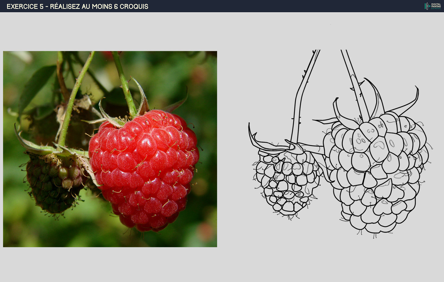 ShozArt 5,938 Posté(e) 8 juin 2020 Le 6/1/2020 à 11:58 AM, Vincent R a dit : Bonjour, Je vous présente la suite de mes exercices. Hello ! C'est bien parti pour les premiers exos. Le Hubble ca fonctionne, sur l'exo 2 tu peux essayer de joindre tes lines de façon plus souple, qu'il n'y ai pas de coupure parce que les lines sont fluides mais c'est au niveau des jonctions que ca me semble compliqué. Pour le crâne les proportions globalement sont bonnes, t'as par contre un problème de placement de la machoire du bas. Je te conseil de vérifier lorsque tu es à l'étape 2 si tous tes placements et proportions sont bonnes. 2 techniques pour checker tes proportions : Le miroir : Image > Rotation de l'image > Symétrie de l'axe horizontal. TU retourne ton image et ca permet à tes yeux de voir les erreurs auxquelles ils s'étaient habitués. Sinon tu peux simplement superposer l'image pour vérifier puis l'enlever ensuite pour te corriger, le but n'est pas de tracer bien entendu. Pour les lines c'est très bien que tu ai marqué d'avantage les contours des formes, juste une chose par contre c'est que la différence est un peu trop marquée entre les 2 types de lines, je penses que tu n'as pas activé la pression de ton stylet, je te laisse les régalges plus bas. Tu pourras faire des transitions plus progressives entre les 2 afin d'harmoniser le tout. Pour le dragon même remarque pour les lines, sinon niveau proportions c'est très bien, y'a juste la line du cou de droite qui me semble trop rentrée vers l'intérieur. La grenouille ca marche, elle est un peu plus large. Enfin pour les feramboises, petit conseil niveau des lines, tu peux suggérer d'avantage les traits, plutôt que de tracer chaque grains, tu peux simplement faire une partie des lines avec un trait assez fin et plutôt marquer le contour de la framboise, ca te permet d'indiquer une texture sans pour autant avoir à tout dessiner. En + ca te permet de rendre le tout plus lisible, on comprend mieux la forme, on comprend la texture, et tu peux aussi ajouter de la distance en faisant + de détail sur la premiere framboise et moins sur la 2nde. Keep it up ! Retrouvez moi sur : Artstation Facebook Youtube InstagramMa participation au Challenge#19 Partager ce message Lien à poster Partager sur d’autres sites More sharing options...