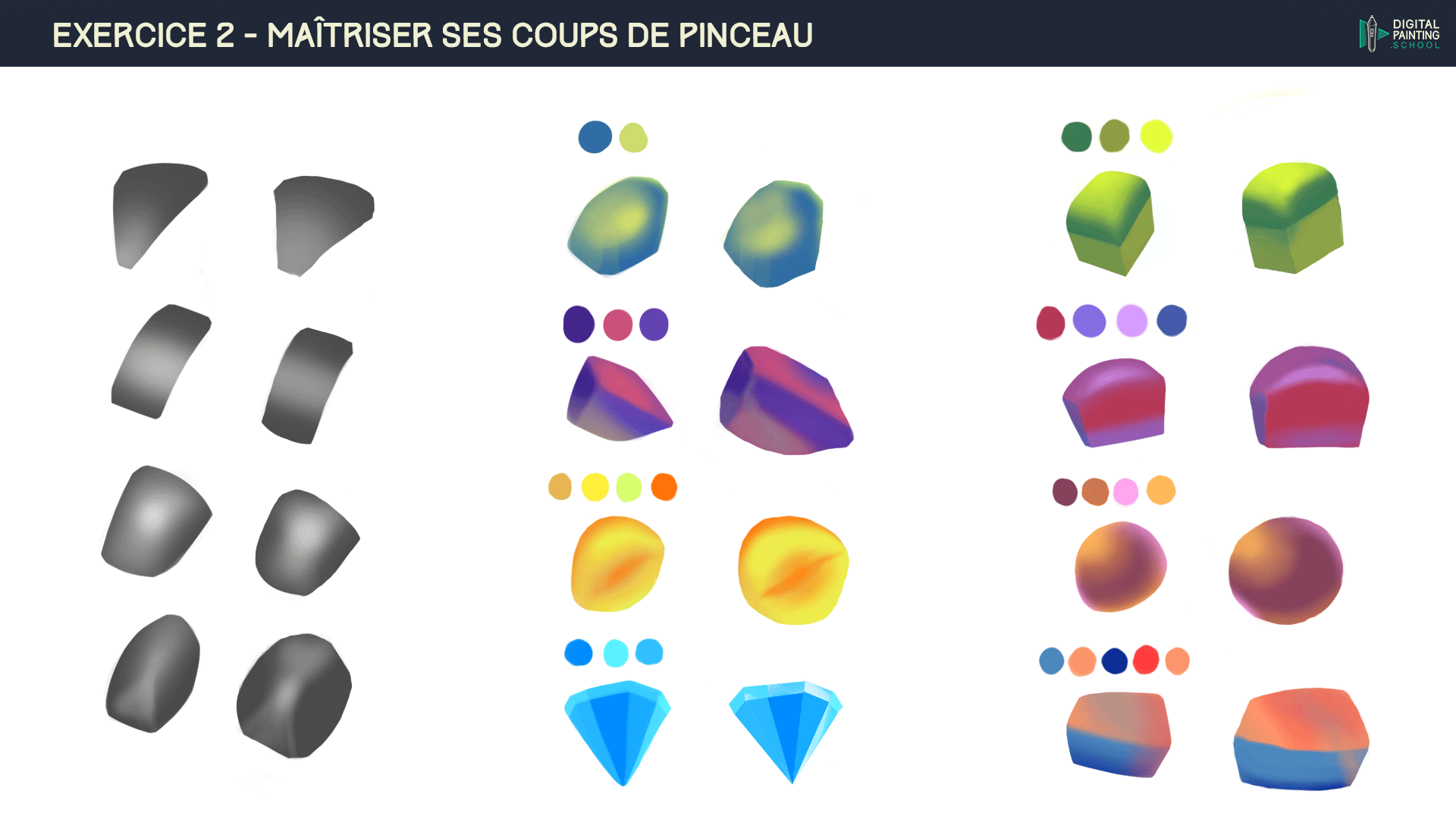 Schmax 3,805 Posté(e) 6 octobre 2020 Hello @Velocyet bienvenu à toi 🙂 Citation non sans difficulté j'ai l'impression d'avoir fait un AVC et que je suis en rééducation tentant de créer de nouvelles connexions neuronales 😝 Haha c'est le métier qui rentre alors 😛 Citation j'ai quelques problèmes avec ma façon de penser mes dégradés et le chois de mes brushs Alors on va surtout utiliser un brush net pour avoir plus de précision et/ou pour faire des transitions plus nettes, plus précises, la soft brush ( le cercle avec des bords flou) va être surtout utilisé pour faire ce que l'on appelle du blending ( mélange de couleur). N'oublie pas que tu peux jouer sur les paramètres des tes brush pour avoir un bords plus ou moins flou. Je te conseille aussi de prendre en compte l'opacité de la brush, par exemple pour avoir une belle transition de couleur, utilise une brush soft à 30% d'opacité par exemple, comme ça tu peux gérer plus facilement tes coups de pinceaux. Globalement, on voit que tu as eu un peu plus difficultés sur le blending justement, le dégradé de la 1ere forme violette n'est pas tout à fait juste, même remarque sur le dégradé de la forme verte qui est trop fort sur le dessus. Tu as un raccourci bien pratique qui te permet de peindre sans dépasser, il suffit de faire un CTRL plus clic souris sur ton calque pour avoir une selection autour de l'objet que tu viens de peindre. Concrètement avec la 2eme forme grise, tu prends un nouveau calque, sur celui ci tu viens peindre la forme principal en gris foncé, ensuite CTRL + clic sur le calque, la il va y avoir une sélection autour de ta forme, tu changes de brush pour prend une brush soft à 30 % en gris clair et la tu as juste venir peindre au centre de ta forme. Une fois fini tu fais CTRL + D pour tout désélectionné et le tours est joué. Bonne correction. 1 Partager ce message Lien à poster Partager sur d’autres sites More sharing options...