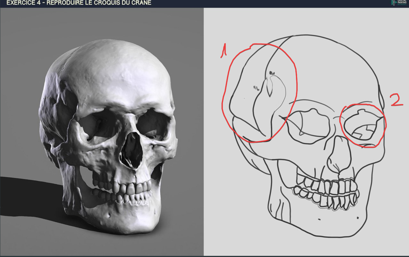 Isabelle 338 Posté(e) 22 mai 2021 Il y a 18 heures, Schmax a dit : La silhouette du crane me semble mieux également, ceci dit tu as toujours une petite différence dans la représentation des orbites Pour le rajout de l'ombre, je t'inviterai plutôt à comprendre comment la placer sur ton dessin plutôt que de la décalquée.En soit ce n'est pas interdit loin de la mais tu restes finalement dépendante de la photo et ça sera plus difficile pour toi, par la suite de savoir comment placer ton ombre sans référence photo pour un dessin d'imagination Je suis d'accord avec toi sur l'objectif. Par contre, il faut bien commencer quelque part (peut-être suis-je trop indulgente avec moi-même ?) ... Quelque soit le croquis que je fais, pour le moment, j'ai besoin d'un point de départ. Sans çà, çà devient vite n'importe quoi. Le crane me demande beaucoup d'efforts. Avec le dessin technique, il suffisait de se référer aux cotations. On part toujours avec quelque chose. Là j'ai vraiment du mal à trouver mes repères, .... Partager ce message Lien à poster Partager sur d’autres sites More sharing options...
