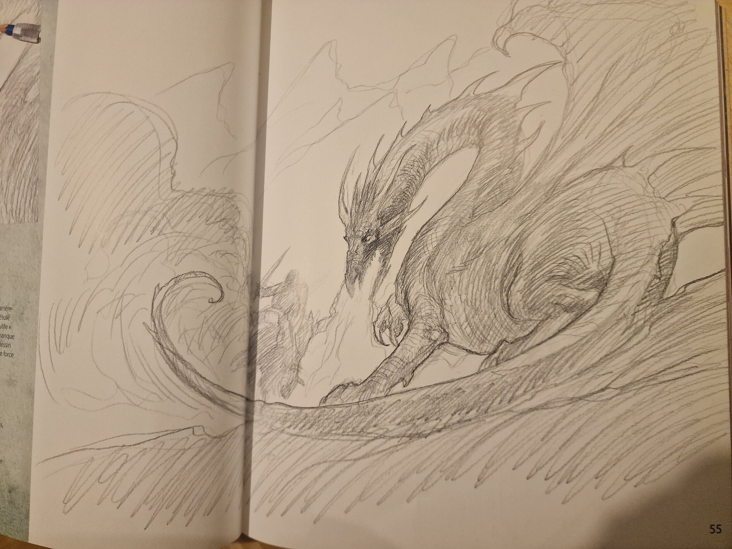 Sanzo 89 Posté(e) 21 janvier 2024 (modifié) Il y a 14 heures, Asur Misoa a dit : Il est top ce croquis. 🙂 Tes traits sont encore un peu brouillon, pour gagner en lisibilité, n'hésite pas à faire varier l'épaisseur de trait en allant du plus épais pour les éléments importants au plus fin pour les détails, Actuellement ça manque de hierechisation. Du coup ici pour être 100% transparent, il s'agit plus d'une étude ou tu as quand même ajuster des éléments dans les design/pose/compo ? J'ai ajusté quelques éléments dans la mesure où j'étais incapable de réaliser ou de comprendre certains détails du croquis (je le partage ci-dessous afin que tu te fasses un idée du modèle initial). J'ai galéré avec quelques éléments du croquis : le chevalier, sa patte droite et les ailes où j'ai du mal à voir s'il y en a une ou deux. Dans le cas du chevalier, je me suis finalement inspiré de la photo de dos d'une femme qui galope sur un cheval. Pour ce qui est de la patte, j'ai préféré refaire une patte différente. Enfin, pour les ailes, John Howe explique qu'elles sont en mouvements et qu'elles apparaitront donc flous. C'est peut-être la raison pour laquelle c'est aussi fouilli. J'ai fais le choix de rendre le croquis des ailes plus claires mais sans aller dans le détail pour le moment. Et tu as raison pour la hierarchisation, j'ai pour le moment aucune idée de ce qui devrait être le plus visible. Petite remarque, John Howe indique dans l'ouvrage que l'élément clé de son dessin est la queue et qu'elle doit dénoter une certaine énergie. Maintenant j'avoue que j'ai du mal à faire cette hierarchisation Modifié 21 janvier 2024 par Sanzo Partager ce message Lien à poster Partager sur d’autres sites More sharing options...