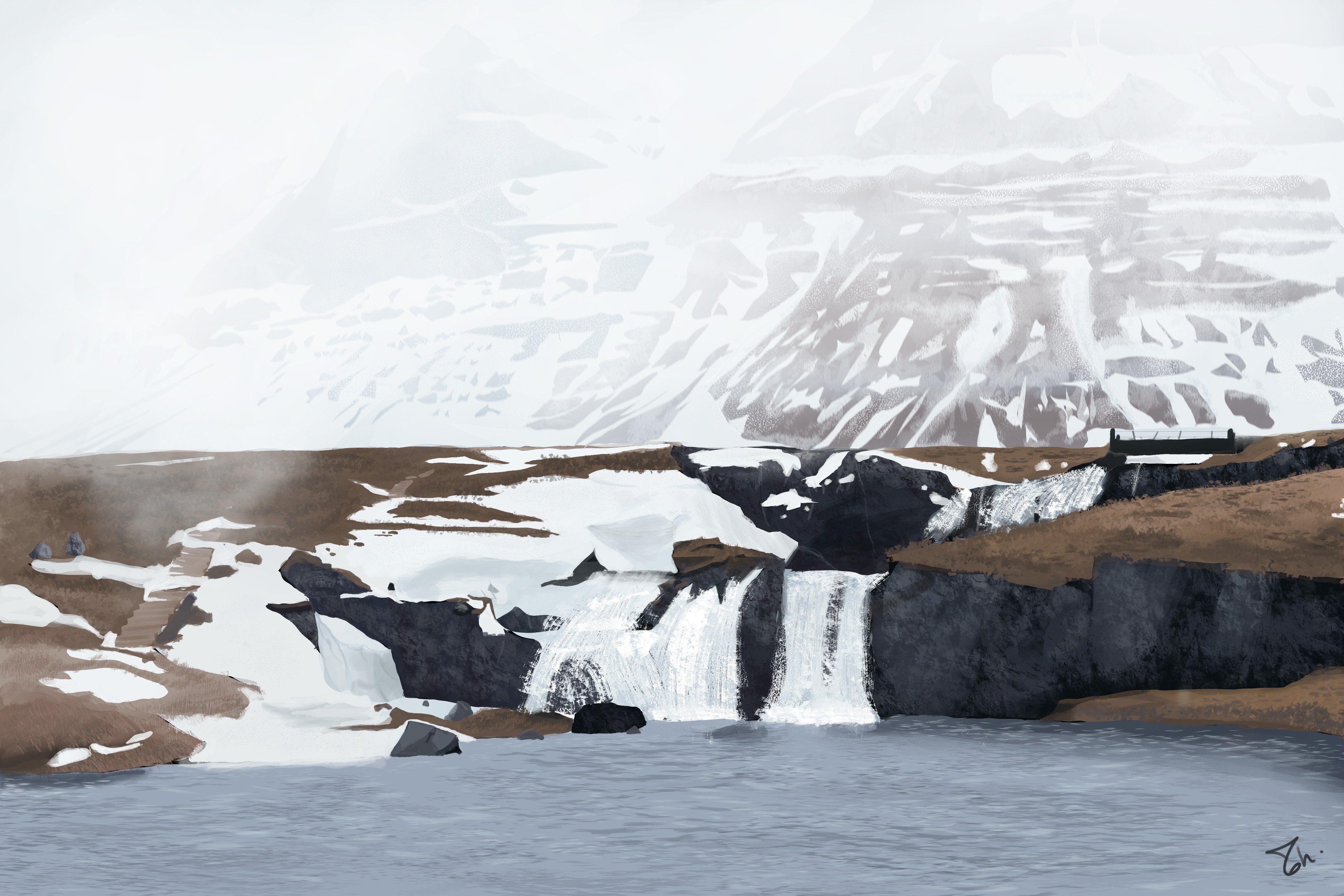 Tu peux rendre tes roches plus foncées et rajouter des ombres plus fortes sur les cascades.