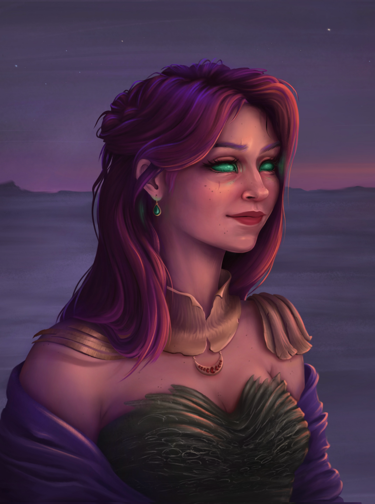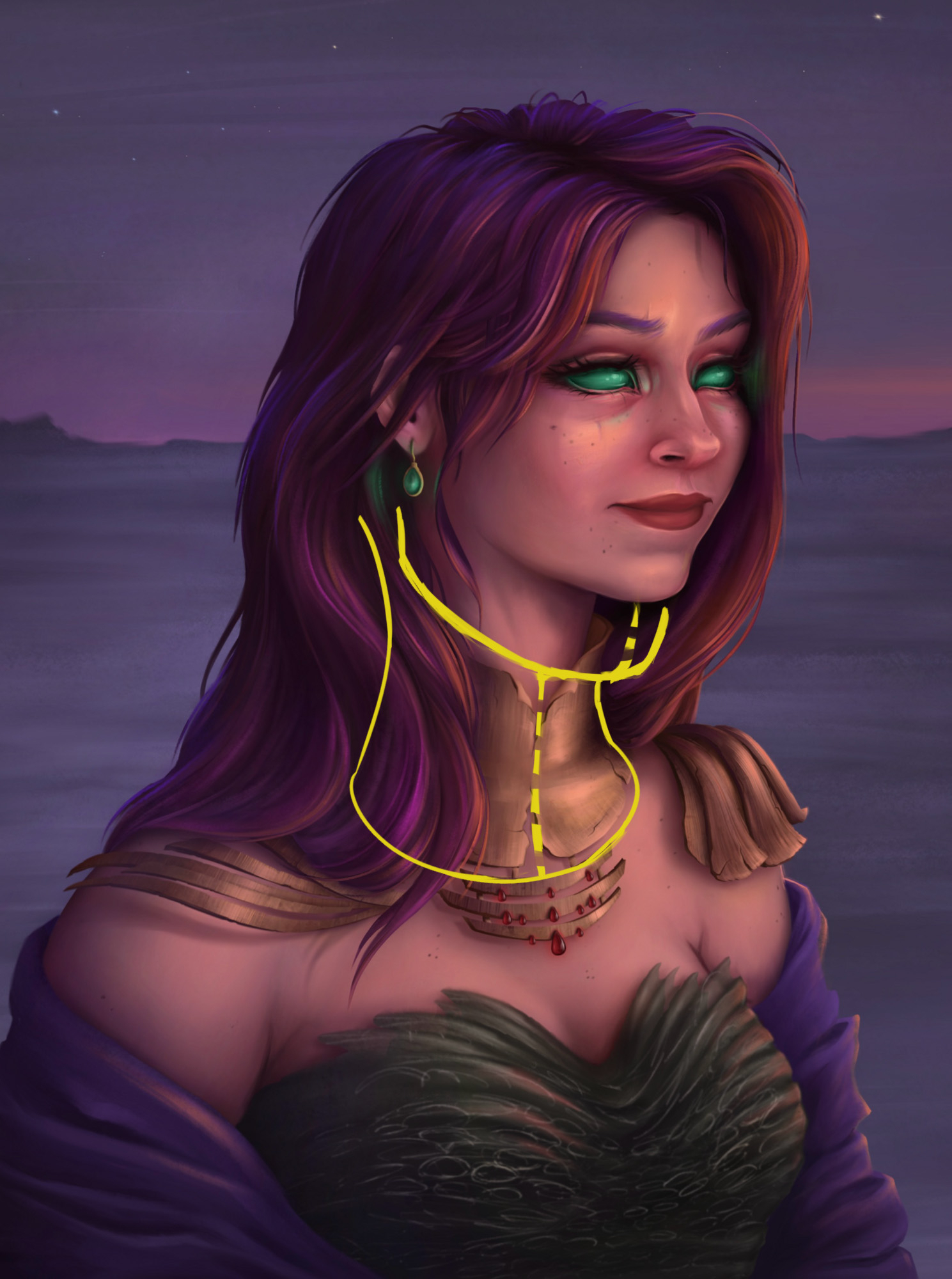Bonsoir! Voici l’évolution de mon DP 🙂 j’ai posé les couleurs rapidement et j’essaie de gérer la lumière. J’ai essayé de pas me disperser au niveau des couleurs (pour trouver une harmonie) et pour le fond il est super sombre mais c’est pour mettre en valeur les gemmes.  Je sais pas trop comment faire ce clair obscure, je pense qu’en tâtonnant encore un peu sur les ombres du visage je pourrais éclaircir légèrement le fond 🤔