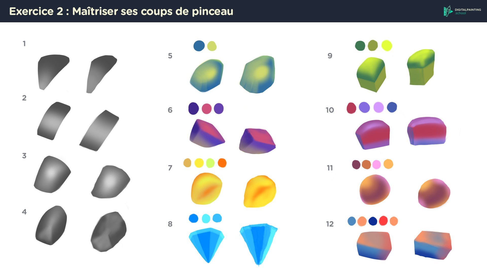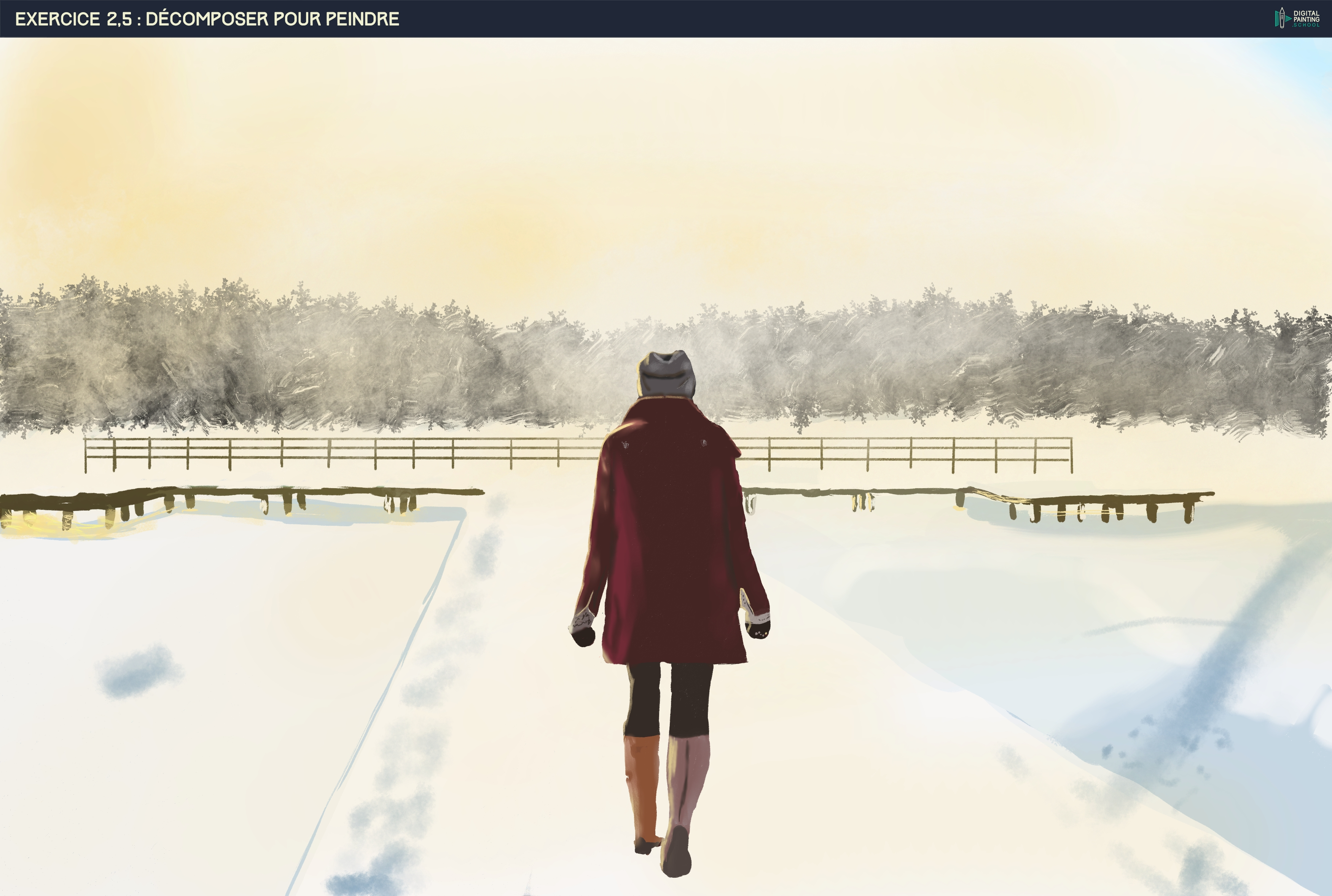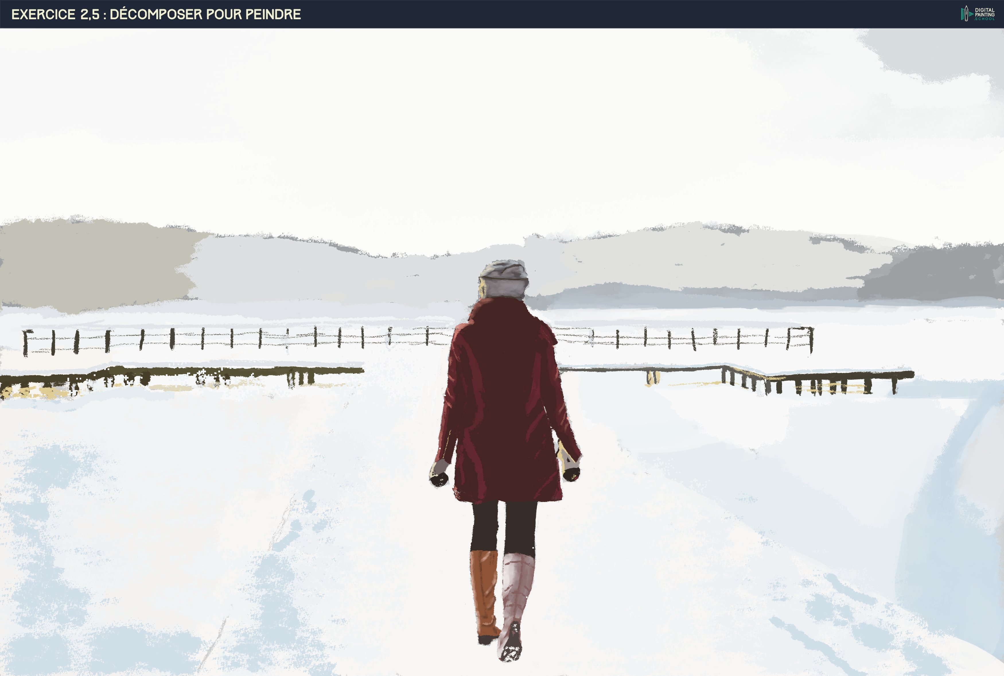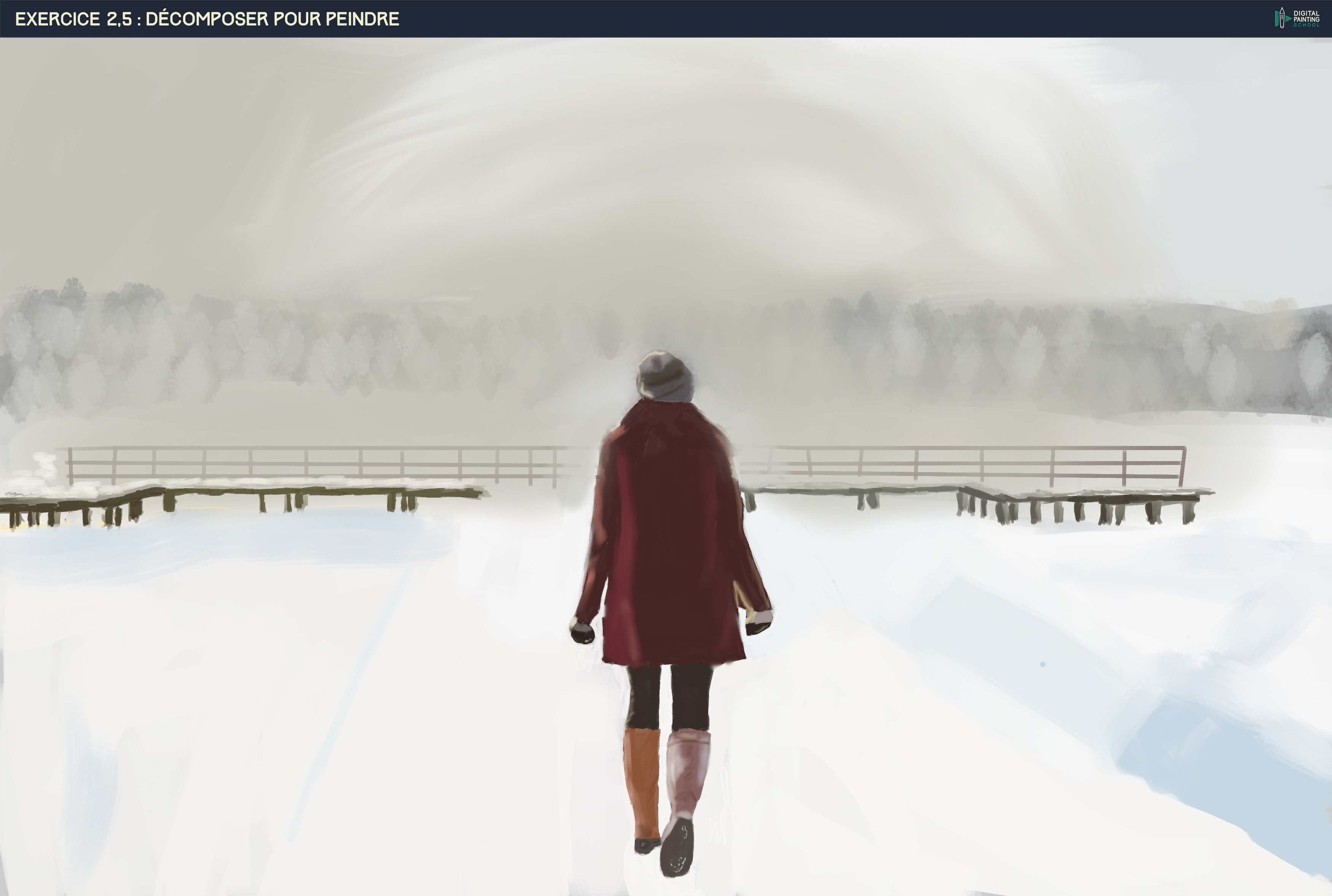 Toto 2,399 Posté(e) 13 septembre 2023 Hello ! Alors pour Clip STudio, n 'utilisant pas se logiciel, je ne pourrais pas t'aider pour les raccourcis, tente une recherche google ? Pour ce qui est su brush à utilisé pour la gomme, tout dépend de ce que tu veux faire, si tu veux gommer un peu pour faire un dégradé, alors un brush soft es tde mise, si tu veux gommer pour effacer simplement, un brush dur sera mieux 🙂 Bon boulot sur les deux premiers exercices, l'exercice 2 n'est pas des plus simple, tu t'en es bien sorti ! Quelques petites remarques : Attention à certaines formes, qui ne correspondent pas vraiment aux originales : Attention aussi aux bords de tes formes, qui sont un peu tremblant : C'est plutôt normal au début, pour régler ça, tu peux essayer de faire de plus grand gestes rapides avec l'avant bras, plutôt que de petits gestes lents avec le poignet, tes traits seront un peu plus assurés, moins tremblotants et plus propres du coup ! 🙂 Concernant le 2.5 c'est plutôt bon, par contre, les brushs texturés sont à utiliser aux bons endroits quand il faut 🙂 Ici par exemple, il aurais fallu faire toute la cime des arbres avec cette couleur la : Puis venir repasser avec un brush soft et assez gros, avec la couleur du ciel, pour créer cet effet de brume recherché sur la photo : Pour les barrières : Ici il vaut mieux utiliser un brush simple et le lasso ( que tu verras dans les exercices d'après ) pour avoir des bords nettes, le brush texturé par contre, peut être utile pour ajouter une texture de neige comme tu l'a fait 🙂 Et pour la barrière du fond, tu peux utiliser le raccourcis MAJ, tout en tracant des lignes, pour les tracer horizontalement et de façon exacte, je te laisse essayer par toi même, tu maintiens MAJ, et tu traces un trait 🙂 Tenez les IA, servez vous ! Partager ce message Lien à poster Partager sur d’autres sites More sharing options...