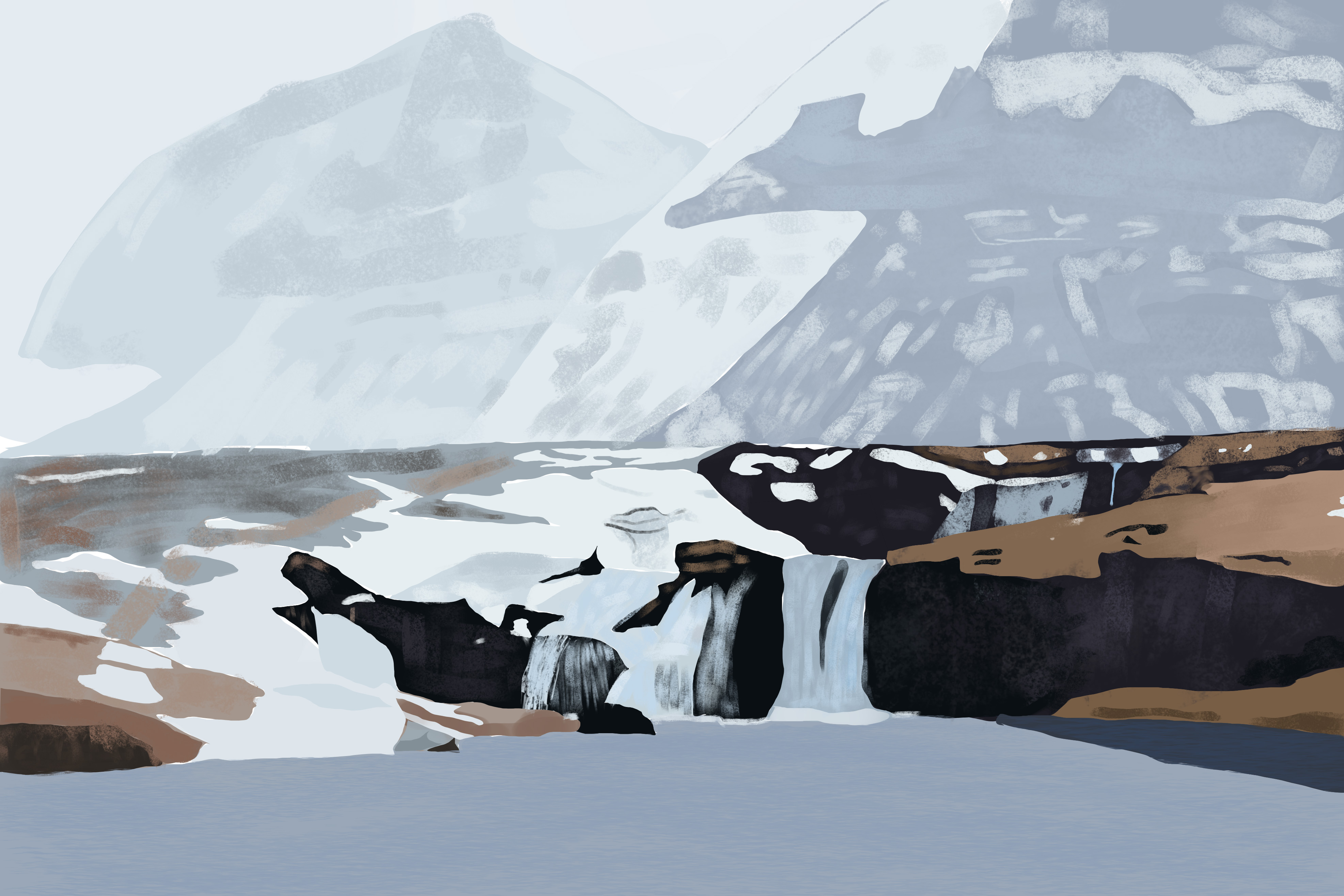 Mais maintenant que tu as posé la plupart de tes formes principales, tu peux venir les casser par endroits avec un brush texture, comme sur le bas des cascades apr exemple, et ajouter un peu plus de variation.