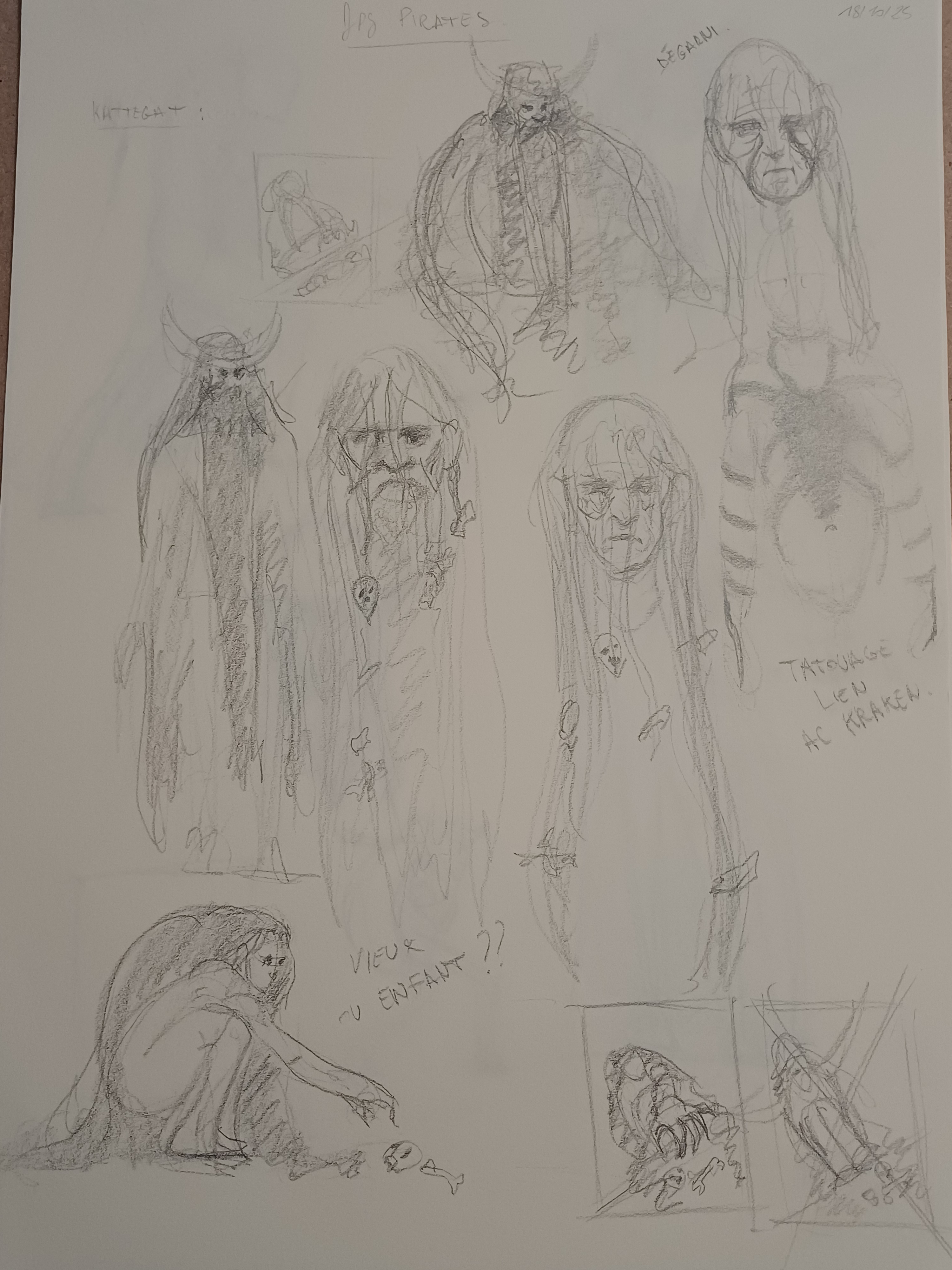 rastathopoulos 54 Posté(e) il y a 8 heures Salut à tous, Je me lance sur Kattegat et Long-Nez. Les Trolls et Lame-Bleue m'intéressent pas mal aussi, mais bon à voir si j'arrive déjà à finir mes deux lascars ahah Pour le ton, je vais partir sur quelque chose de plutôt réaliste (peut-être sombre, avec Long-Nez notamment), j'adore l'Histoire donc j'aime beaucoup m'en inspirer pour mes designs. Pour Kattegat, je me suis tout de suite dit qu'un pirate un peu mystique dans un équipage qui a un Kraken à son service, il y a possibilité qu'il y soit lié d'une manière ou une autre donc j'aimerai évoquer ça dans mon design avec un tatouage notamment. Je pense réaliser le perso en pleine transe, les yeux révulsés, des ossements et autres devant lui. J'ai la compo validée en tête (quelques pistes sur l'image) Pour Long-Nez, sa description m'a fait penser au Krampus donc je vais m'inspirer de ce monstre folklorique pour ce qui est de la silhouette du perso. Je ne sais pas si je le montre enlevant un enfant, ou alors pendant une de ses séances de torture. Encore aucune idée de la compo pour celui-ci ahah Voilà deux petites fiches d'idéation. C'est des croquis ultra brouillons mais j'aime bien commencer par des petits griboullis d'imagination pour dégager quelques idées avant de passer aux recherches de refs, etc ... Je vais en refaire quelques unes demain et surtout passer à la partie recherches. Bon courage pour le challenge 😉 Partager ce message Lien à poster Partager sur d’autres sites More sharing options...