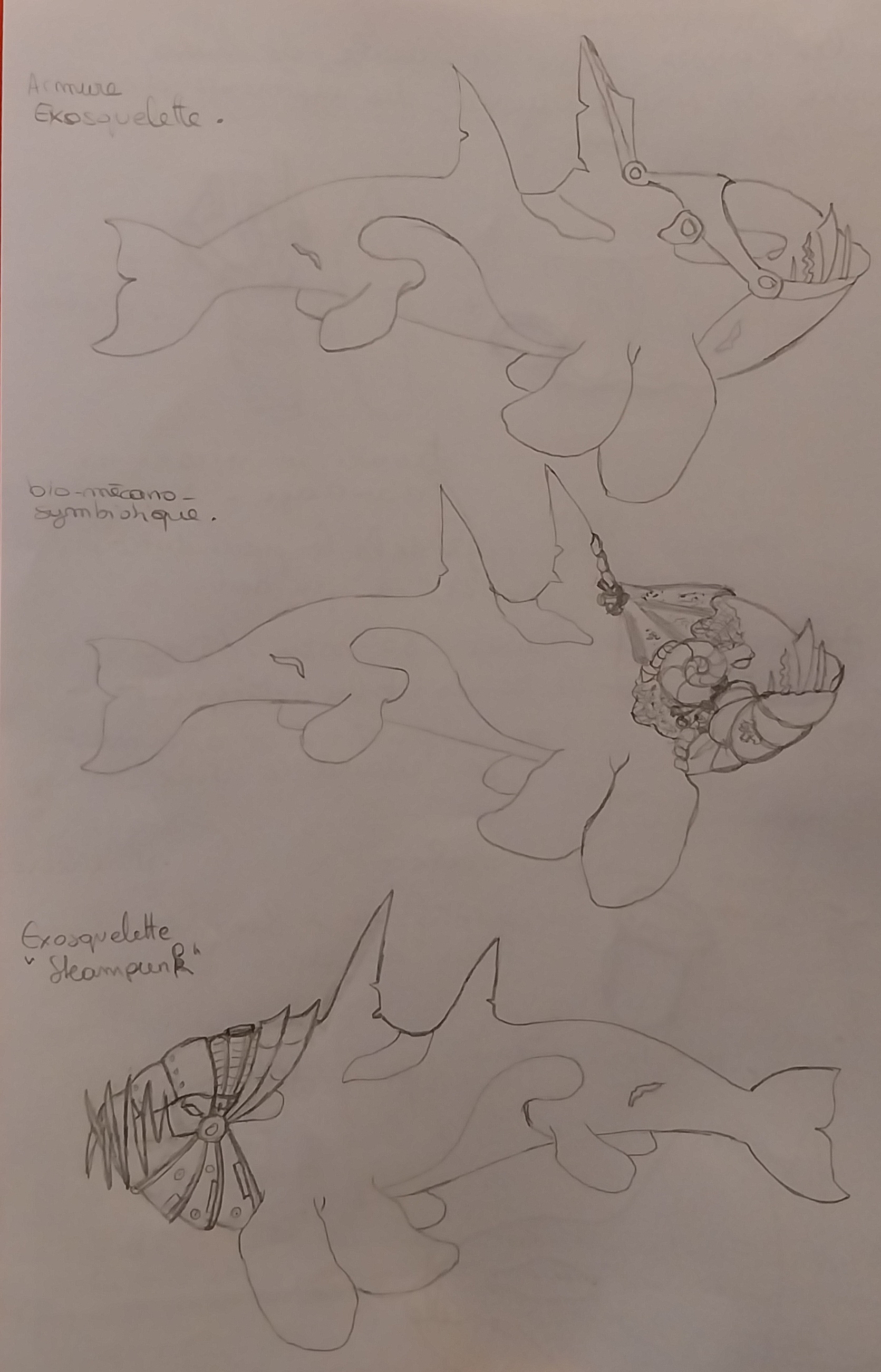 naurielle 15 Posté(e) il y a 45 minutes Bonjour à tous, Voici mes avancées du moment. Je suis partie sur l'équipement de l'orque Lames, Lùdr pour imaginer plusieurs pistes. Je ne sais pas si je l'ai précisé avant (je n'ai pas vérifié) mais je n'aime pas trop l'idée que les orques souffrent avec leur équipement, par rapport à mon style de dessin mais également par rapport au fait que pour moi le Capitaine Almar tient à ces orques qui lui donne sa puissance en combat. Beaucoup de questions là encore : quelles sont ces lames ? Des trophées des pirates vaincus, des éléments d'autres animaux, des coquillages, des lames d'os, ... ? Ensuite, comment ces lames peuvent-elles tenir dans la gueule de l'orque sans le blesser mais également sans les perdre ? ^^ Je suis partie d'une idée d'un dispositif qui pourrait se fixer dans le creux des dents et tenir les lames, ensuite je suis partie sur quelque chose comme un dentier, un exosquelette, un cyborg avec symbiose biologique (coquillage) ou bien quelque chose de plus tourné vers le steampunk. C'est avec le steampunk que j'ai laisser tomber l'idée des lames des pirates vaincus même si j'aimais bien cette idée... Je pense partir plus sur le côté steampunk avec le Capitaine Almar qui les commanderait depuis un sous-marin ^^. La encore j'aimais bien le côté symbiotique avec les coquillages (j'ais fait pas mal de recherche dessus pour savoir lesquels je pourrais utiliser, pour la réception des sons de la flute, pour la régénération, ...) mais ça fait moins terreur que la solution steampunk (même si je sais que j'en suis loin ^^). 1 Partager ce message Lien à poster Partager sur d’autres sites More sharing options...