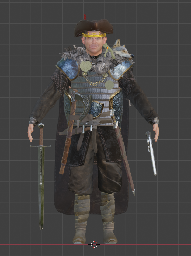 omnislash 7 Posté(e) il y a 9 heures Voici une vue du personnage, composé en grande partie avec des assets libres que j'ai re-scalé etc. Le visage est un basemesh, j'ai sculpté l'expression de sourire, et j'ai texturé avec une photo existante en 1024px. J'ai peint avec le texture paint de Blender autour des yeux et des oreilles. Partager ce message Lien à poster Partager sur d’autres sites More sharing options...