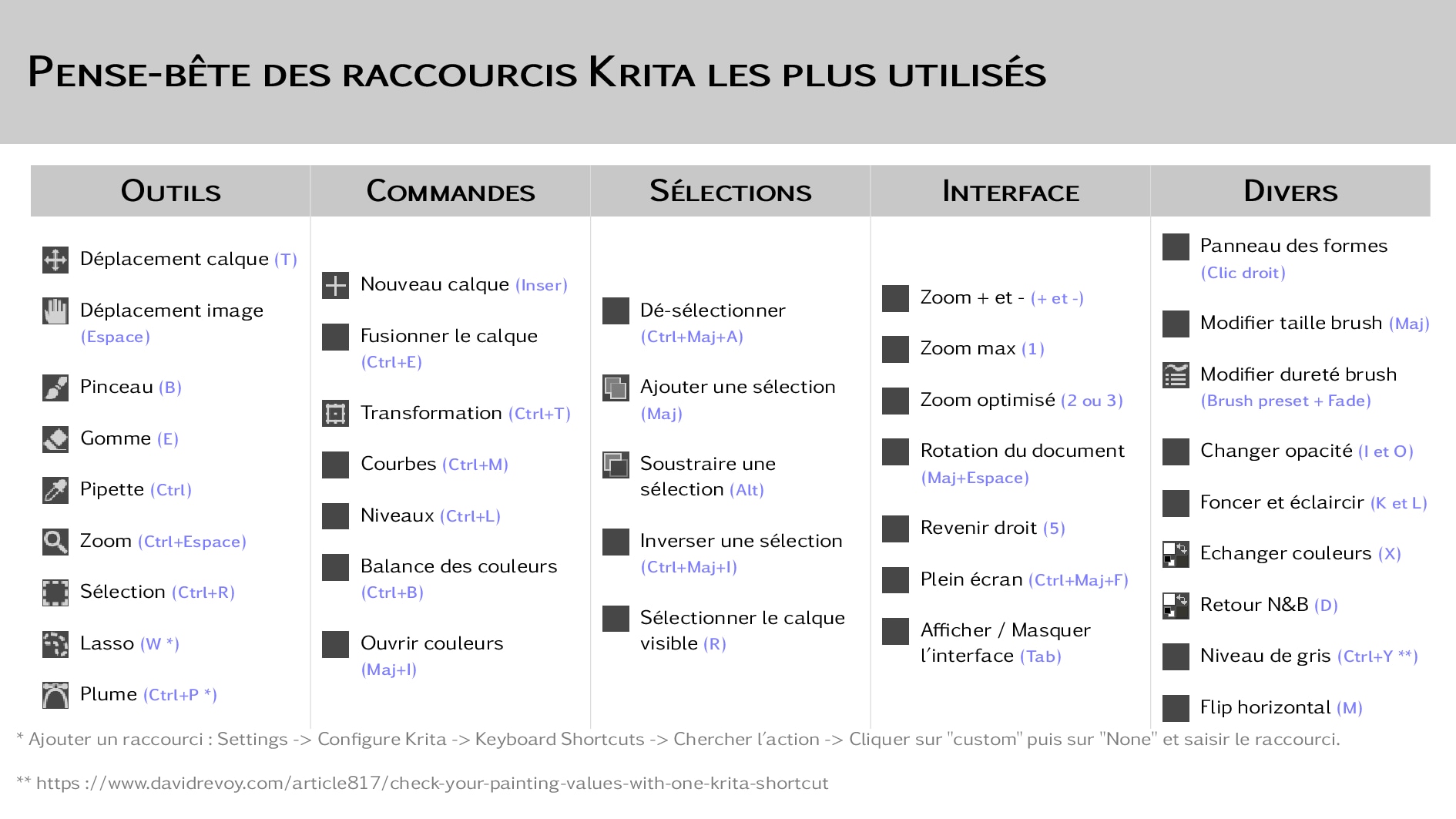 Il existe déjà plein de mémos sur les raccourcis sur Krita, mais ils sont souvent très détaillés pour des débutants comme moi, alors j'ai refais les feuilles de raccourcis que propose Spartan pour Photoshop et qui sont bien adaptés au début des cours. Je suppose que cela pourrait aider d'autres débutants alors vous les trouverez également joint à ce projet.
