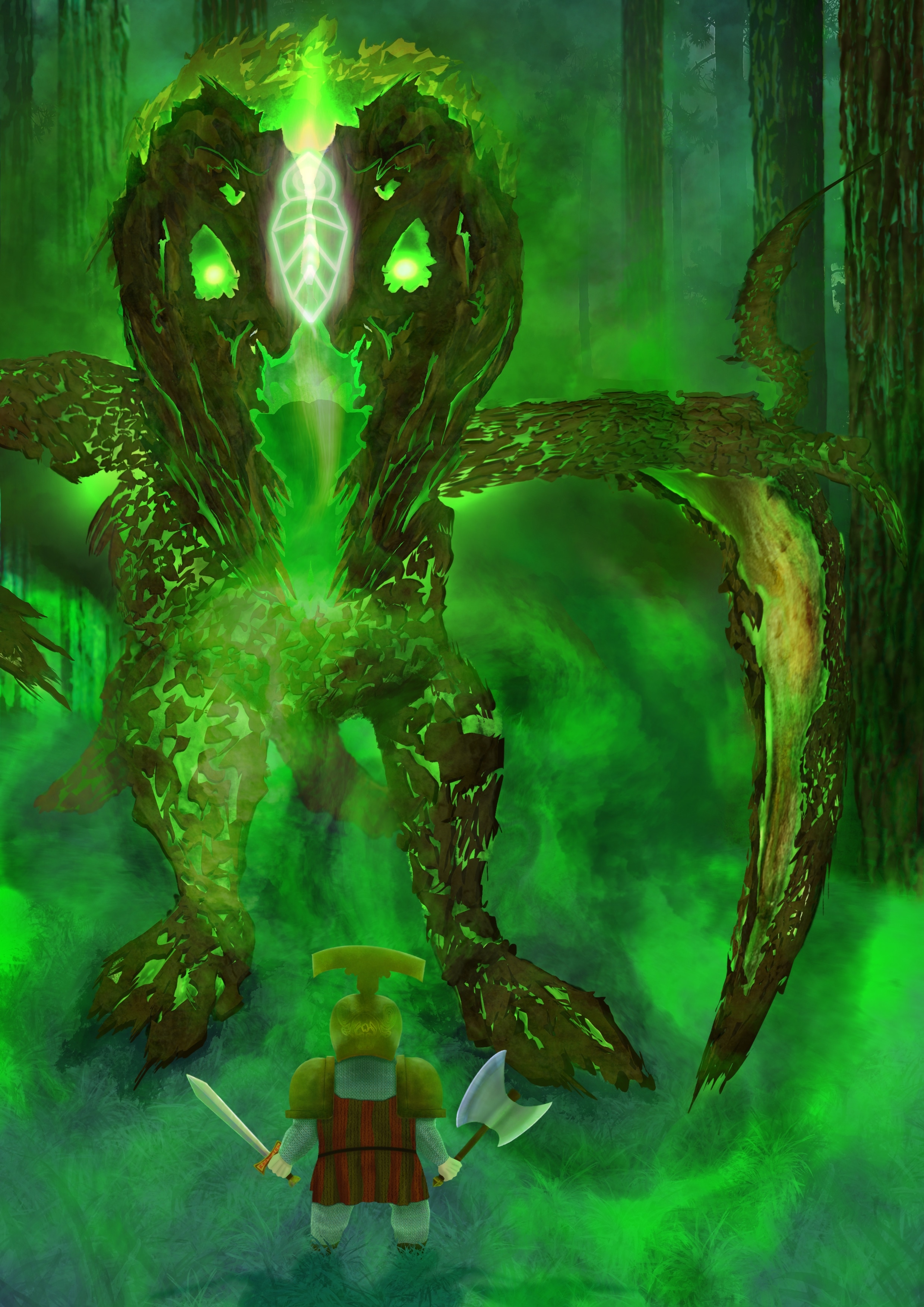 Au centre du front de la créature on voit un cocon, également lié à la renaissance. La fumée verte est comme l’alimentation de la créature qui fait renaître tout ce qui à été détruit. Le cocon au centre de son front est la source de cette énergie de renaissance. Son corps est également fait de morceaux d’écorce, issus des destructions.