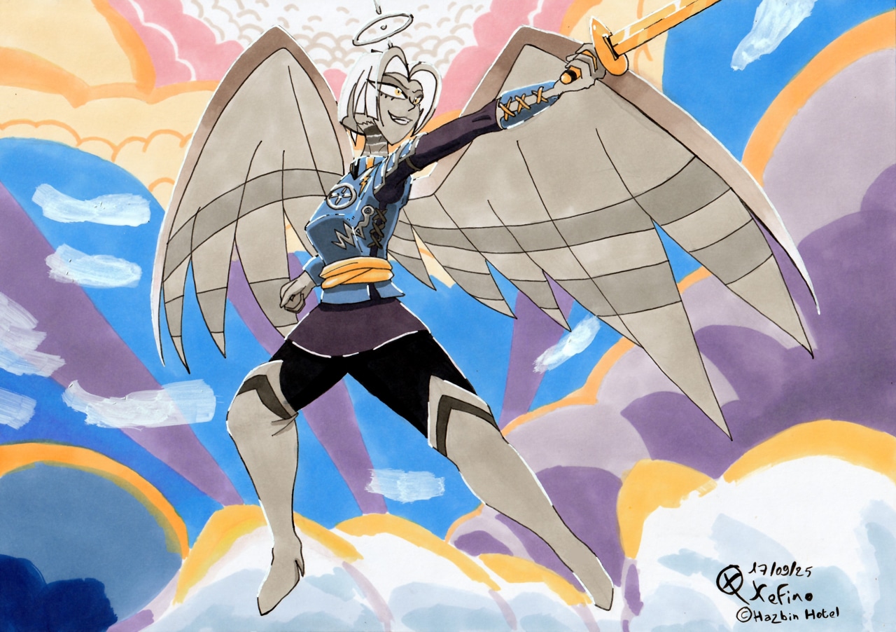 Il s'agit de Lute, une ange de Hazbin Hotel qui aurait été (selon la fan fic) soigné par dieu et équipé d'une nouvelle armure.