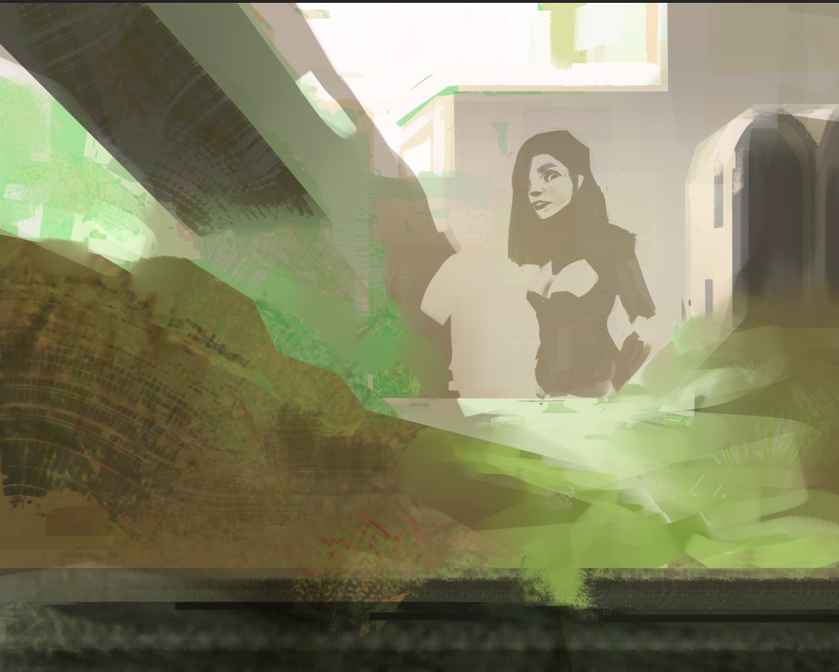 Hello, enfin un WIP 🎉 le personnage sur la façade est sur un calque en écrêtage, comme ça je pourrais continuer a travailler dessus et mieux l'intégrer au bâtiment. Je pense ajouter un peu de vie autour aussi.