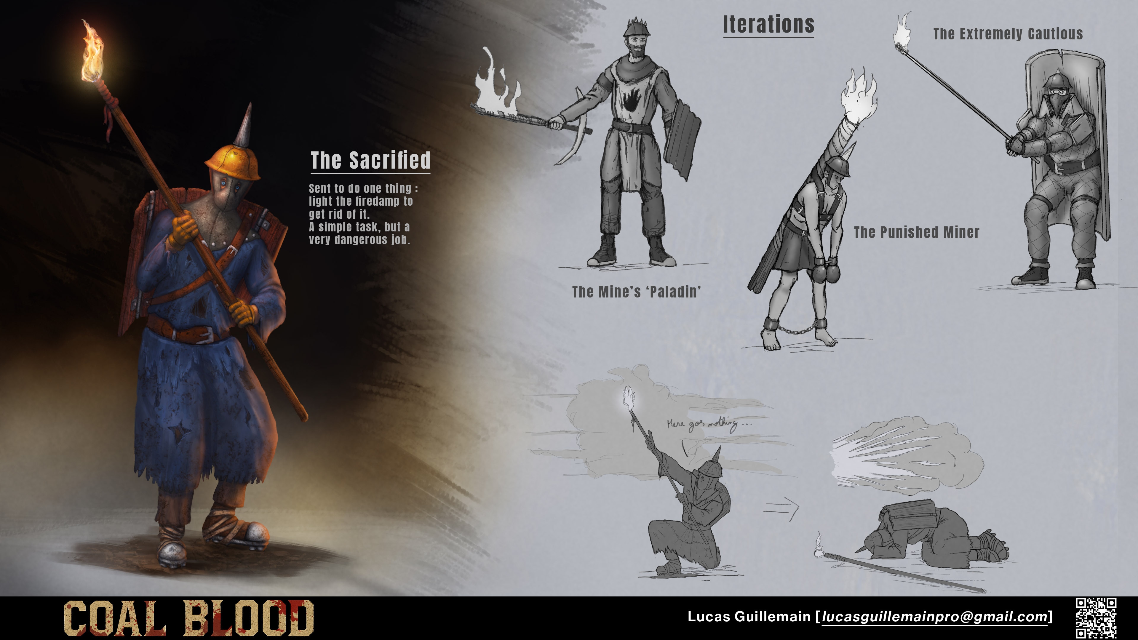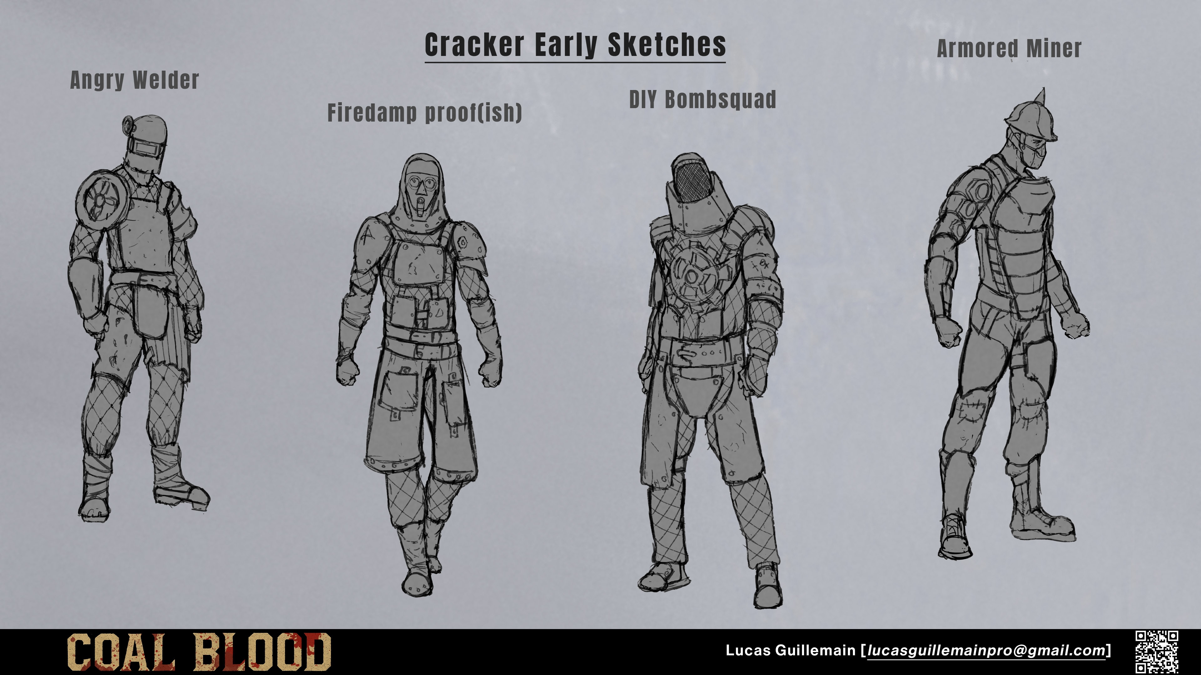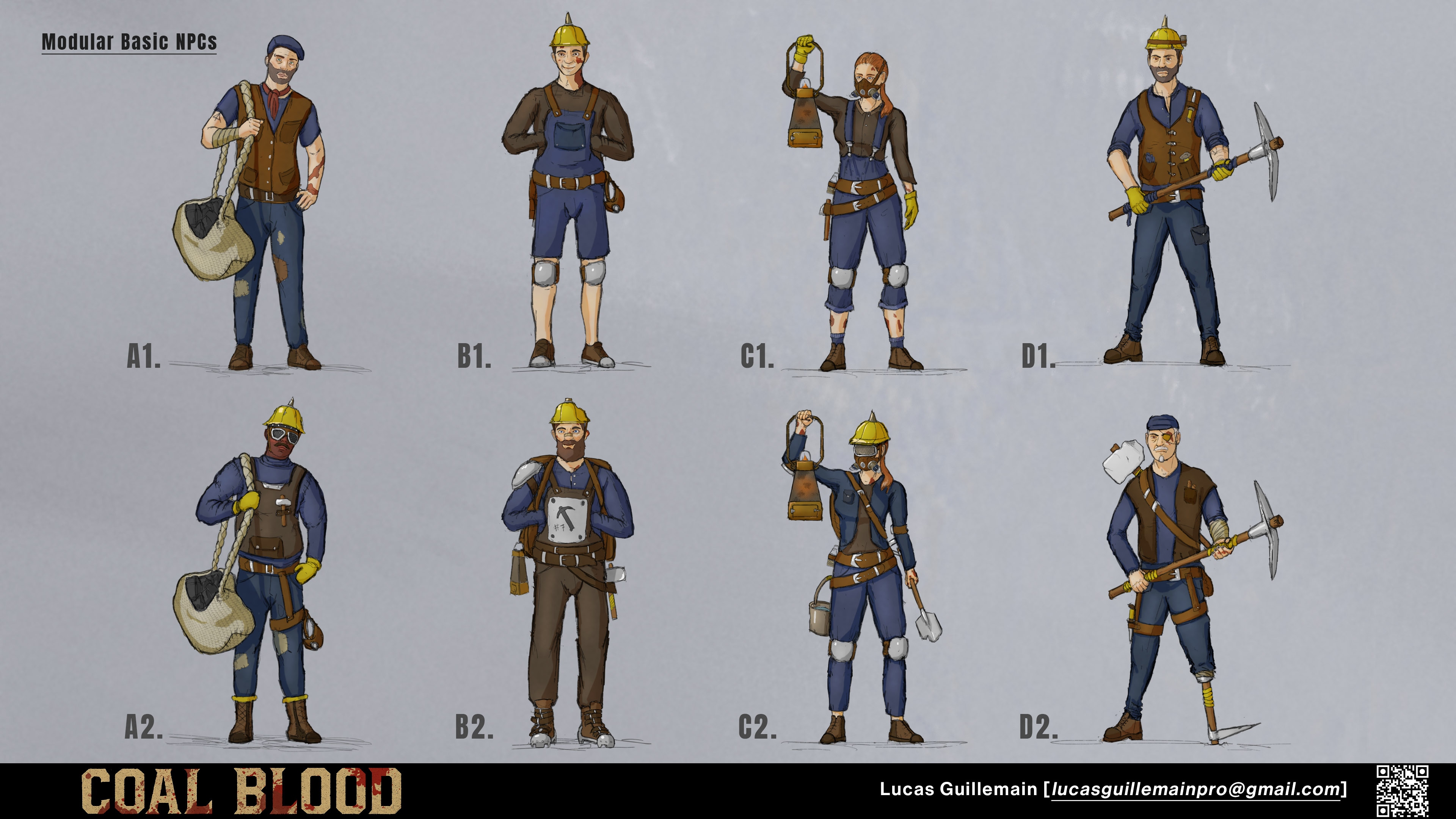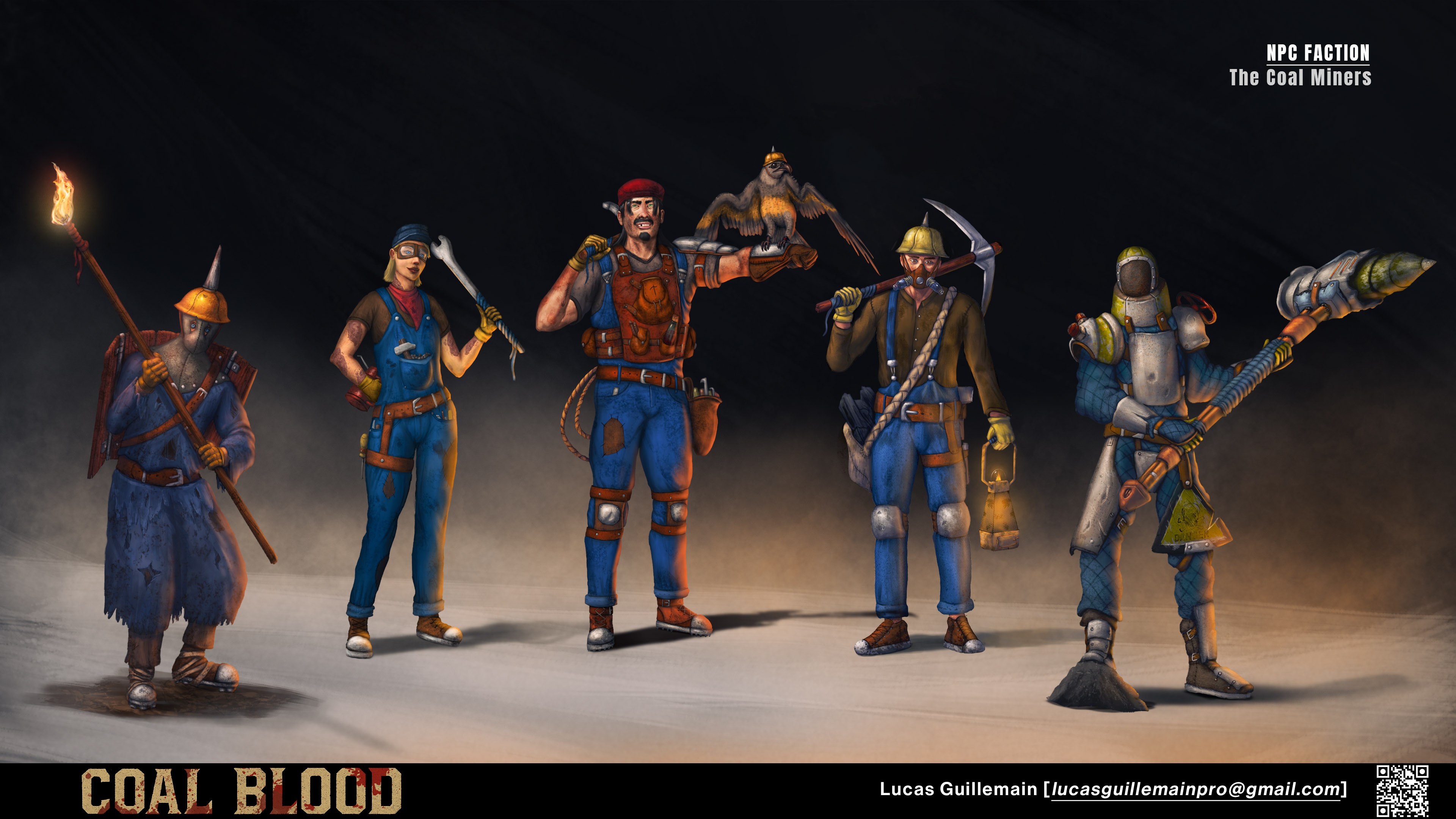 Ici l'idée était de faire le design de toute la faction qui s'occupe d'exploiter le charbon, les mineurs (logique :D). Ca me permet de me faire un peu la main sur le process, et ça me permet de continuer à pas mal apprendre au niveau des fondamentaux encore !