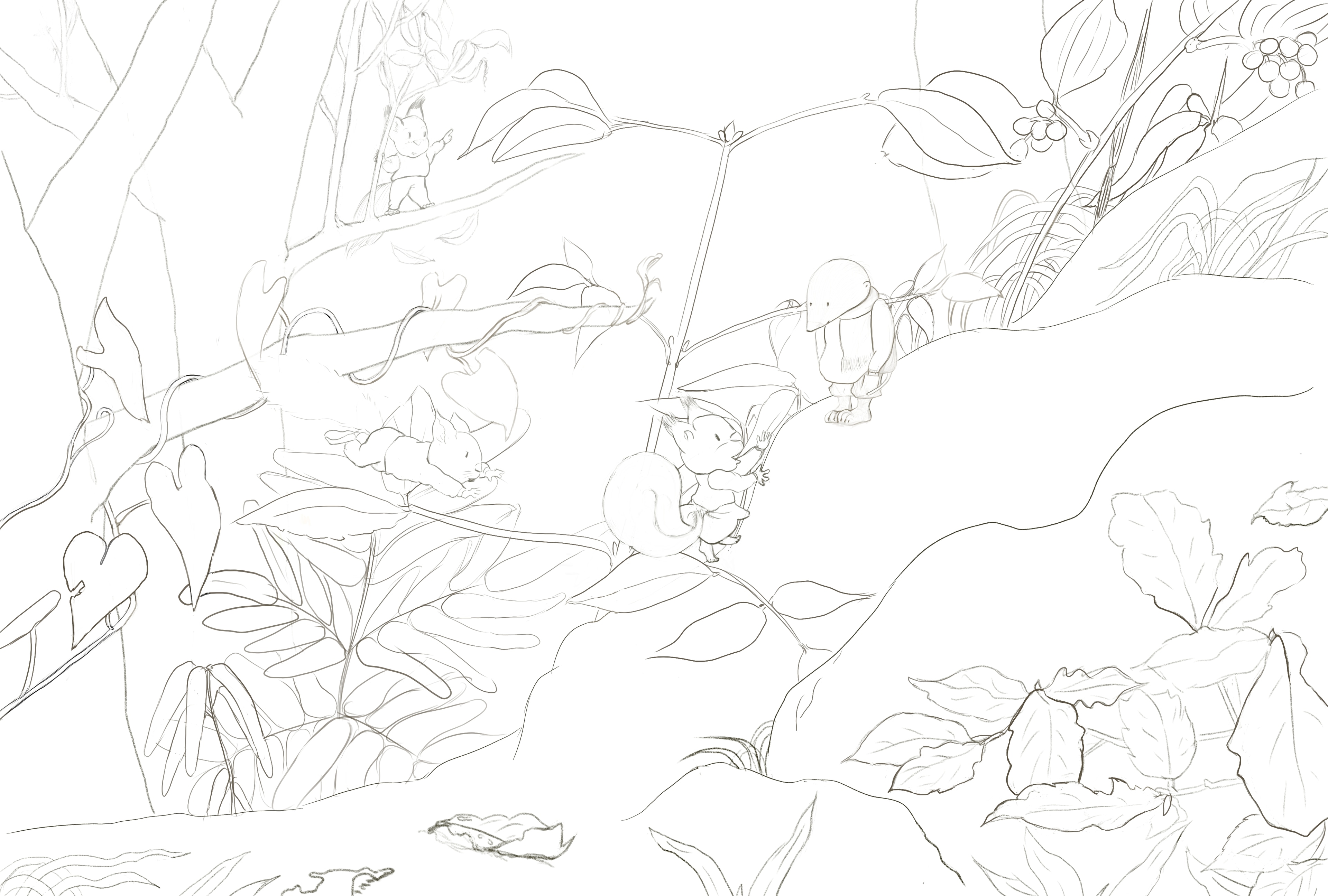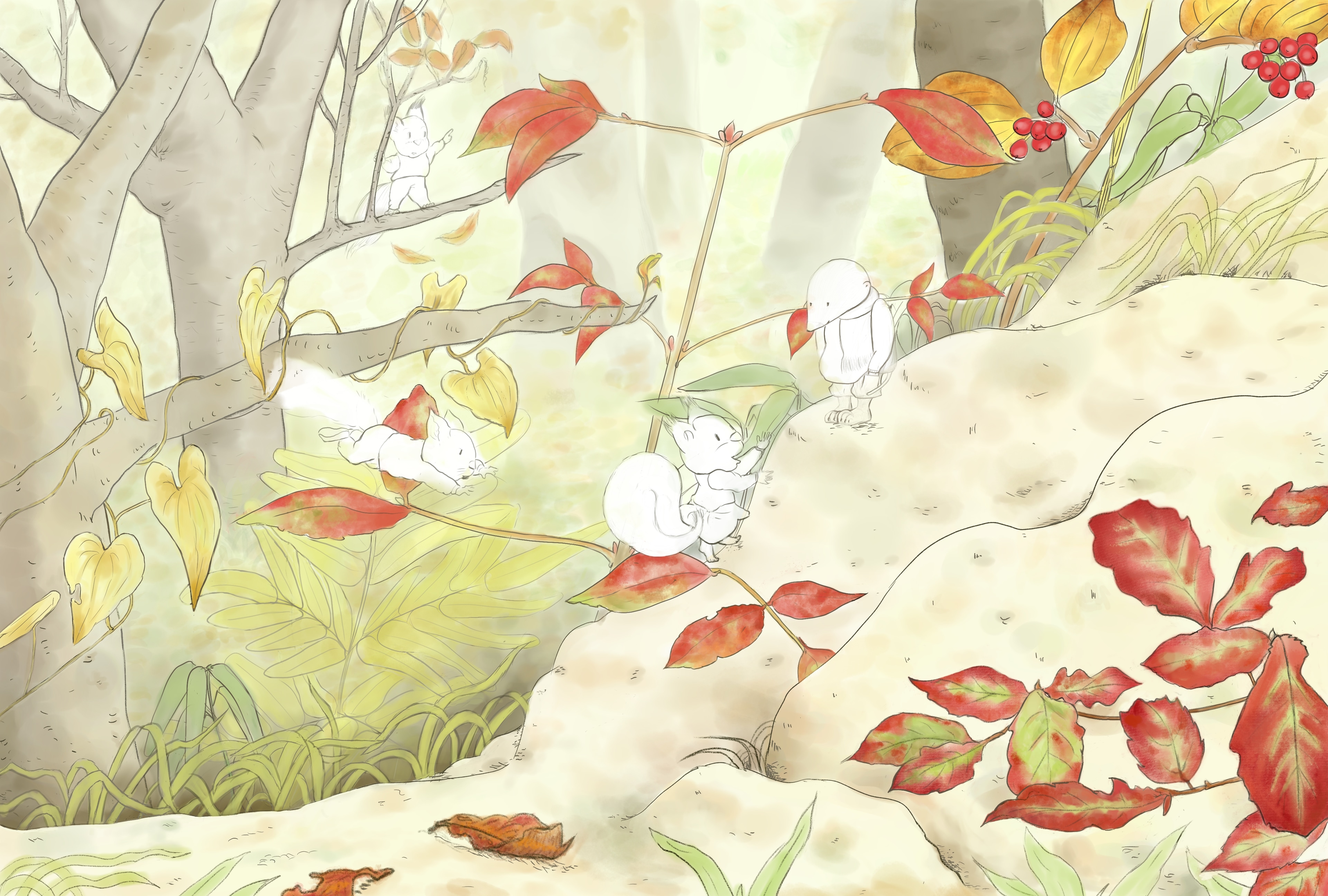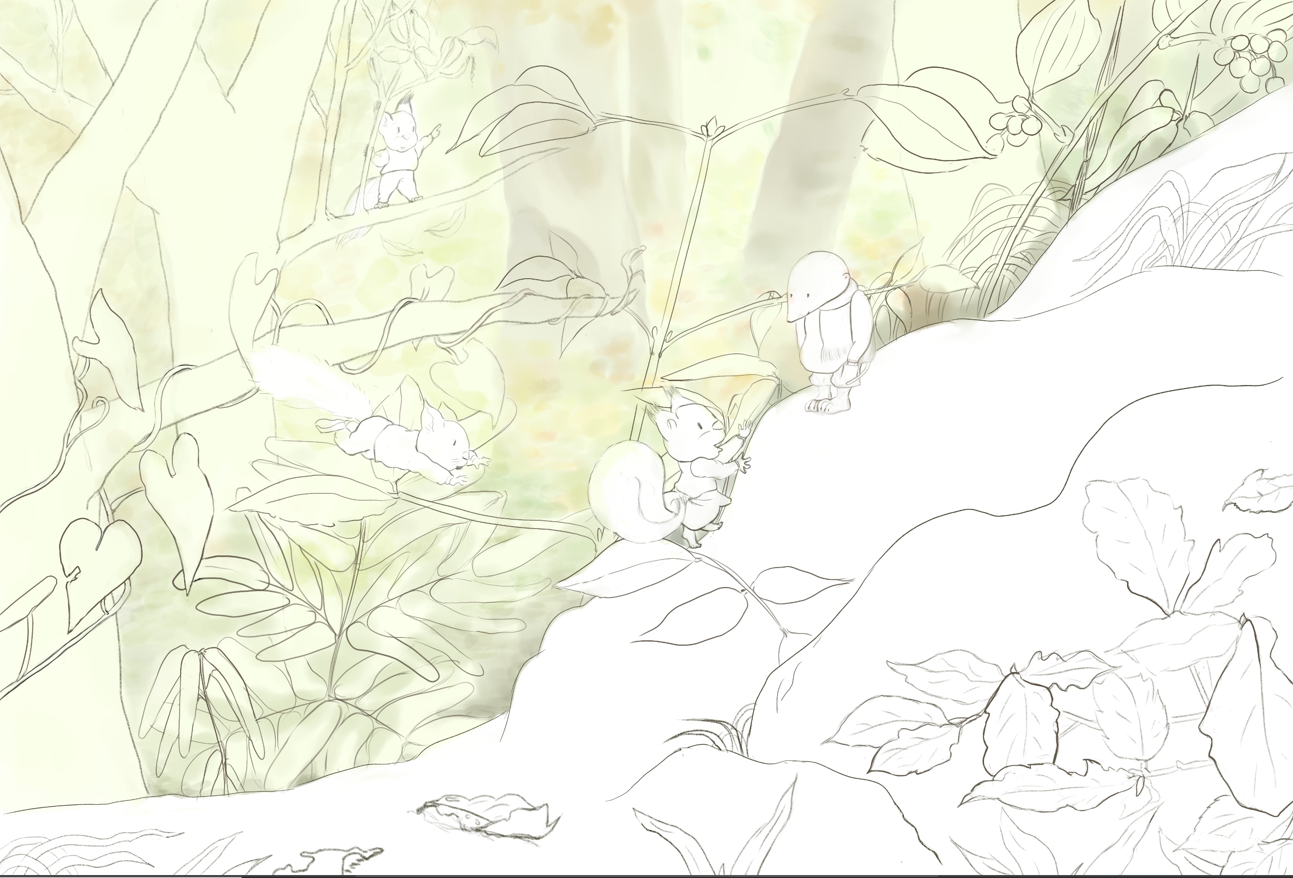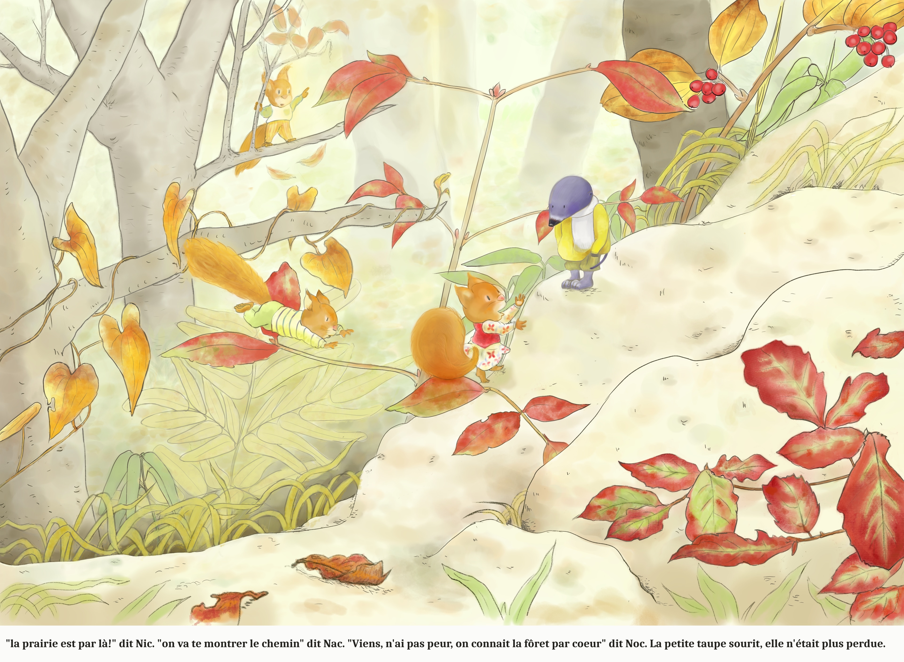 défis du mois de septembre 2025 : inventer un personnage dans un univers. J'ai inventé le personnage d'une petite taupe perdue, dans l'univers d'Iwamura (que je vénère). Ici ce sont Nic Nac et Noc les jumeaux écureuils qui vont à sa rescousse. J'ai pris plein de ref d'iwamura (j'ai beaucoup d'ouvrage de lui) et j'ai créé ce décors. J'ai mis une bande de texte, dans son style, toujours assez descriptif et succins, sous les illustrations qui sont généralement en double page. Je ne suis pas sure de sa technique mais je pense qu'il fait les contours au feutre fin, puis aquarelle. J'ai essayé de rendre cet aspect. Je me suis beaucoup amusée !