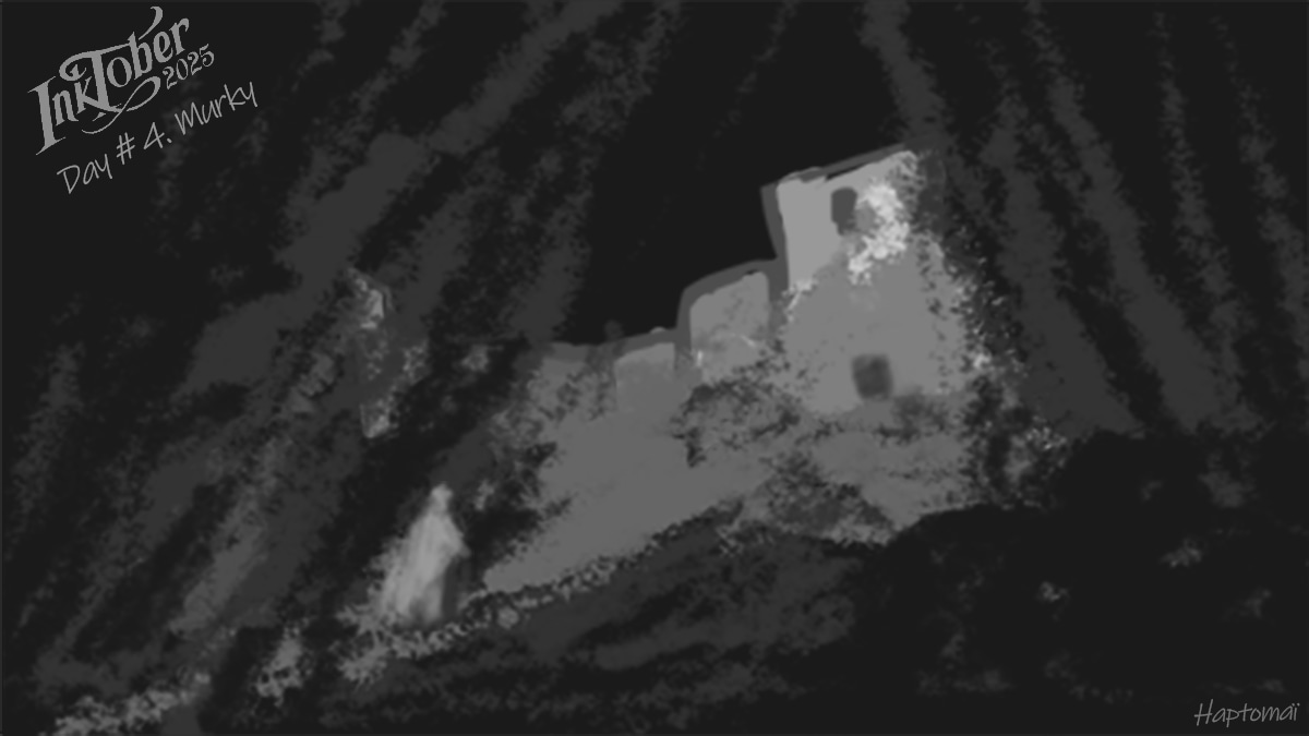 Un thumbnail en niveaux de gris pour travailler la composition : un personnage remonte un chemin oppressant, encadré par les arbres, vers un château inquiétant.