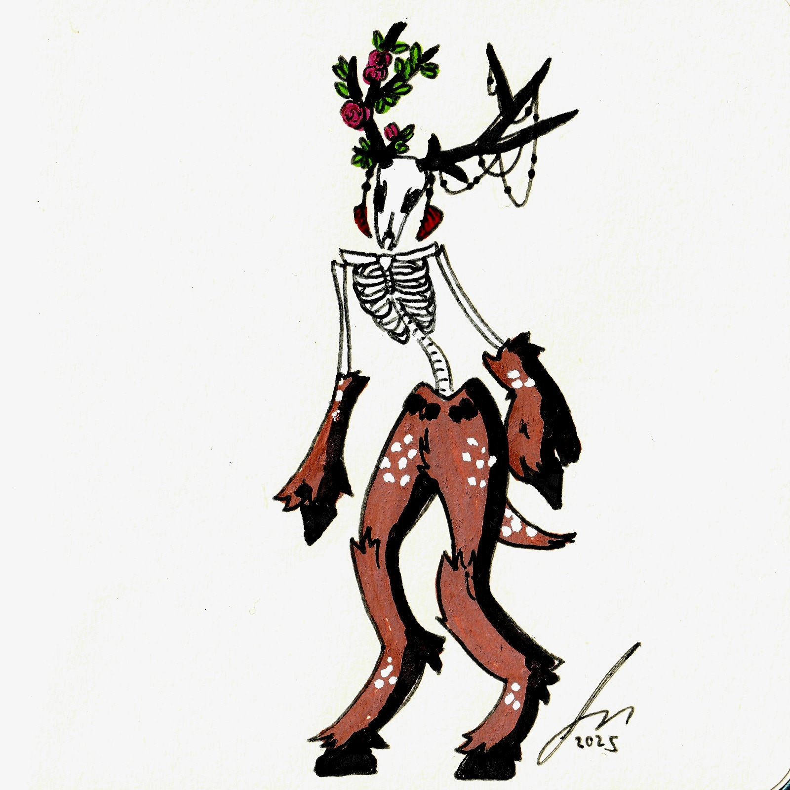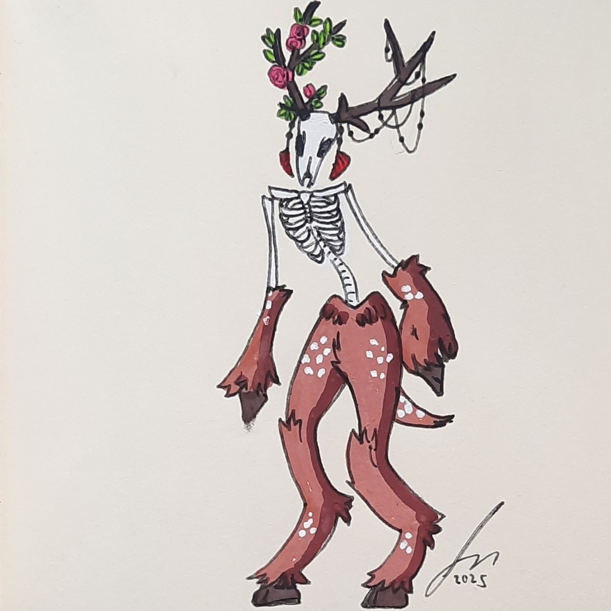 Concernant le dessin lui-même, le prompt était "Esprit de la forêt". J'ai pensé à plusieurs types d'esprits plus ou moins classiques, mais le cerf m'est vite apparu comme un bon choix. Je voulais le représenter grand et fin, squelettique, avec des membres trop lourds pour lui qui pendent le long de son corps. Je ne voulais pas non plus d'un monstre effrayant : mon esprit de la forêt devait aussi être un être protecteur. J'ai donc opté pour une créature mi-morte mi-vivante, avec un bois fleuri et l'autre parsemé de toiles d'araignées ou autre corde naturelle inerte, et à chacun d'eux pend un talisman fait d'une plume rouge.