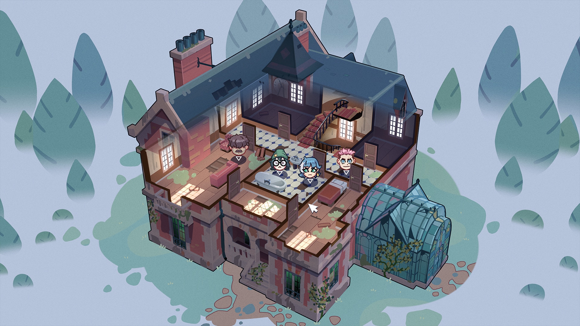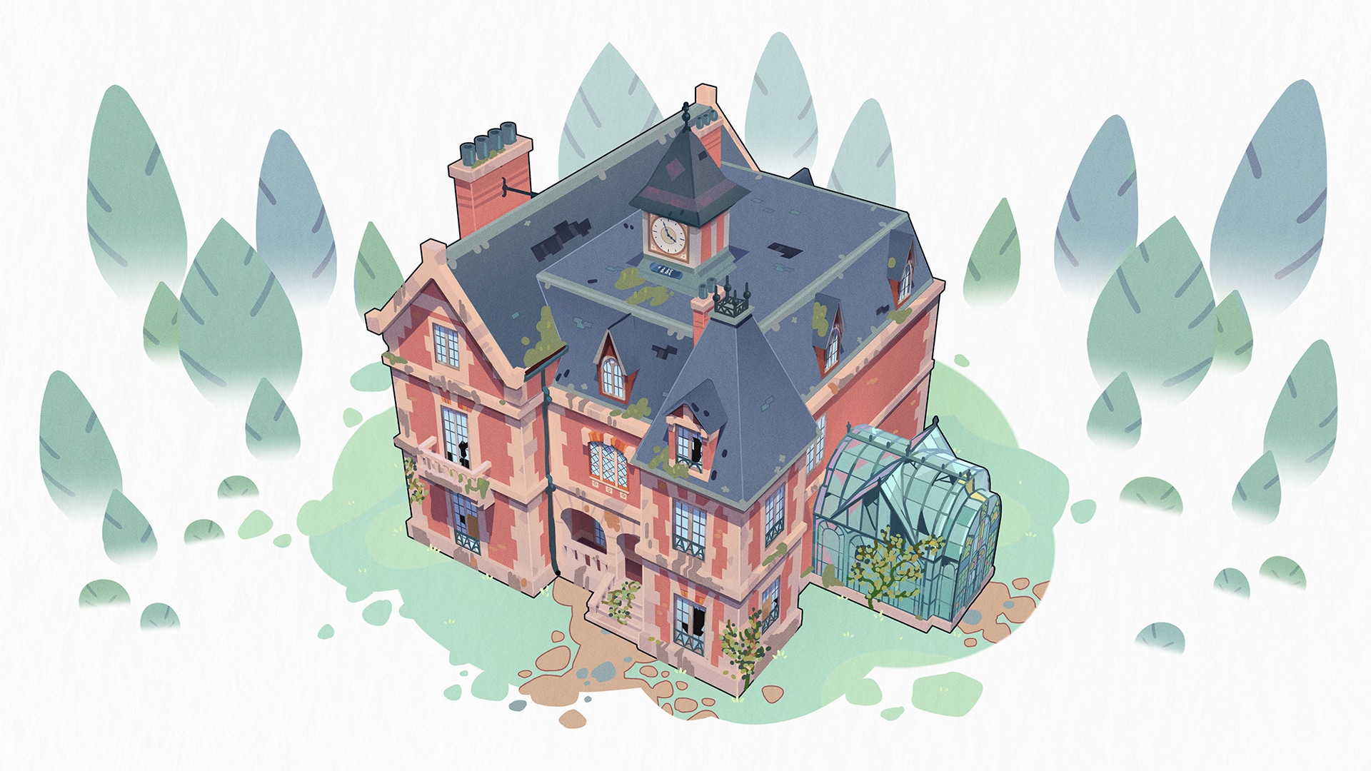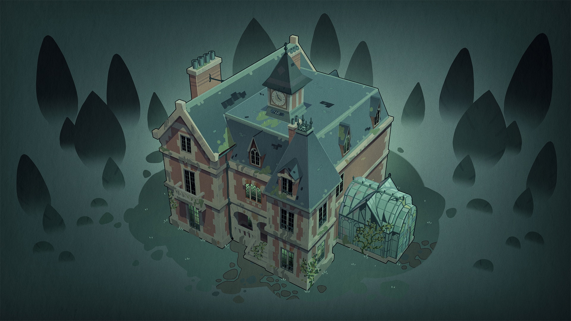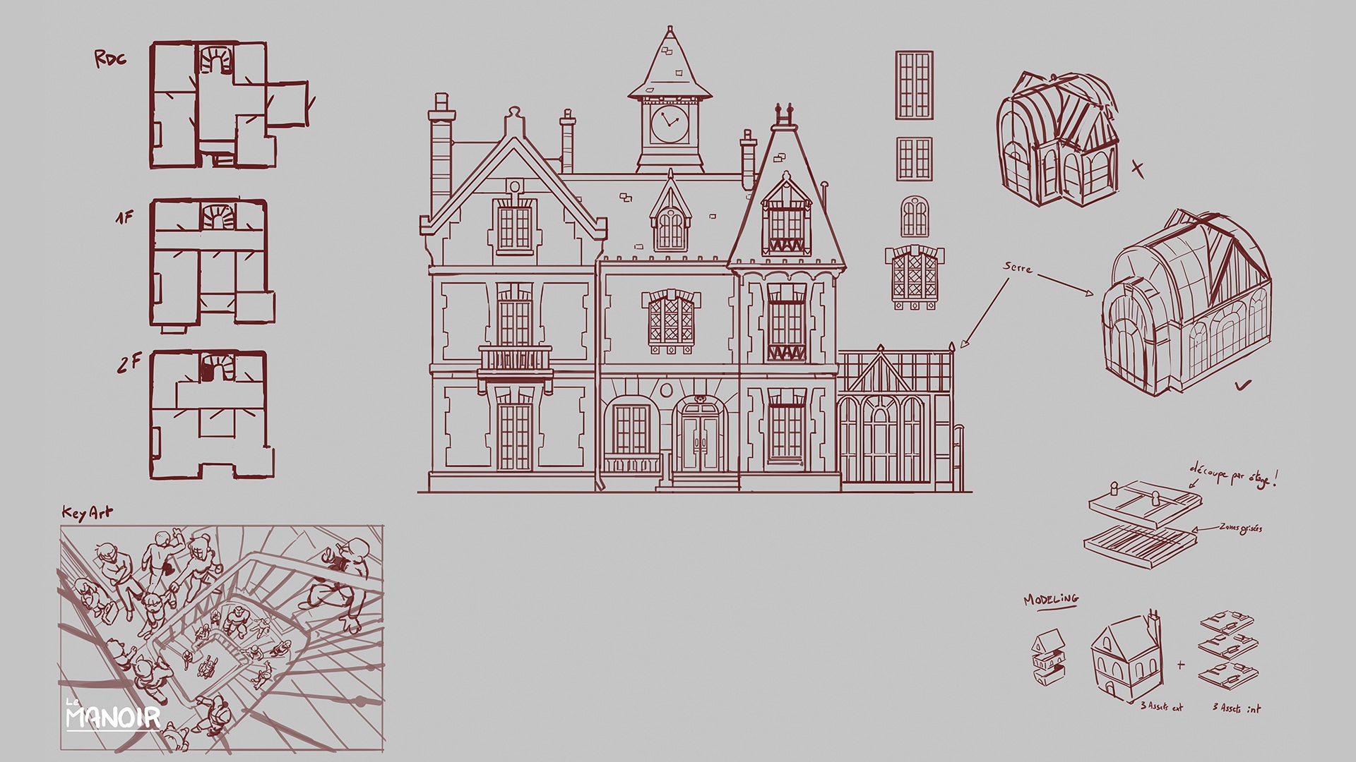 Ici c'est l'équivalent du plateau de jeu, qui était une sorte de jeu d'enquête façon Cluedo en solo mais sur plusieurs époques. J'avais commencé par faire le design du manoir de face avant d'en dessiner le plan intérieur puis de le modéliser grossièrement en 3D pour référence.