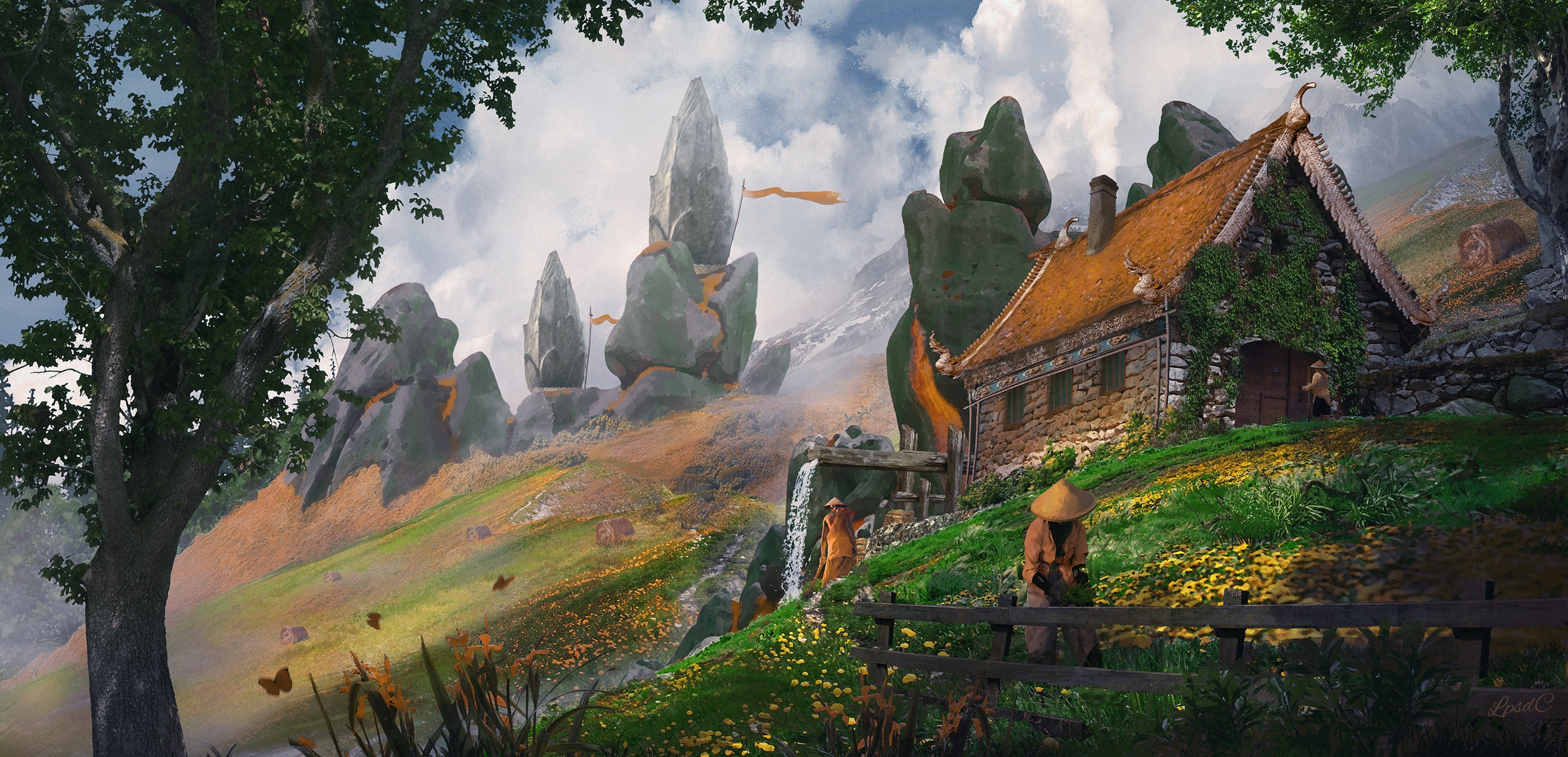 Combien d'heures as tu passer dessus ? c'est incroyable comment tout fait naturel et j'adore ça c'est rien que la végatation contre la paroie de la maisonée ca a du te prendre un temps fou non ? En tout cas beau travail j'aime le rendu et l'harmonie des couleurs