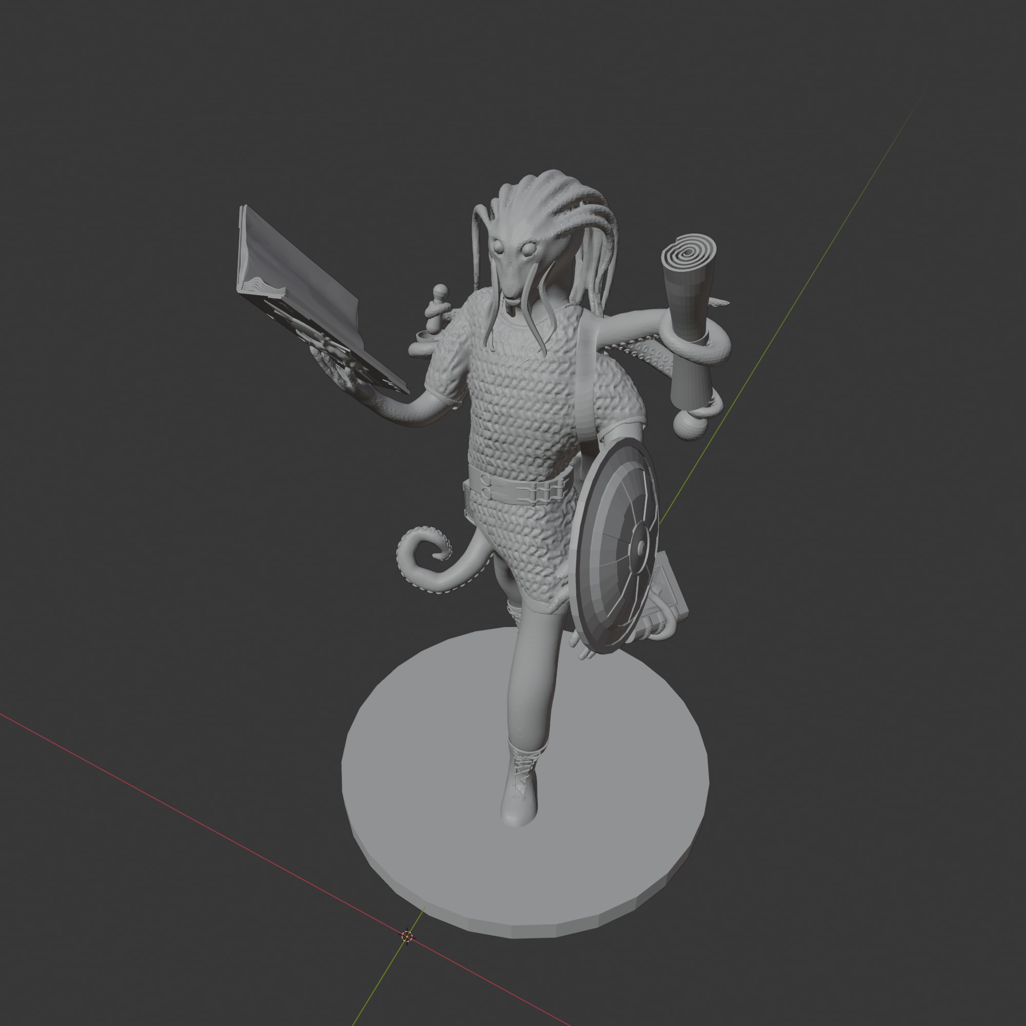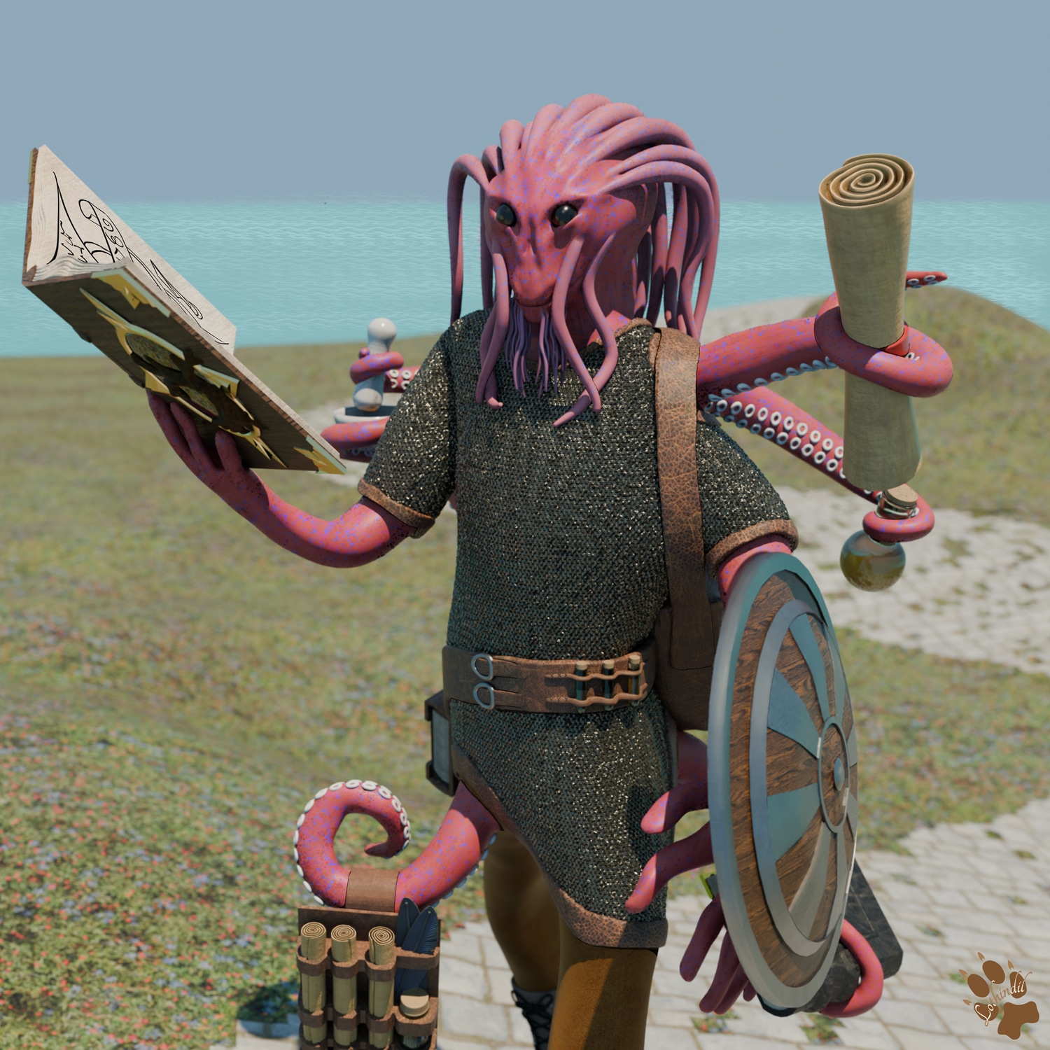 Le personnage est un poulpe de taille humaine -un océmion-, capable de marcher et de vivre hors de l'eau. Celui-ci est un alchimiste, portant un bouclier et une cotte de maille et fasciné par les livres, beaucoup plus que par les autres créatures.