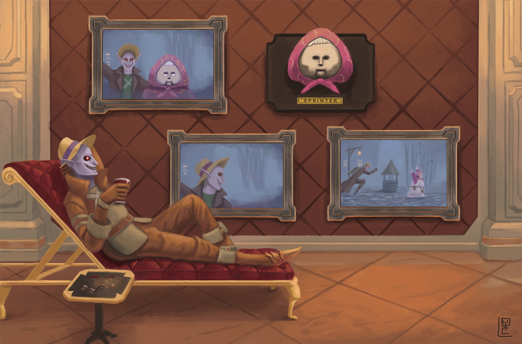 Image réalisée pour le "art contest" de "Vrising" un jeu de vampire où il faut sucer du sang, construire un château et éviter le soleil et l'ail.