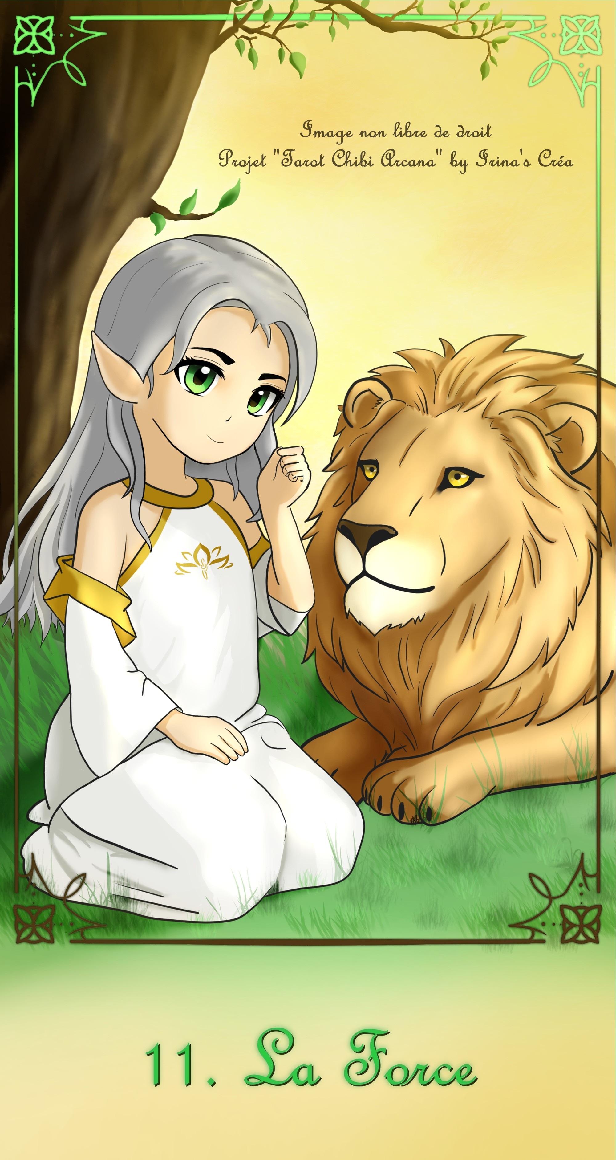 Dans le Tarot Chibi Arcana, La Force prend la forme d’une jeune elfe aux cheveux d’argent, assise auprès d’un lion majestueux.