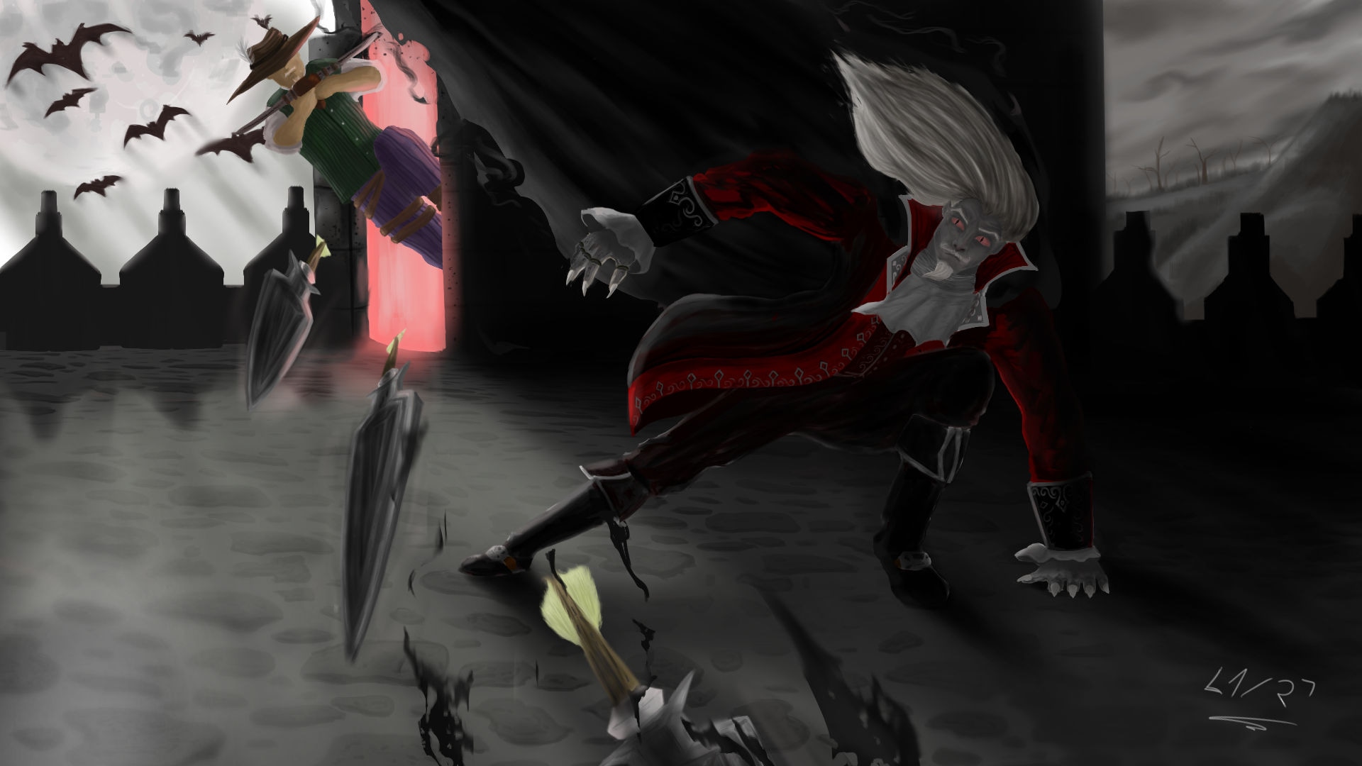 Bonjour à tous, j'ai commencé récemment le digital painting et voici ma 1ère création. J'ai décidé de le faire sur le thème de Dracula, en mettant en scène Dracula, au sein de son château, fuyant un chasseur avec son arbalète.