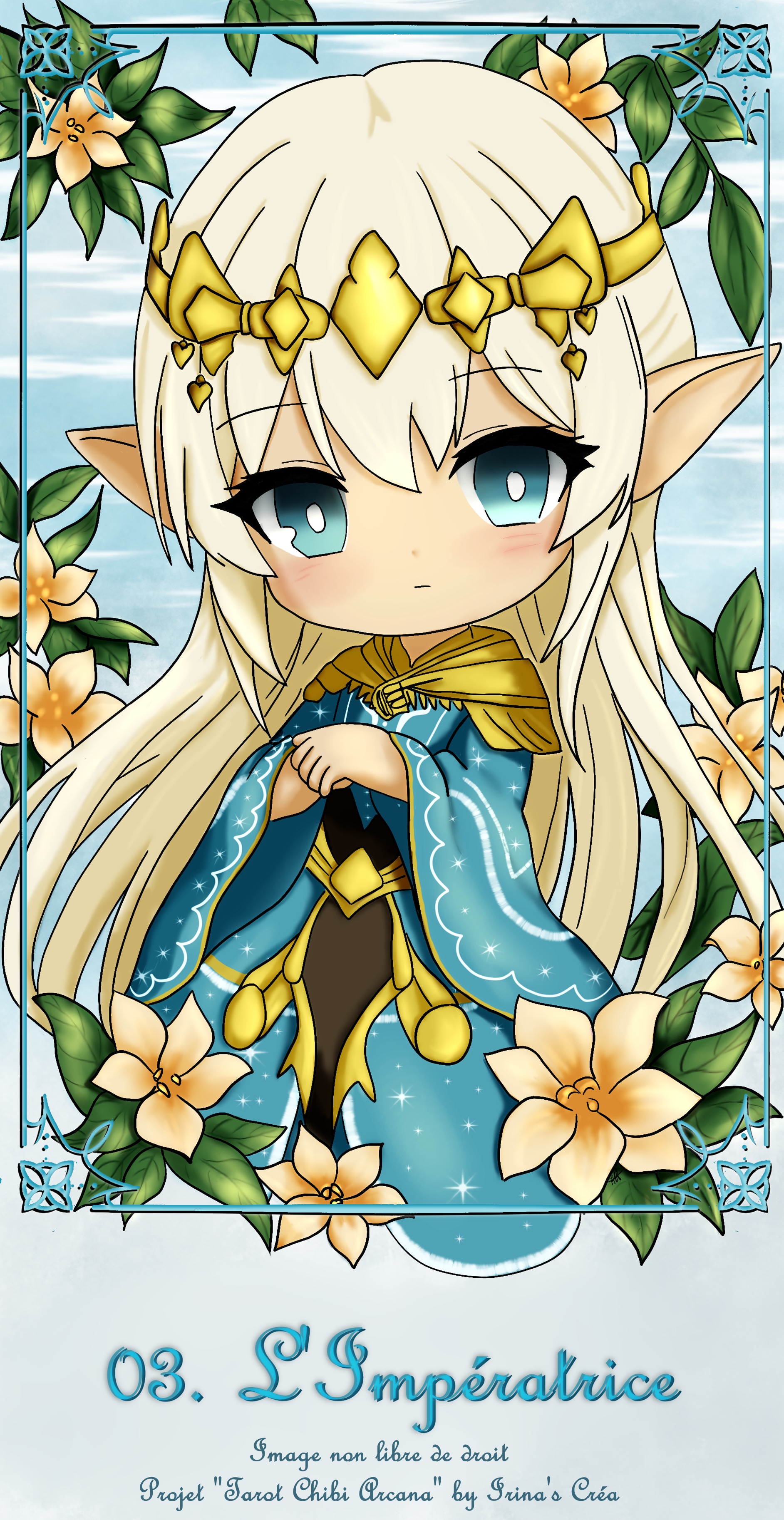 Dans le Tarot Chibi Arcana, cette carte prend les traits d’une douce souveraine entourée de fleurs lumineuses.