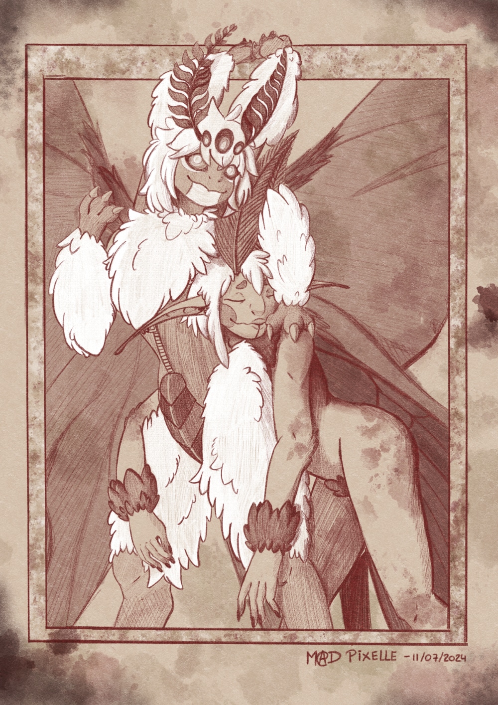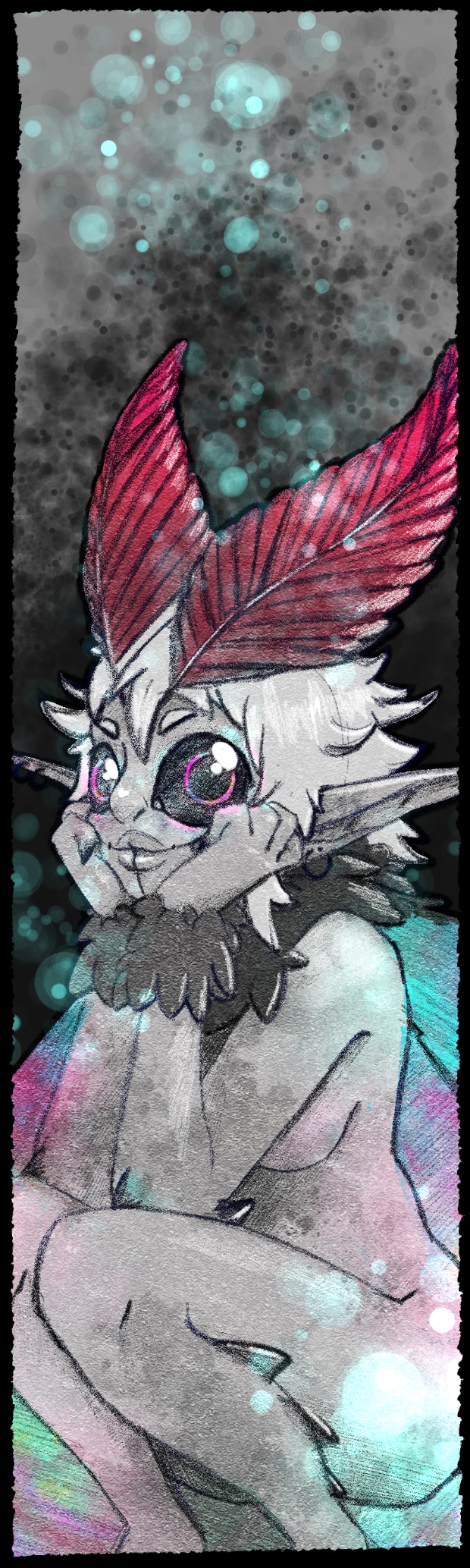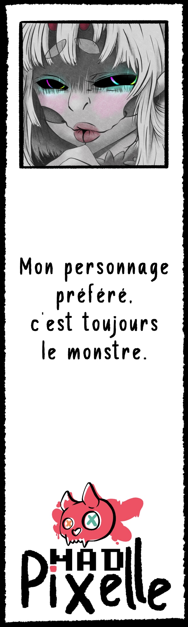 Ce personnage était à la base crée pour un jeux de rôle mais j'ai détesté le jouer alors que je l'adore en tant qu'entité ! Du coup j'en ai fait un pnj et un oc. Je voulais que son physique soit à la fois attirant et effrayant lorsqu'on y fait un peu plus attention. C'est l'une des première refsheet que j'ai fait en 2024, je venais de me lancer pour de bon en tant qu'artiste digital pro et je trouve ça incroyable de voir l'évolution que j'ai eu depuis.
