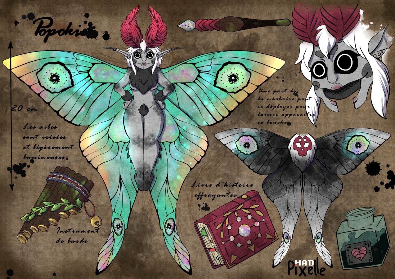 "Popoki est une barde de l'illusion, elle utilise les motifs de ses ailes irisées et sa magie pour attirer de pauvres voyageurs vers le danger afin de trouver l'inspiration pour son recueil d'histoires effrayantes. Un jour elle leur montrera à quel point sa plume est aiguisée en devenant le plus grand maitre de l'horreur !"