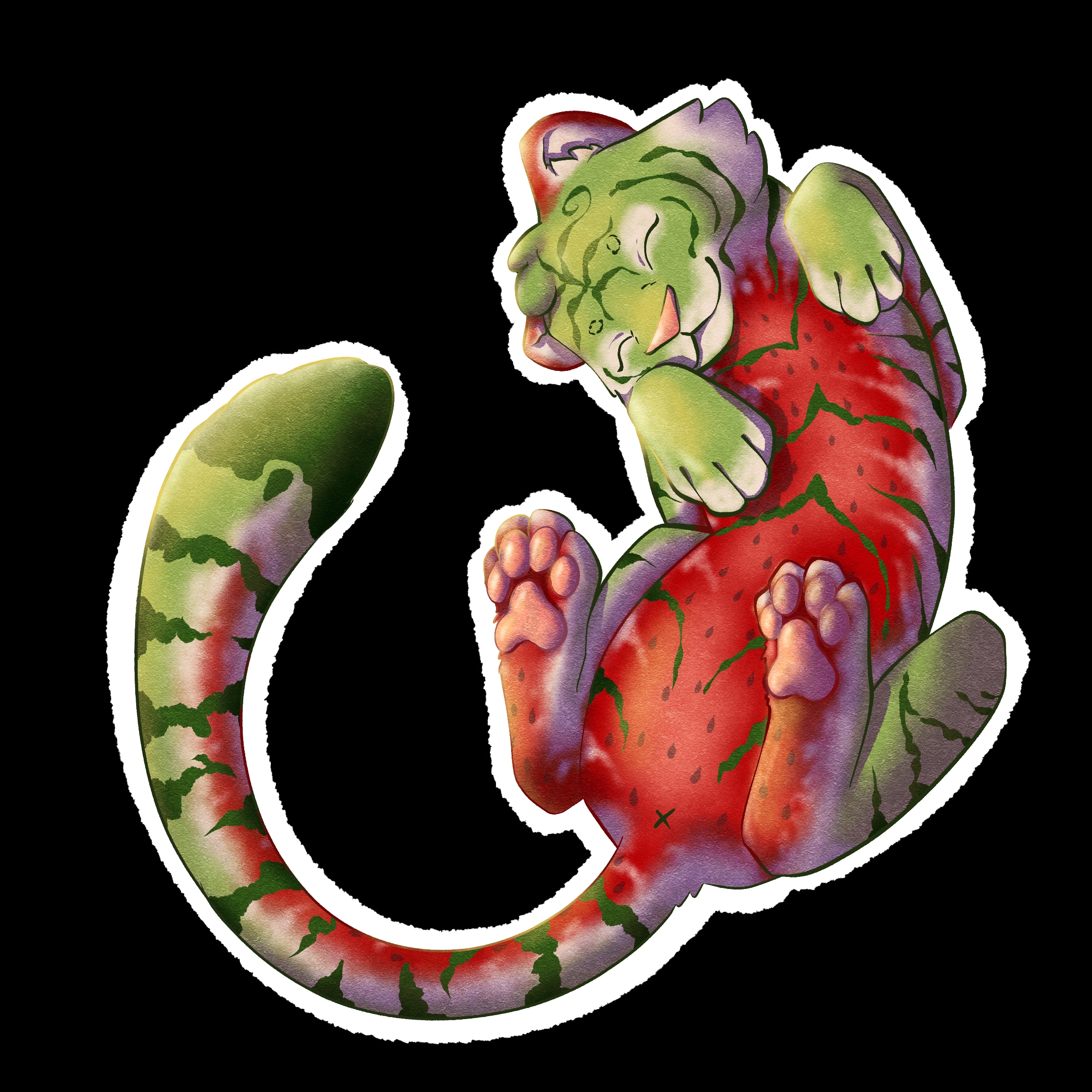 C'est le premier atelier au quel j'ai participé sur le Discord ! On devait fusionner objet et animaux au hasard, j'ai eu le tigre et la pastèque. Je le trouve adorable même si il y a quelque soucis anatomiques.
