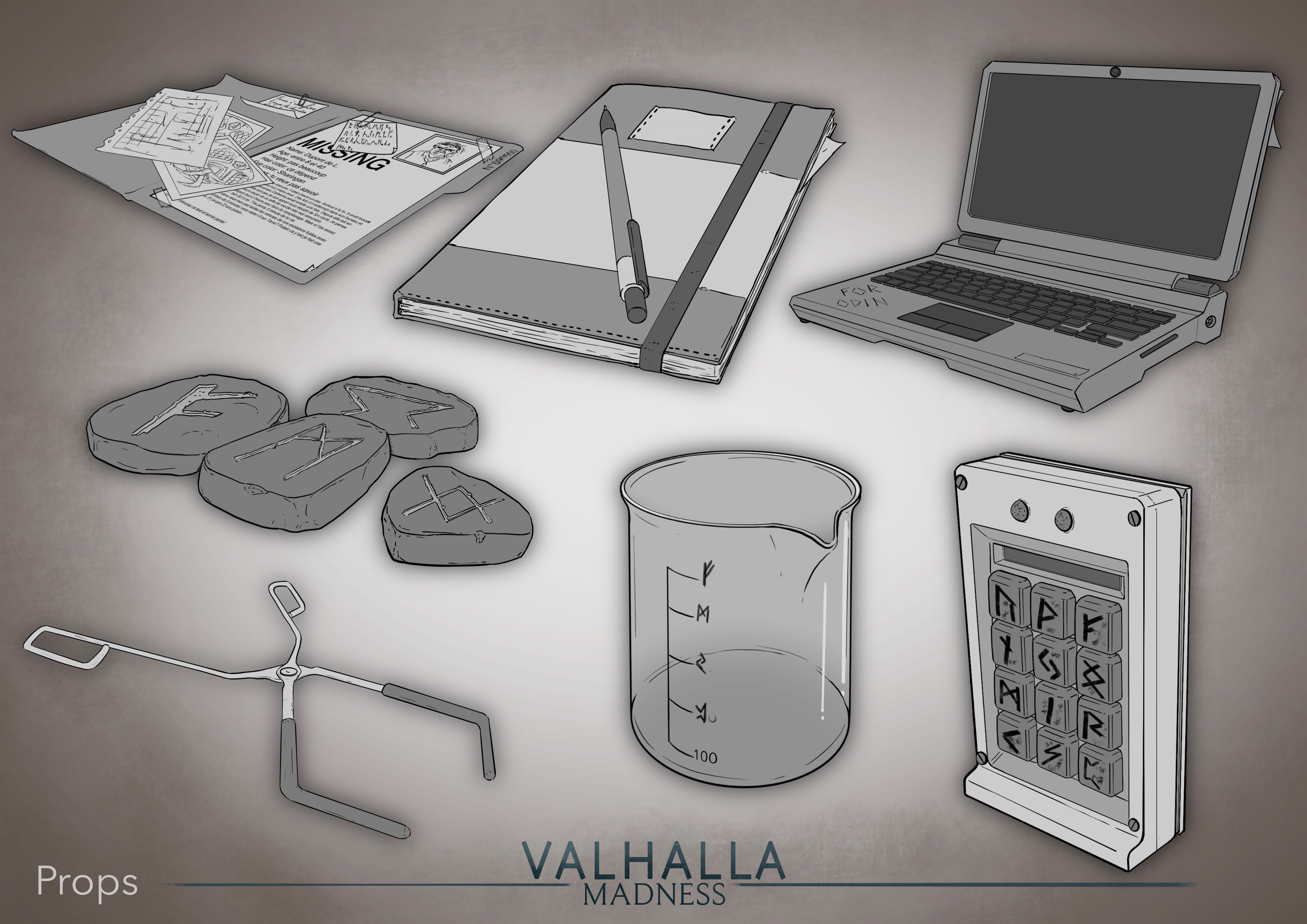 Voici 2 planches de props que j'ai réalisé dans le cadre d'un projet de groupe. Le but était d'imaginer un escape game sur le thème que l'ont voulait. Nous sommes partis sur un escape game où dans lequel les joueurs enquêtent sur la disparition d'un chercheur en archéologie qui s'est intéressé d'un peu trop près aux mythes nordiques.