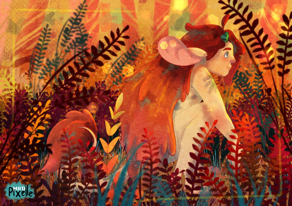 Mon grand regret pour ce dessin c'est de l'avoir speedrun avec des brush pour le paysage à la place de le dessiner comme prévu sur le croquis. Heureusement, le fait d'avoir utilisé ces brush donne un côté motif super agréable au final, comme si c'était une impression textile et que le personnage se promenait dedans.