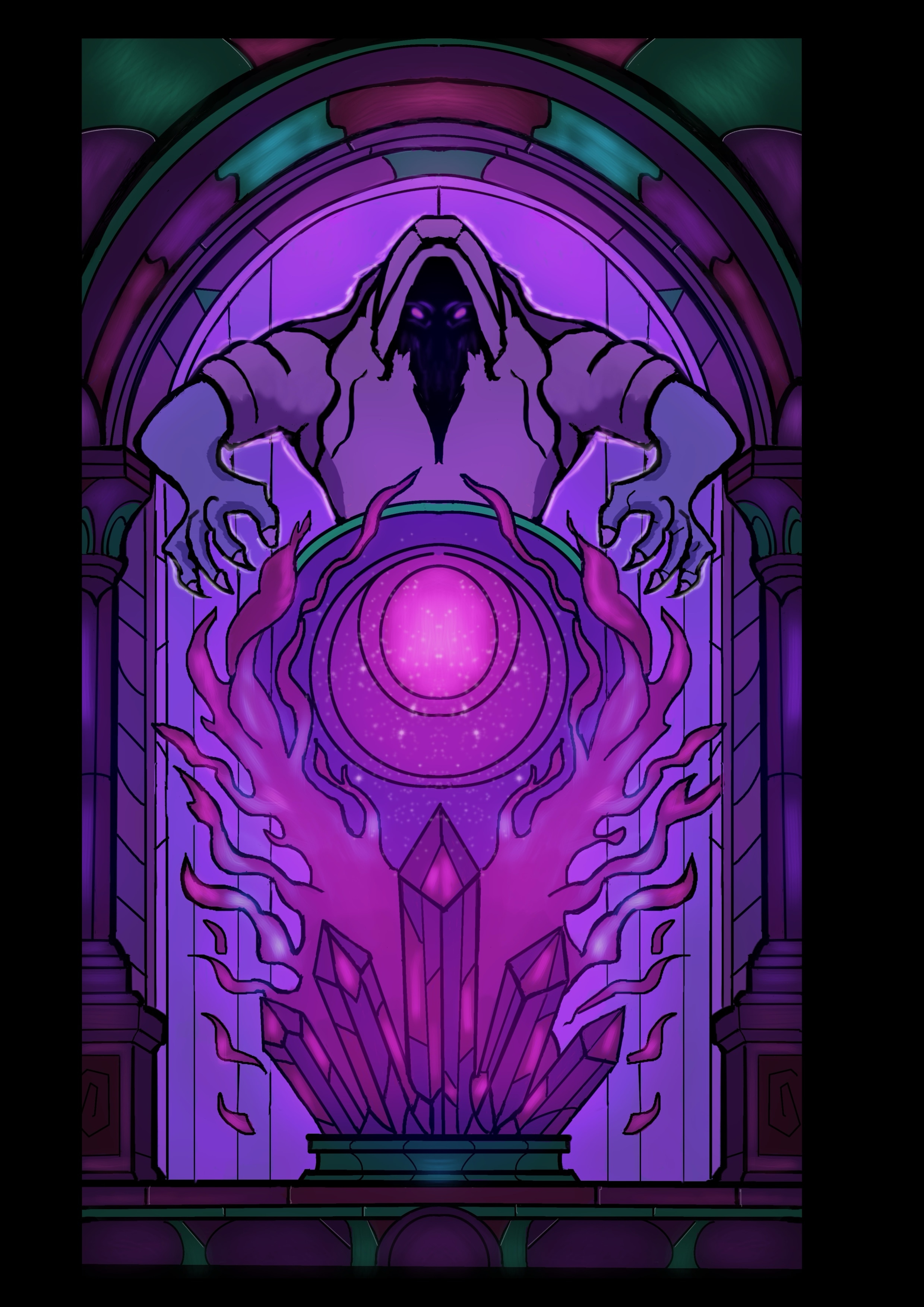 Ici, j’ai voulu représenter l’instant où le Portail du Chaos s’ouvre : une énergie violette brute, instable, presque vivante, jaillit du cristal central.