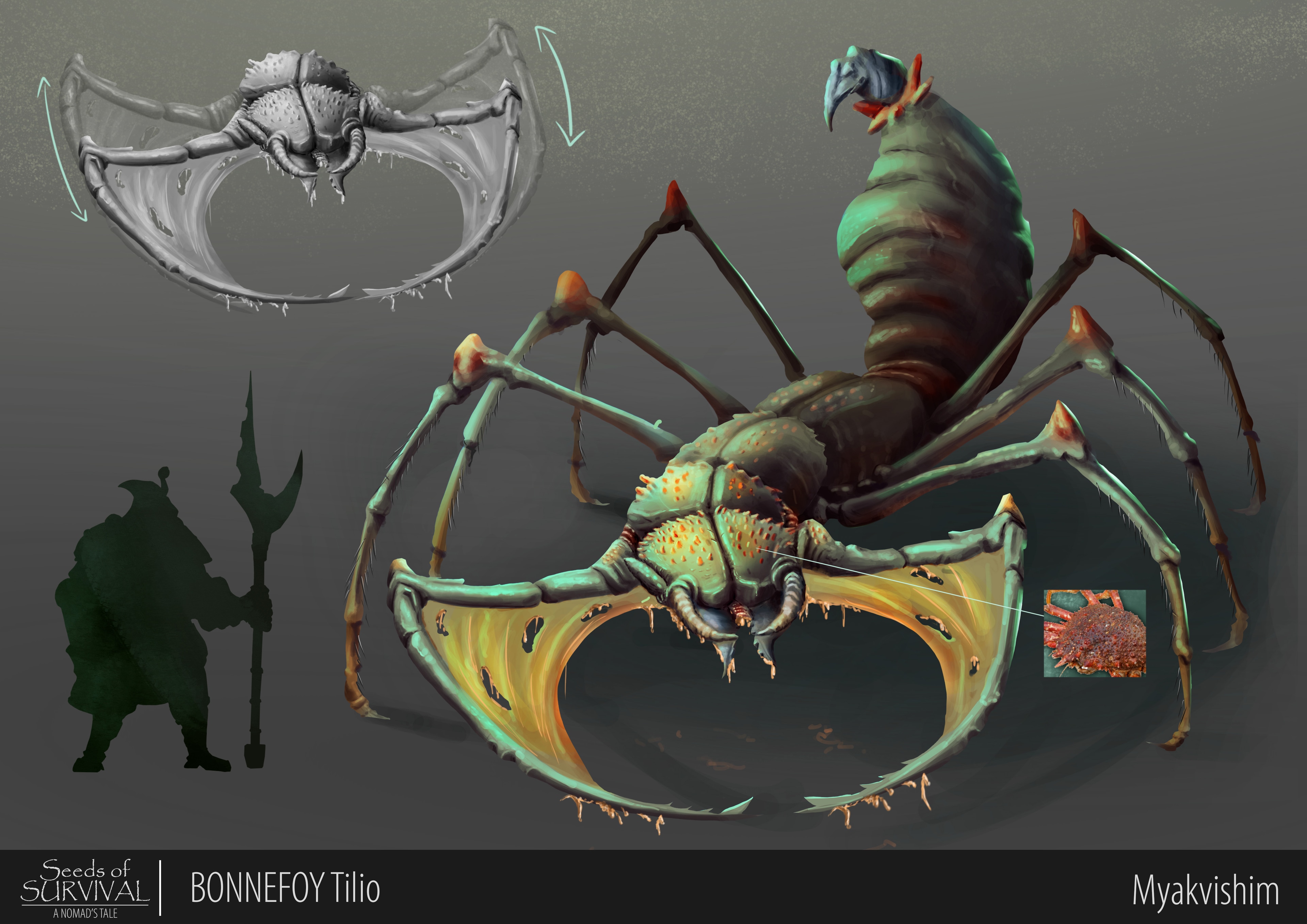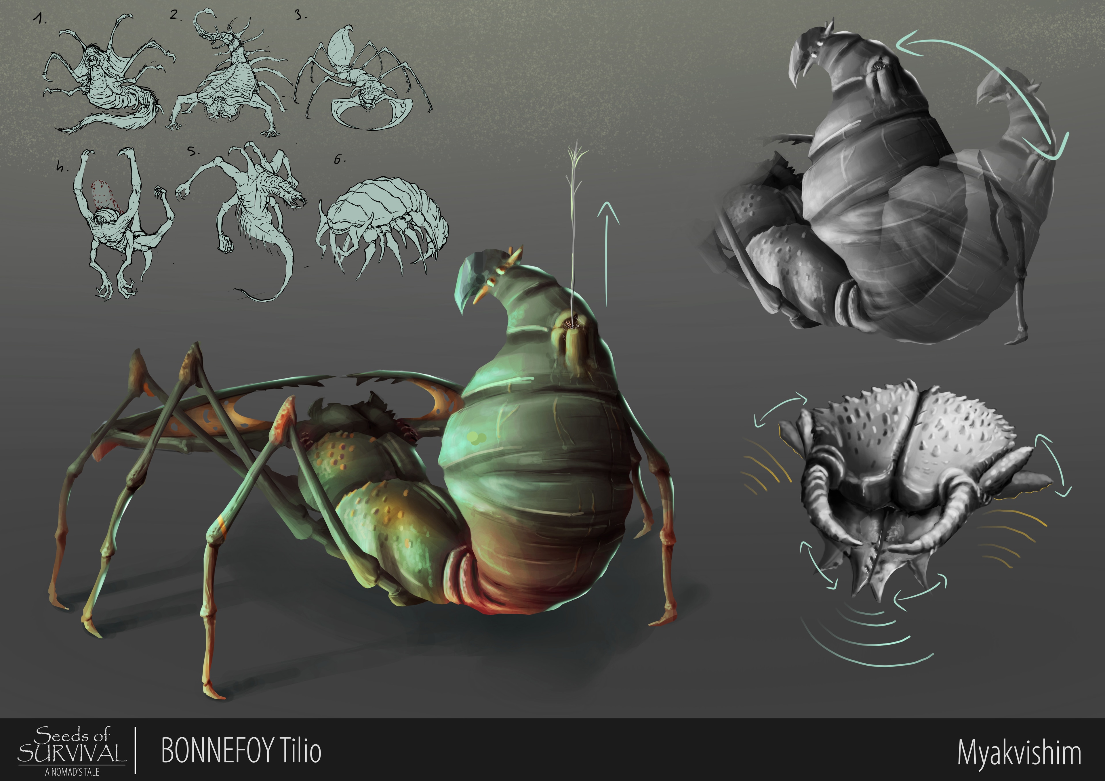 Le but était de créer un petit projet de vis dev pour un jeu vidéo fictif dans un thème fantasy horror. Nous avons créer une tribu de nomades qui traverse une forêt habitée notamment par ce genre de chose. Celui ci est un prédateur vivant à la cime des immenses arbres qui composent cette forêt corrompu. Il descend lentement des arbres sans faire de bruit pour empoissonner sa proie avant de la remonter à l'aide de ses pattes et de ses mandibules qui commencent à faire fondre la victime.