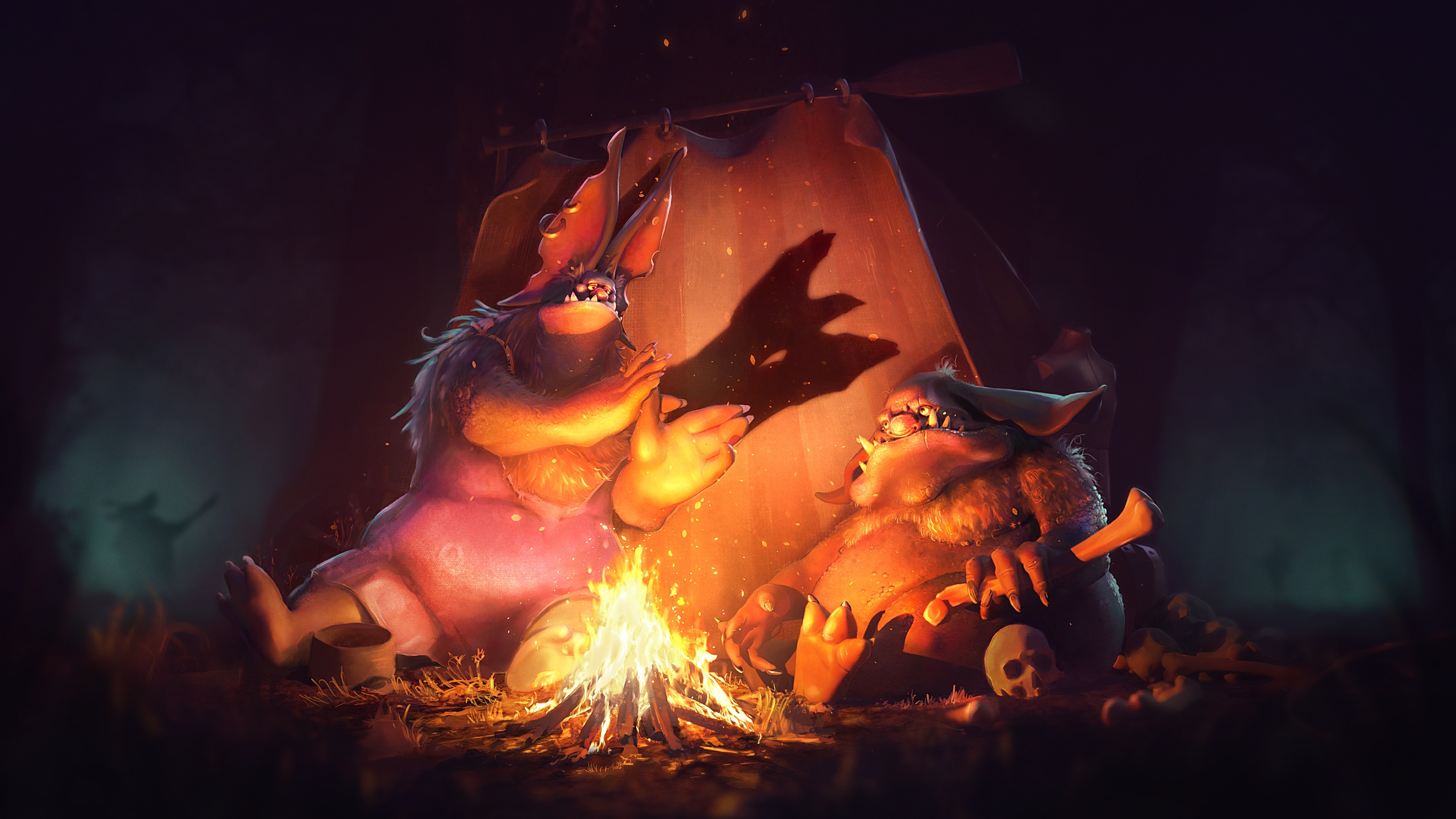 Voici Trollah et Trollbêt, deux frères inséparables : certes assez benêts, mais non moins sensibles. À la nuit tombée, Trollbêt aime raconter ses histoires et ses rêveries au coin du feu, tandis que Trollah digère paisiblement son délicieux repas.