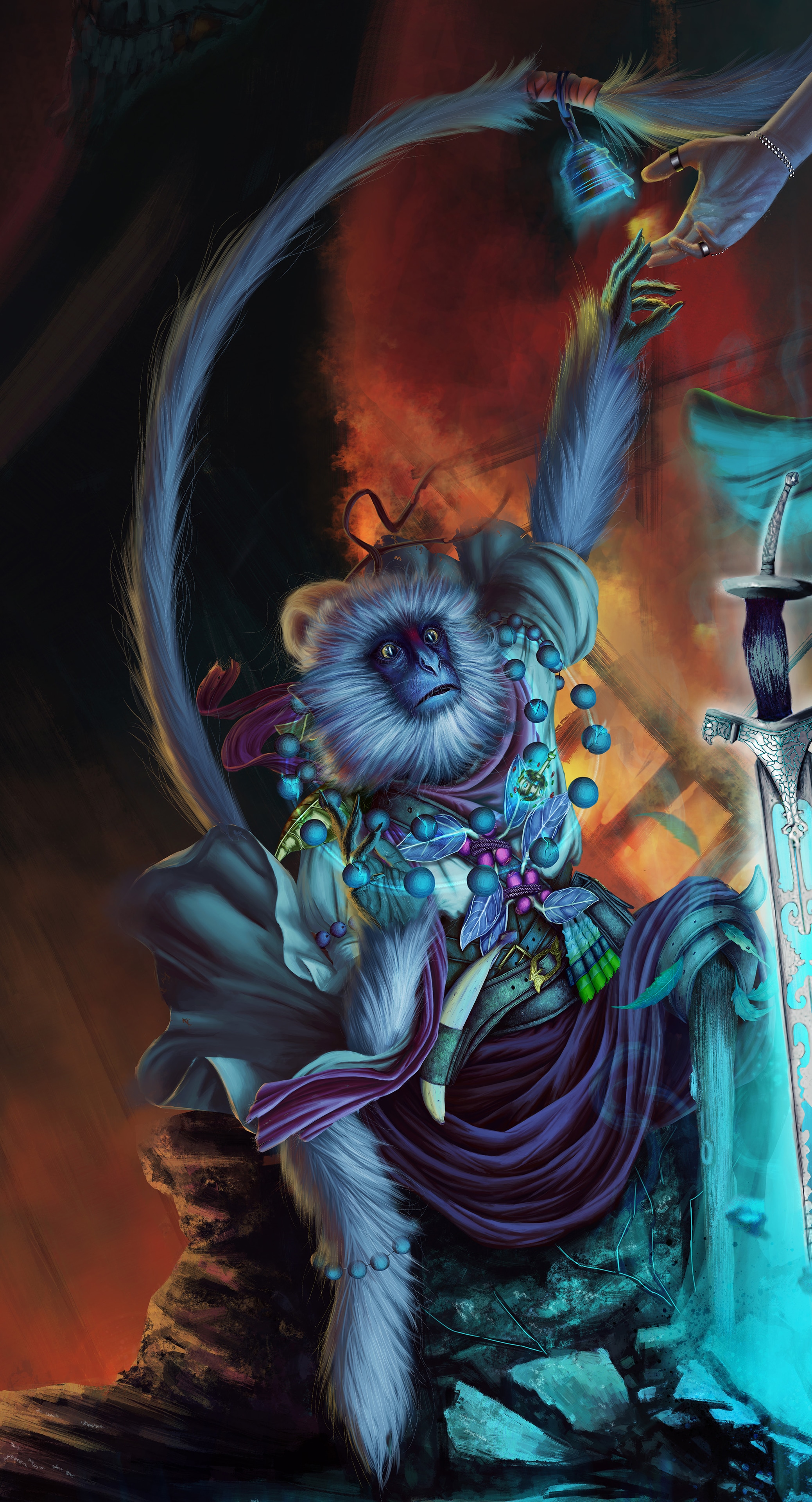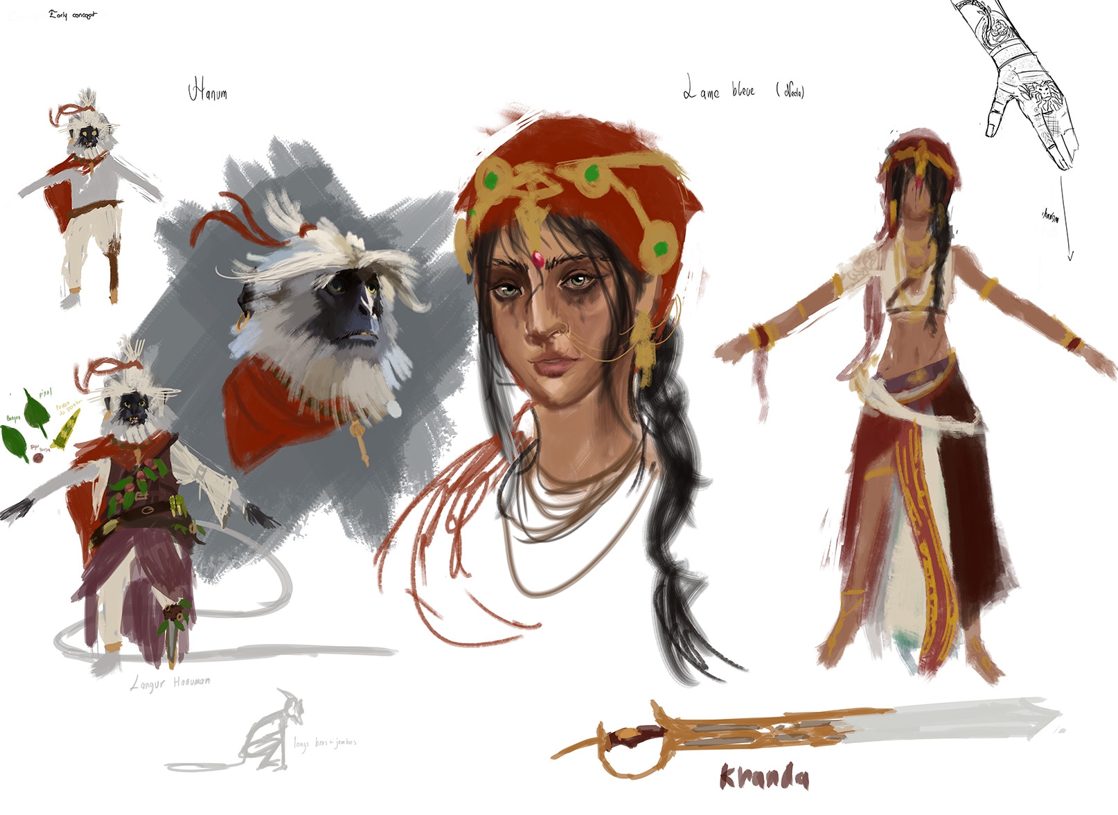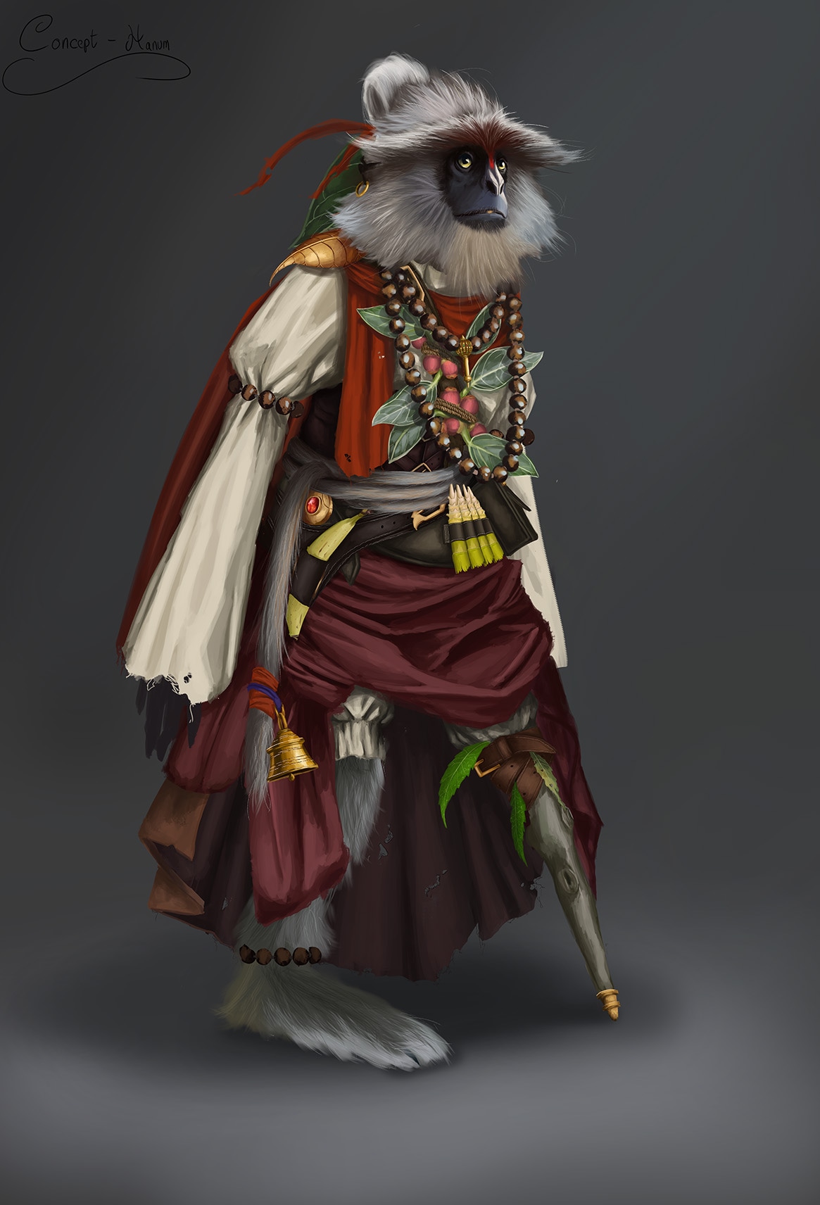 Hanum est un langur hanuman au pelage clair, orné de symboles rituels : une clochette dorée à la queue, un pendentif en forme de sceptre (clin d’œil au gadā d’Hanuman), et des feuilles de neem coincées dans sa ceinture, symbole de guérison et de pureté. Sa jambe de bois rappelle autant sa résilience que sa proximité avec le monde des humains. Il incarne la part spirituelle et instinctive du duo, un compagnon mystique, gardien de la foi oubliée de Neela.