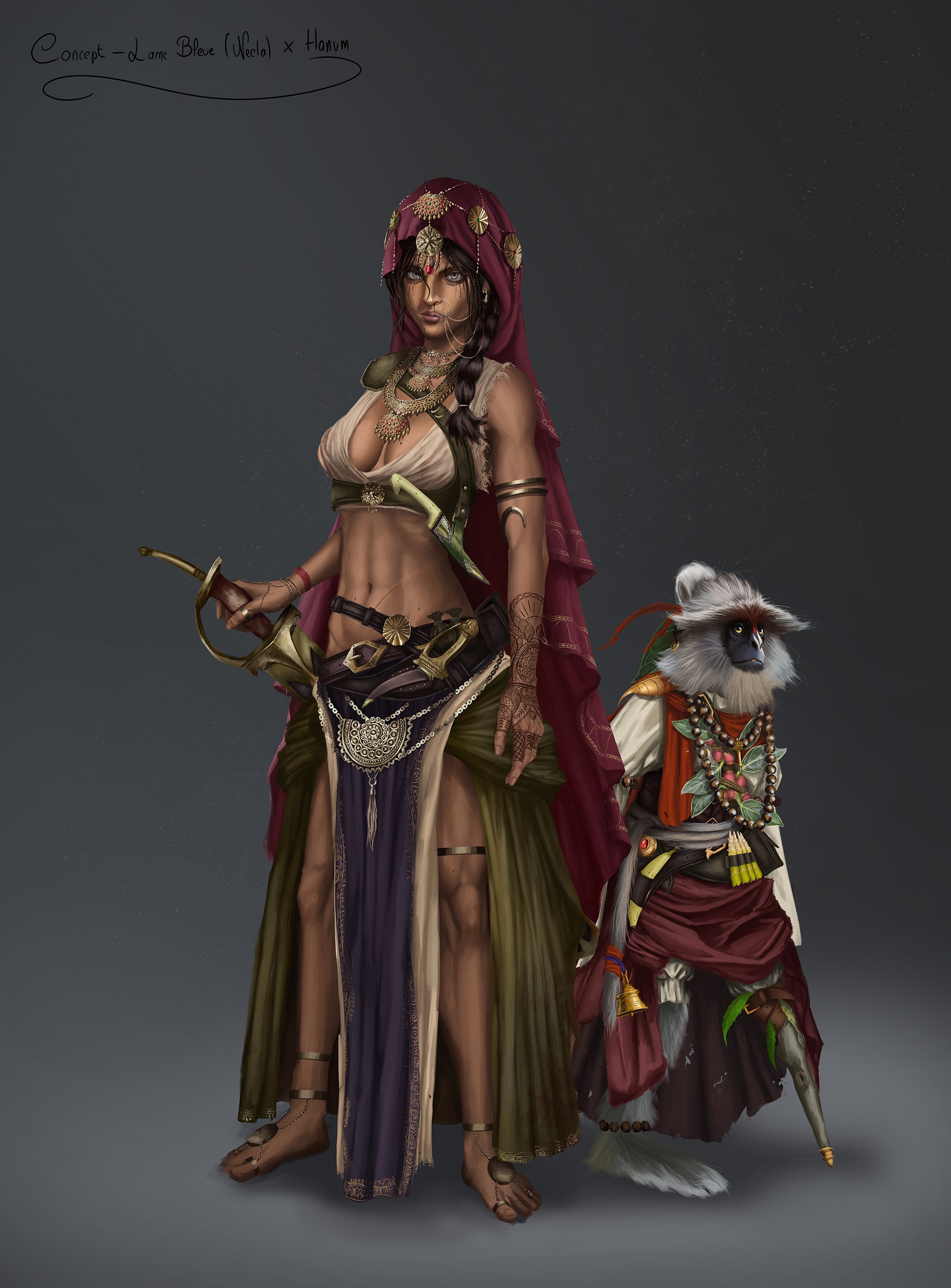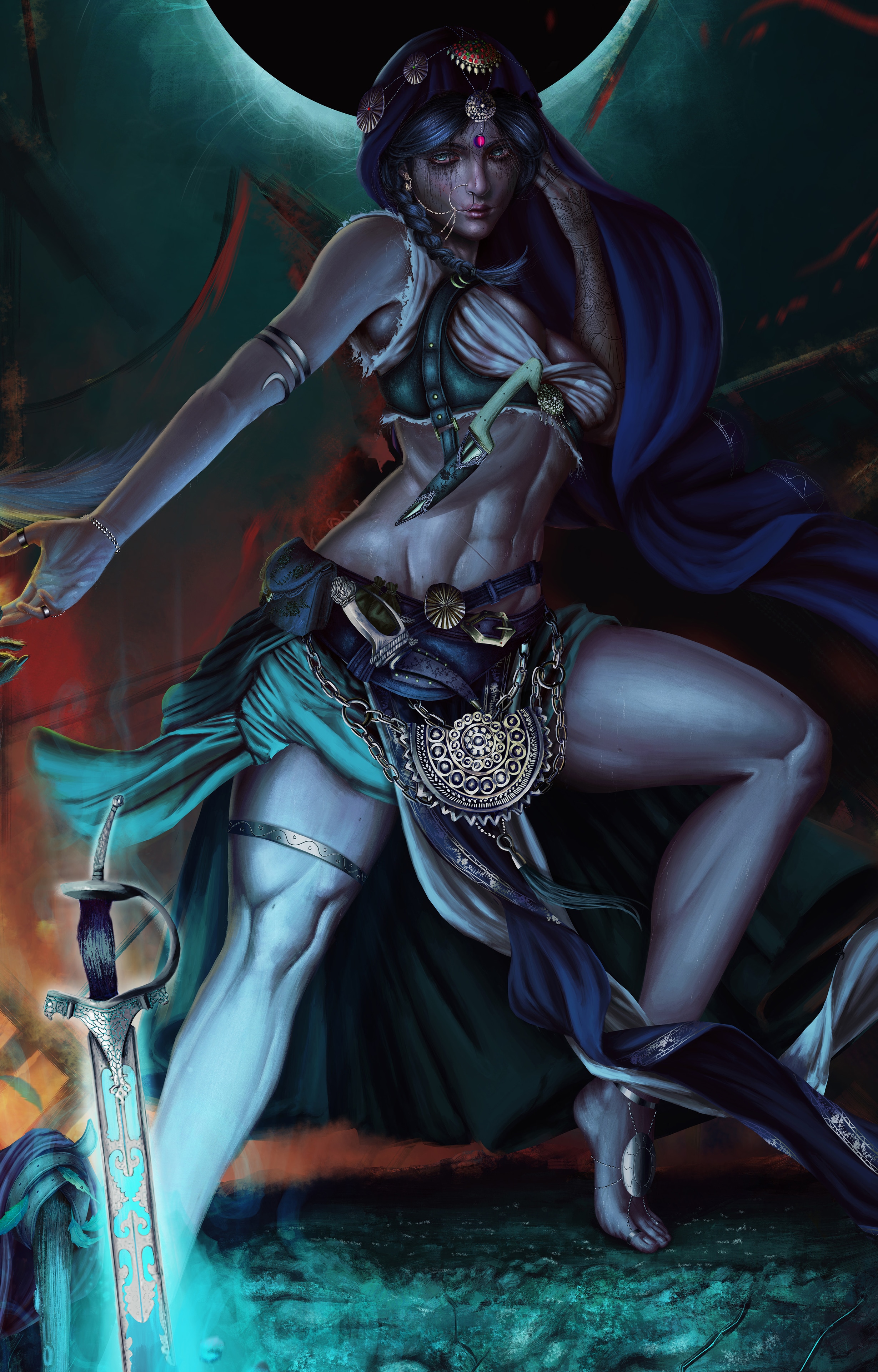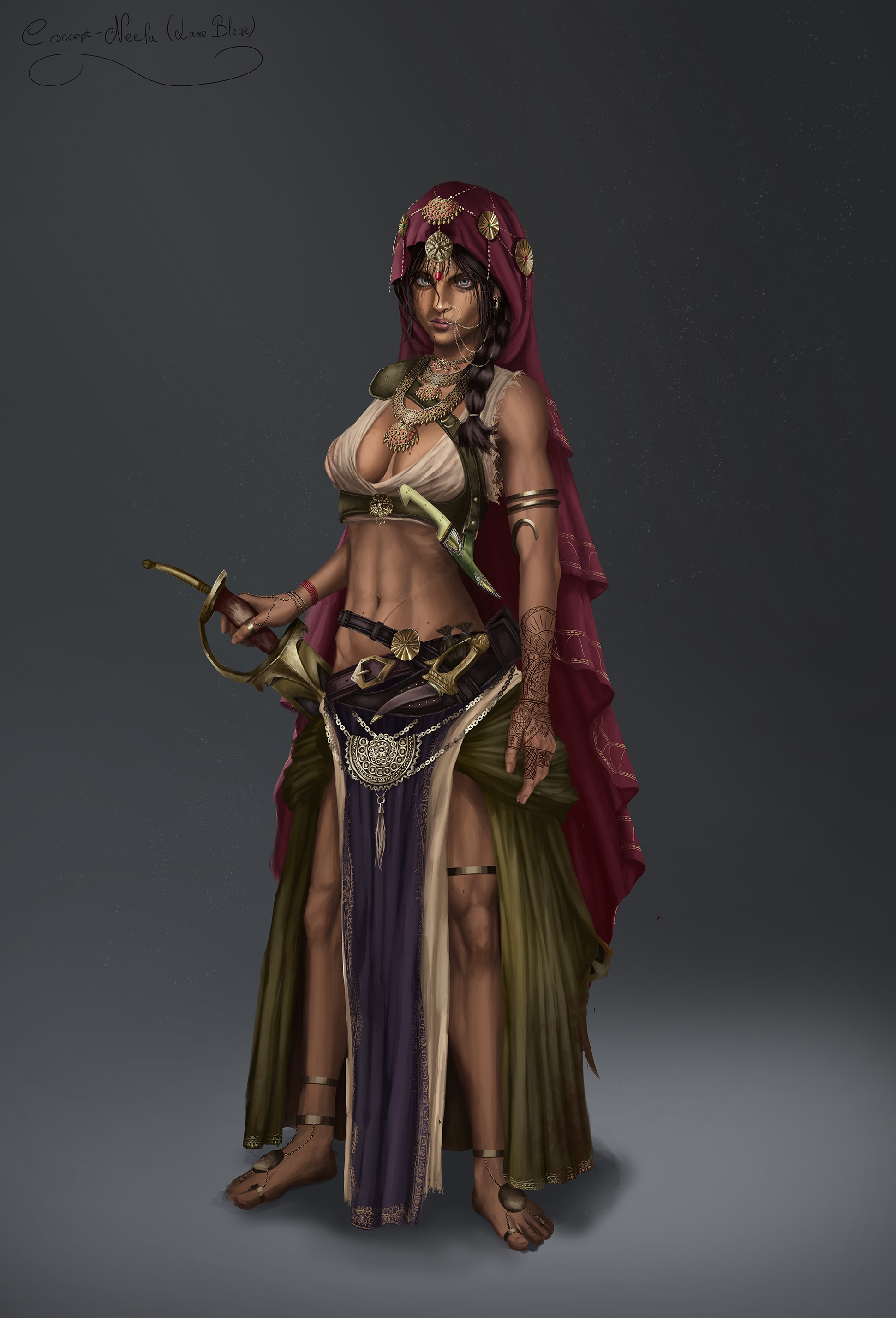 Lame Bleue, de son vrai nom Neela, est une capitaine pirate d’origine indienne. Son apparence s’inspire des ornements indiens traditionnels : bijoux de temple, kamarband revisité, et tissus aux broderies fines, mais désaturés. J’ai voulu que son design exprime à la fois l’élégance, la discipline et la menace, une beauté distante, forgée par la mer et la foi perdue.